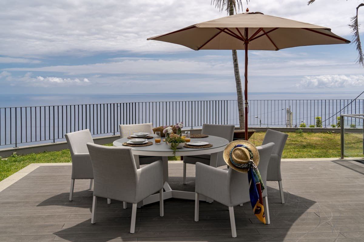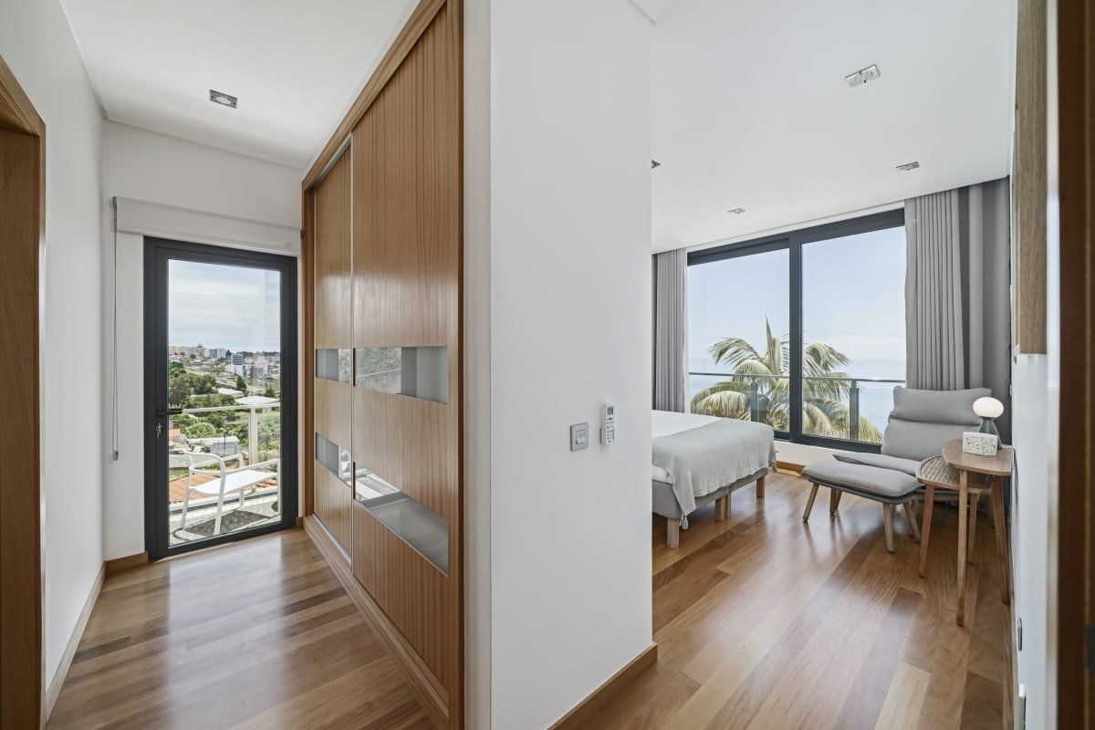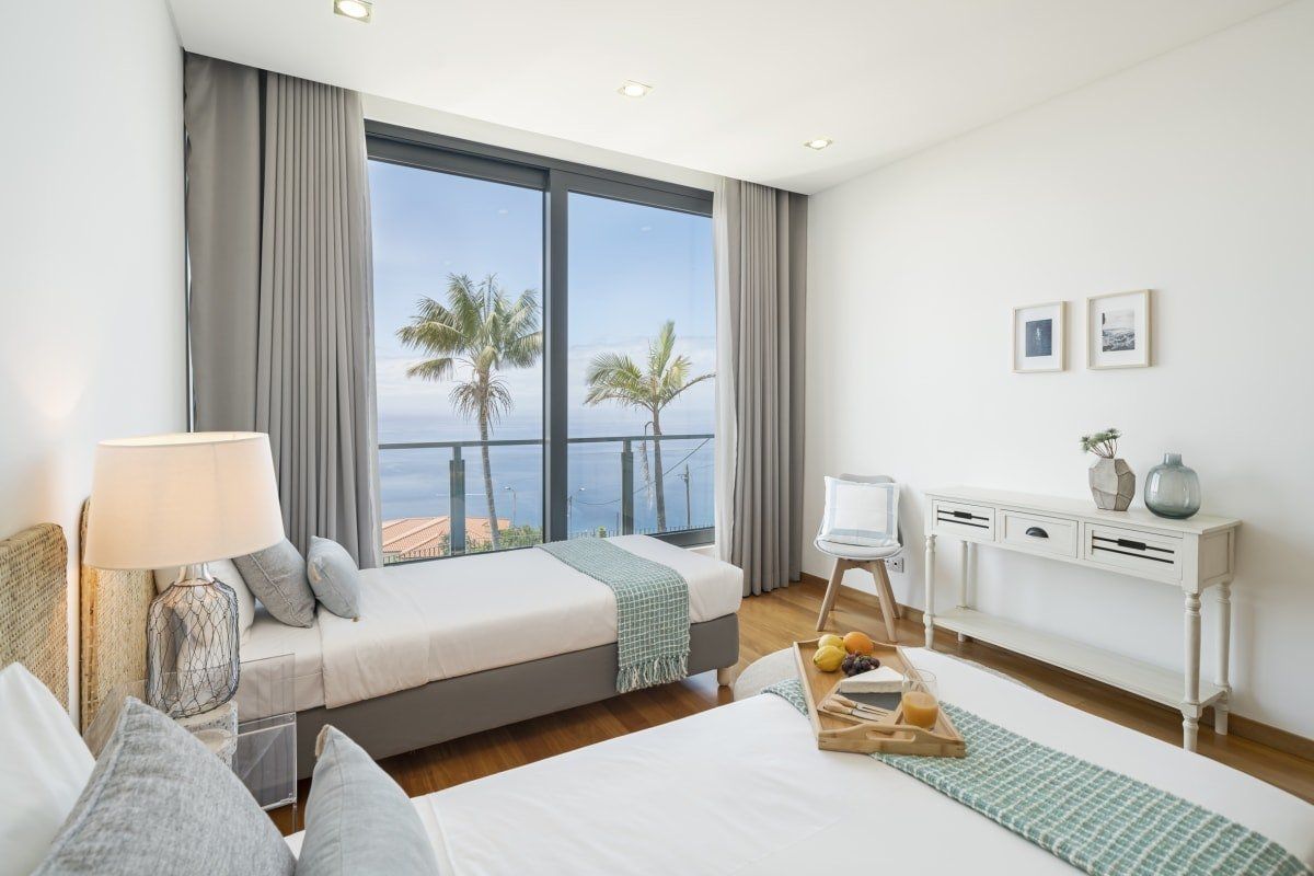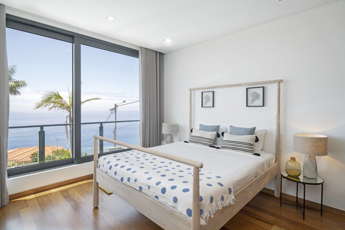 Off the beaten track but close enough to one of Funchal's most prestigious tourist areas to easily access its shops, restaurants and beaches, this detached villa has amazing views. In an elevated position, it looks across some of the area's famous sweeping slopes, down to Praia Formosa and across the glittering ocean. Sleek and modern, the home sits inside a private walled garden and has been cleverly designed to include underground parking. Inside, it's comfortable and stylish, with contemporary furnishings, white walls, wood floors and a subtle hint towards a nautical theme. The living space is bright and sociable, with big doors opening out into the garden, and there's a fully kitted-out kitchen so cooking at home will be a breeze. Upstairs, good size bedrooms benefit from even more impressive views thanks to their floor-to-ceiling windows and there's a balcony for the lucky guests in the master bedroom. Outside you'll find lawned areas, a dining terrace (the perfect spot for a barbecue) and plenty of sun loungers. Here you'll be just a few minutes' drive from the nearest beaches and Funchal city centre is ten minutes by car.