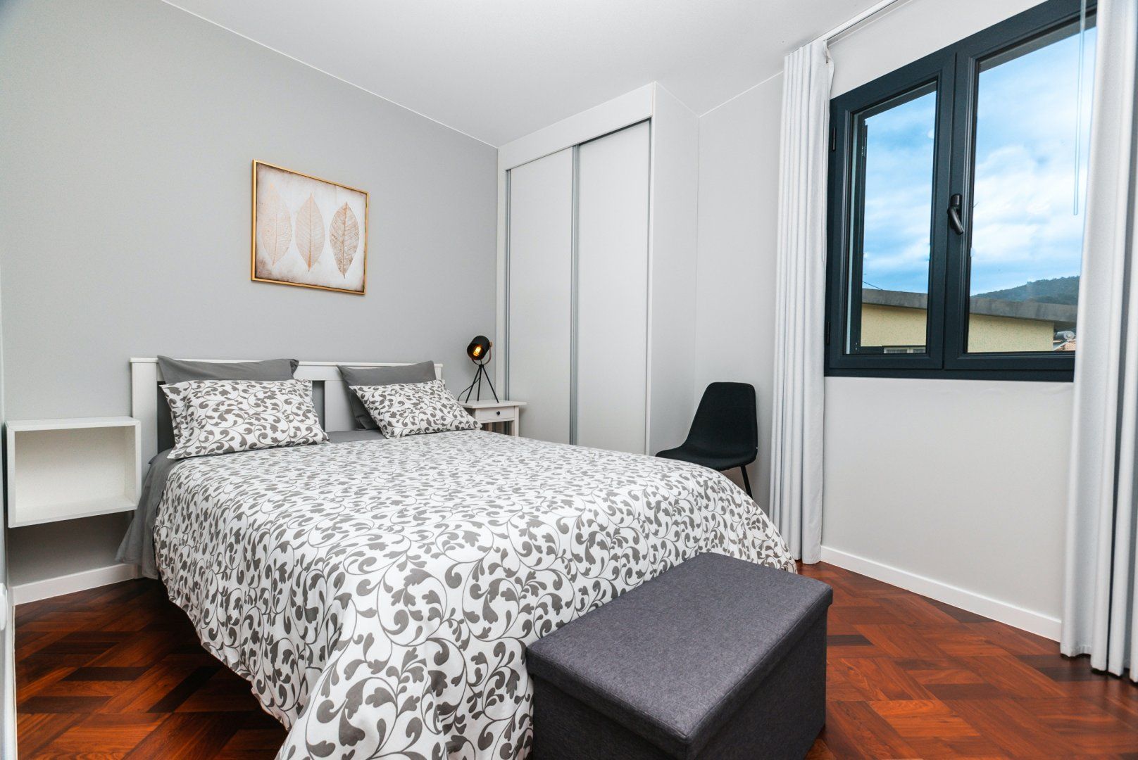 Inside, you’ve got a bigger dining table to spread out for a feast of Picadinho finished with sweet Madeira wine – thanks to a fully-equipped kitchen. There’s a big L-shaped sofa to put your feet up (literally) at the end of the day and, from here, you can admire the view of the towering, green mountains of Madeira from the picture-frame window.