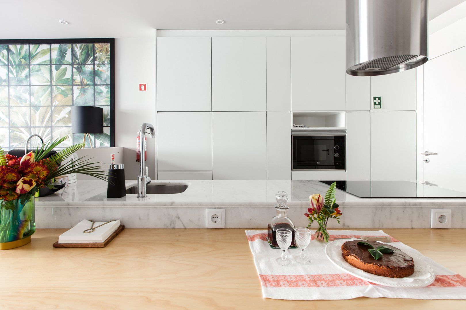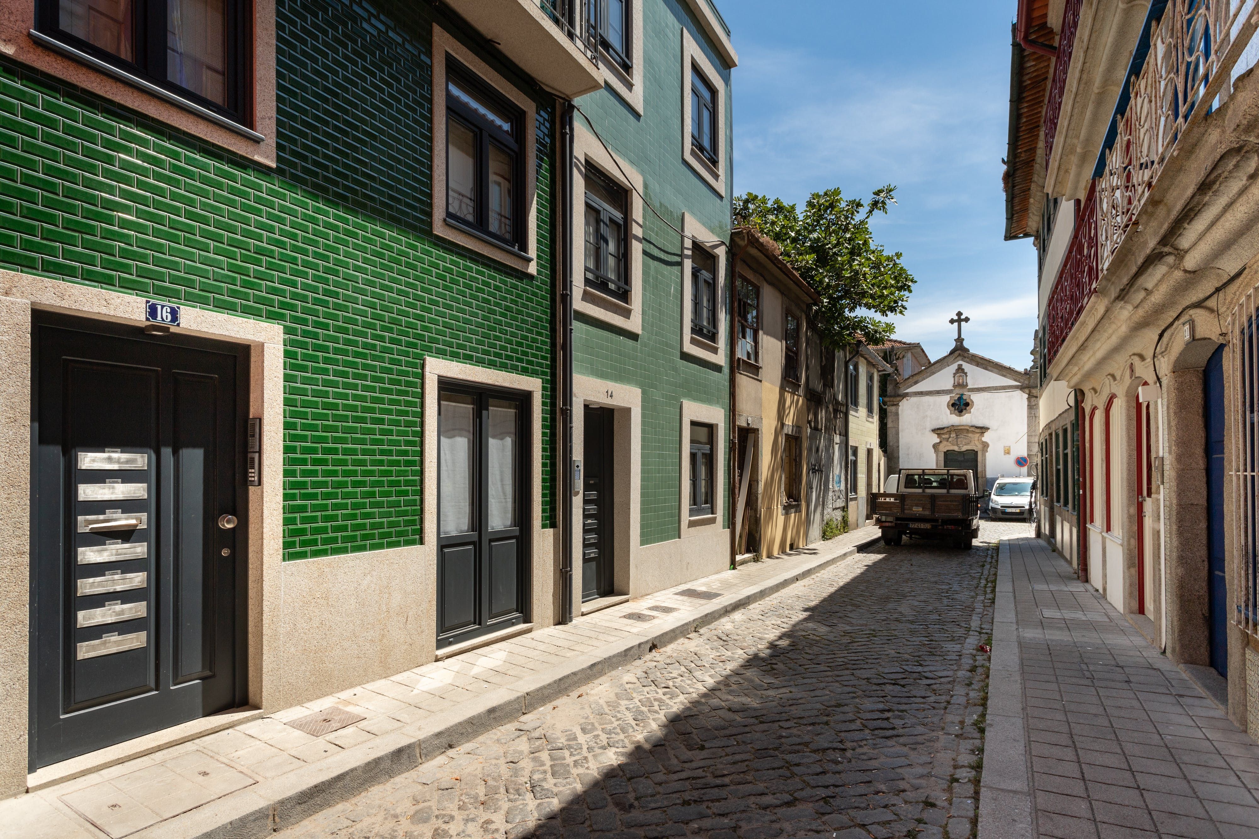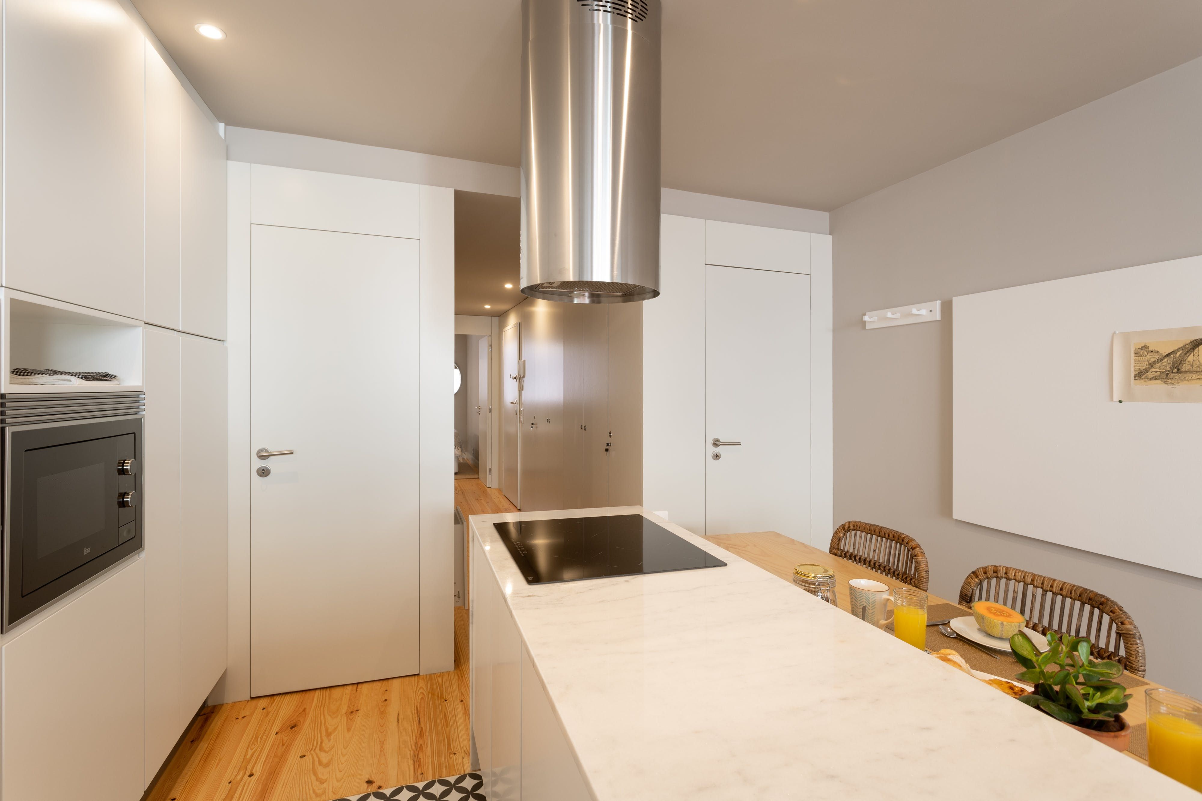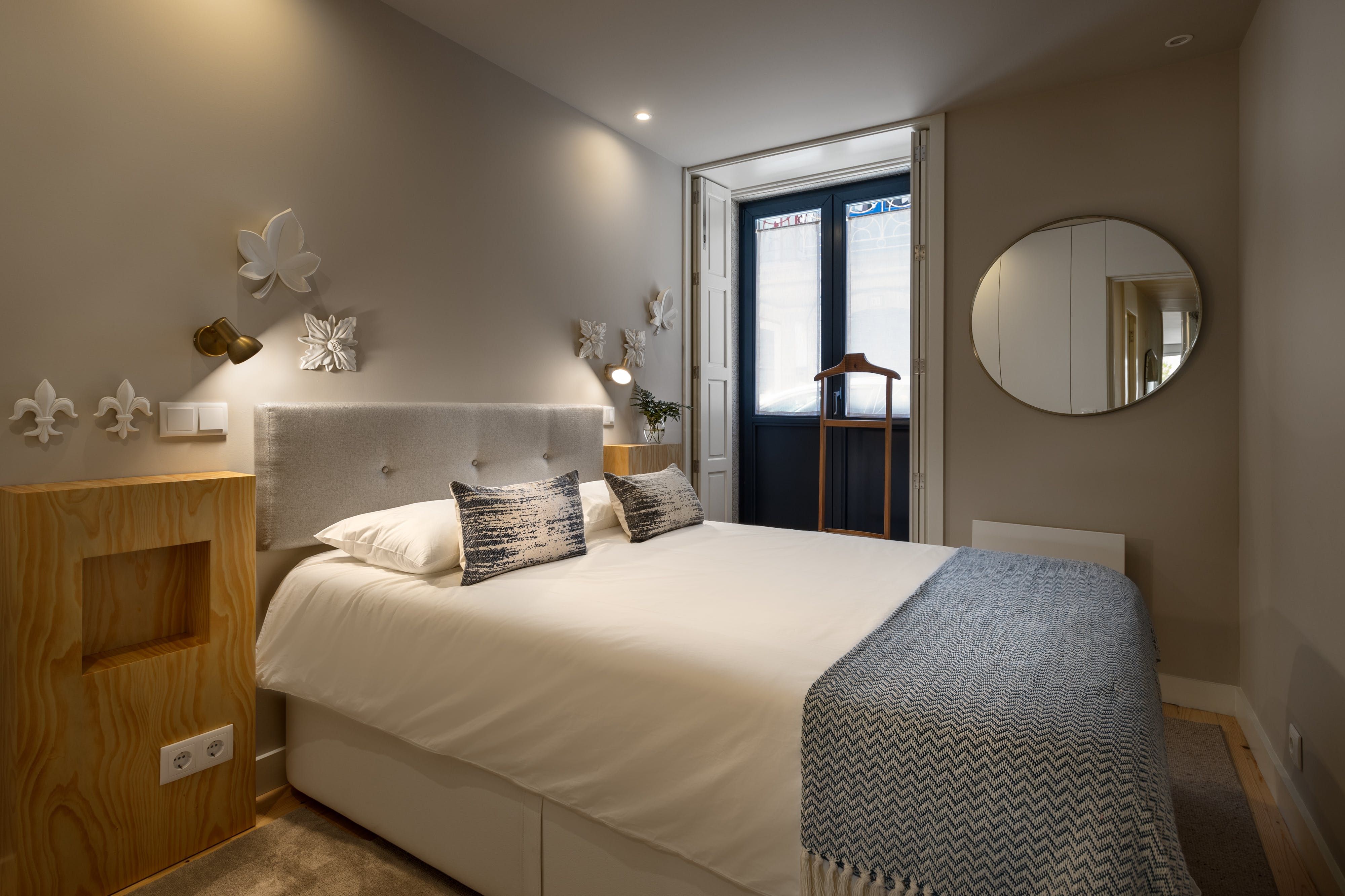 Upon seeing the minimalist kitchen, wooden floors and white walls upon entrance, you could be forgiven for thinking that this home was smart, if lacking in a little personality. However, closer inspection reveals that's far from the case. Out in the two-tiered terrace bordered by a large stone wall — itself a lovely spot to enjoy Porto's magnificent climate — there's a mural taking up one wall that was painted by one of the city's most prolific graffiti artists, Costah. Back inside, there's another collection of more amateur artwork pinned to the wall in the living space, as well as a fetching floral feature wall. All of these personal touches work together to create an apartment that feels both professional and charming. If that's not enough to convince you to stay, the local neighbourhood of Cedofeita is sure to sway you. To the south lie some of the city's most impressive churches, including the Cathedral only fifteen minutes' walk away, while there are plenty of art galleries to wander around in the area around Rua Miguel Bombarda, only eight minutes away on foot.