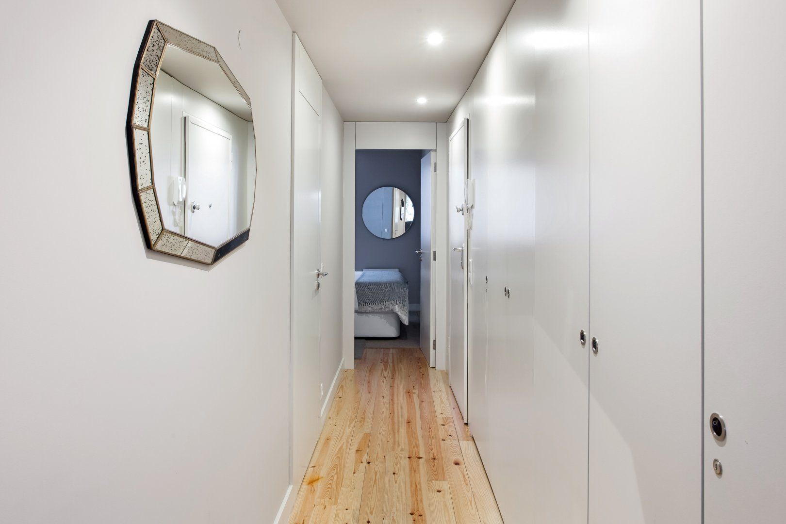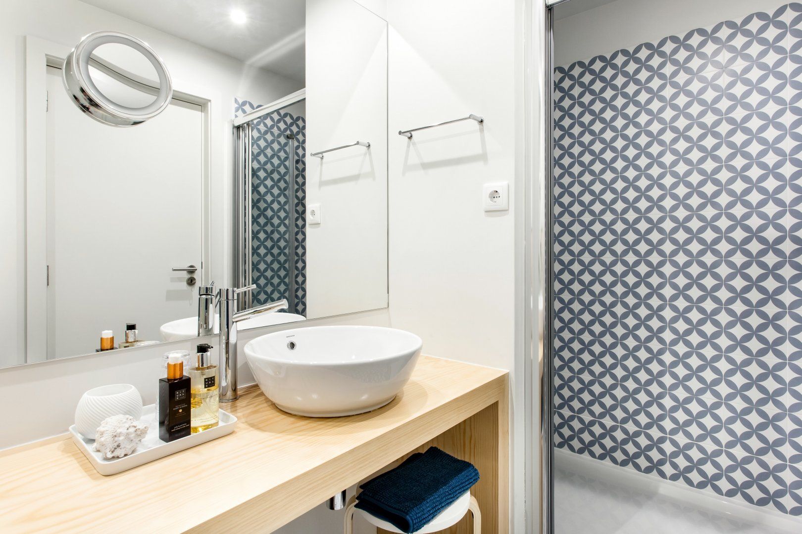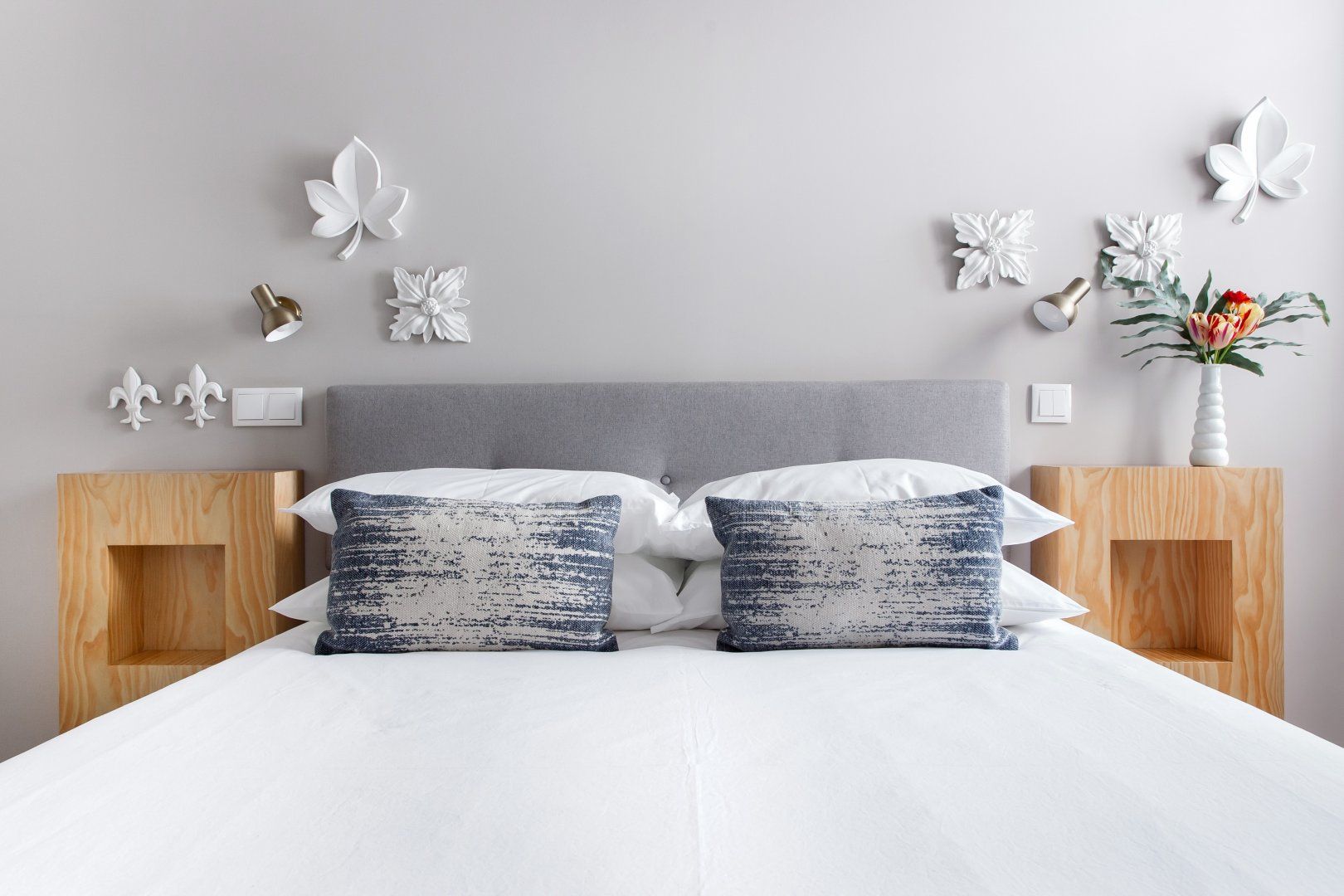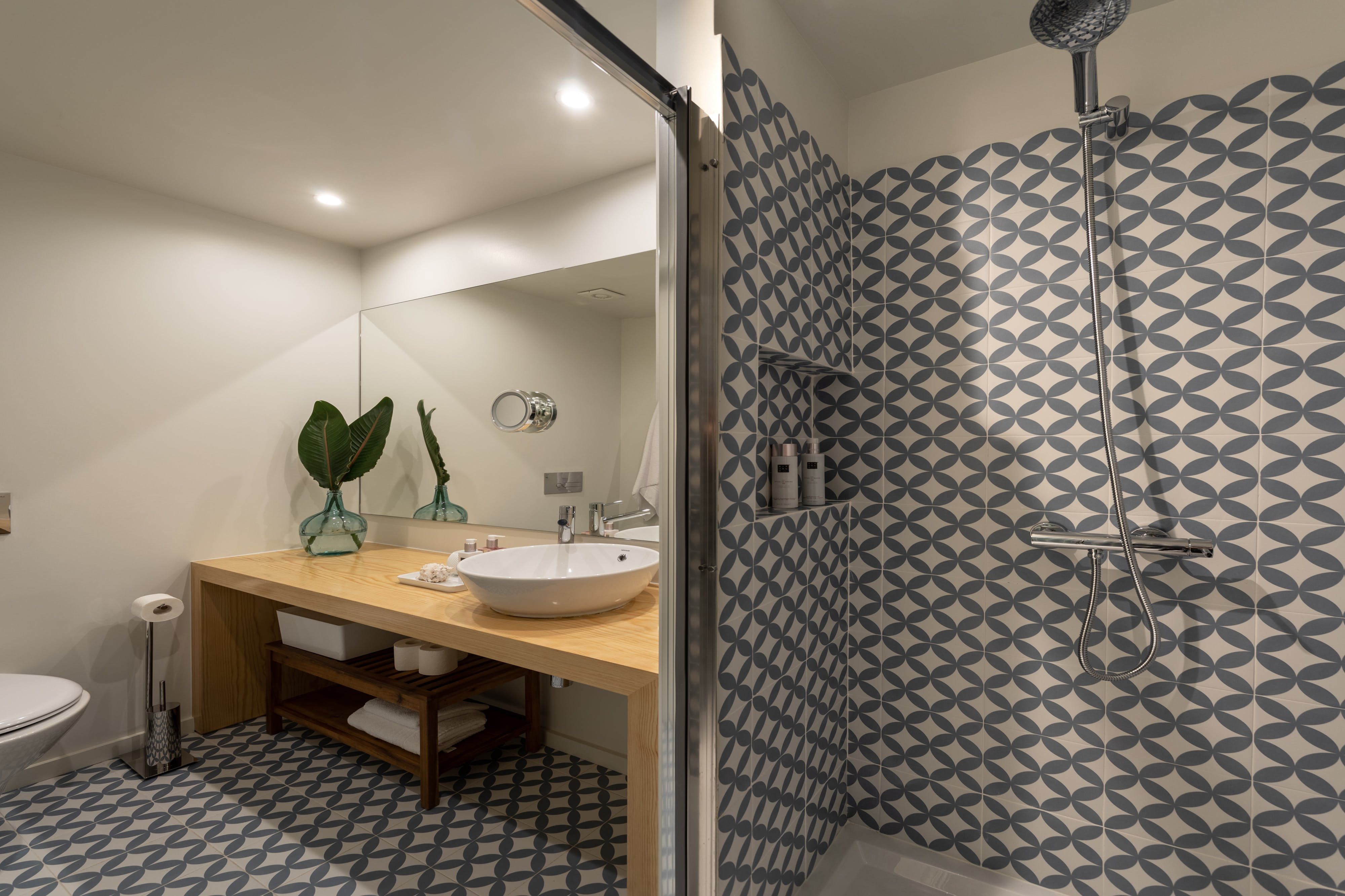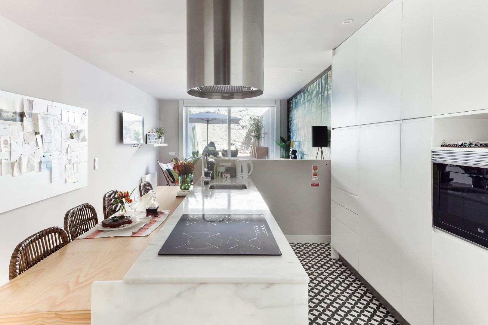 Upon seeing the minimalist kitchen, wooden floors and white walls upon entrance, you could be forgiven for thinking that this home was smart, if lacking in a little personality. However, closer inspection reveals that's far from the case. Out in the two-tiered terrace bordered by a large stone wall — itself a lovely spot to enjoy Porto's magnificent climate — there's a mural taking up one wall that was painted by one of the city's most prolific graffiti artists, Costah. Back inside, there's another collection of more amateur artwork pinned to the wall in the living space, as well as a fetching floral feature wall. All of these personal touches work together to create an apartment that feels both professional and charming. If that's not enough to convince you to stay, the local neighbourhood of Cedofeita is sure to sway you. To the south lie some of the city's most impressive churches, including the Cathedral only fifteen minutes' walk away, while there are plenty of art galleries to wander around in the area around Rua Miguel Bombarda, only eight minutes away on foot.