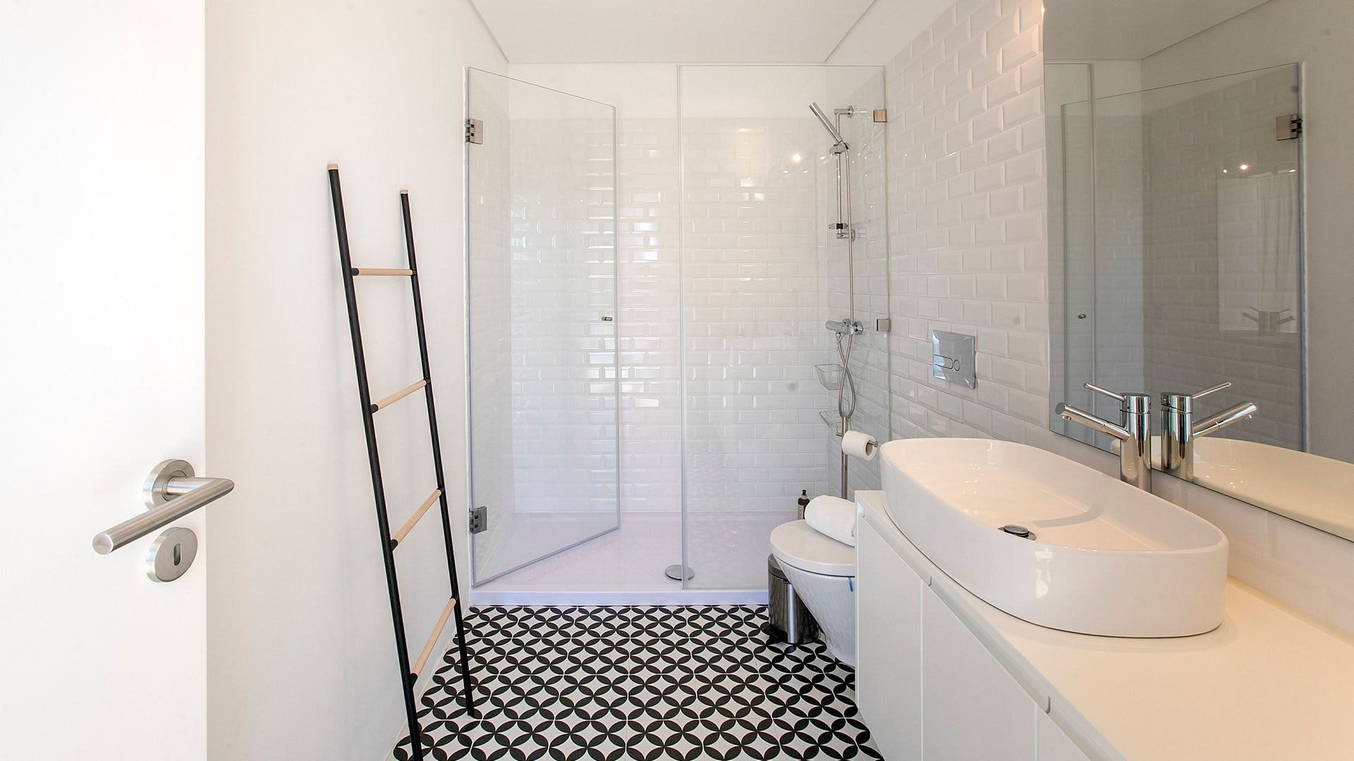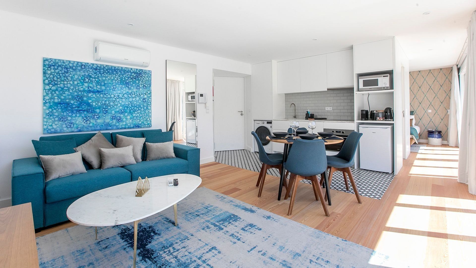 The open-plan living space has a calming ambiance with crisp white walls, natural wood floors, and soothing blue tones – you'll settle in here in no time at all. The bedroom is equally calming and guarantees you a good night's sleep after a day of adventures. But the best part of all has to be the large terrace – slide open the doors and head outside to sip your morning coffee in the sunshine, or enjoy a nightcap in the balmy evening breeze.