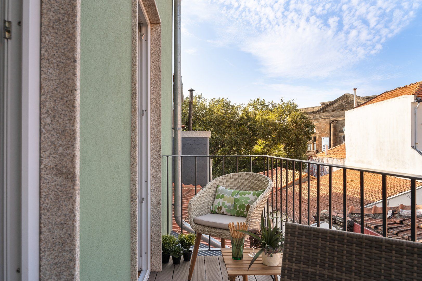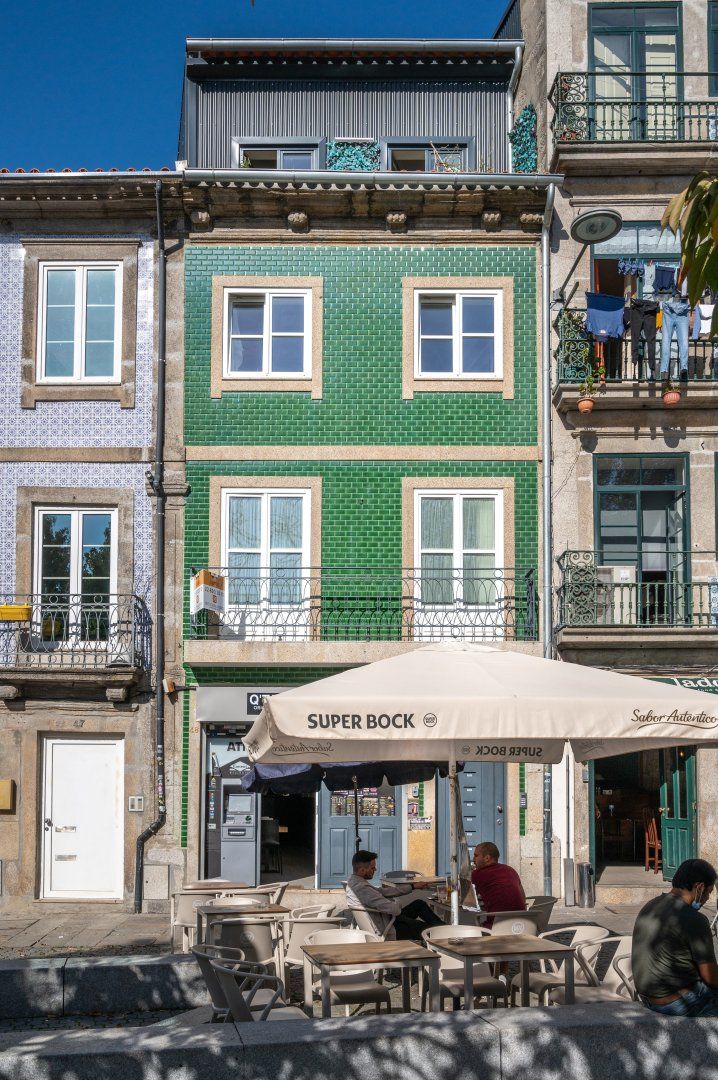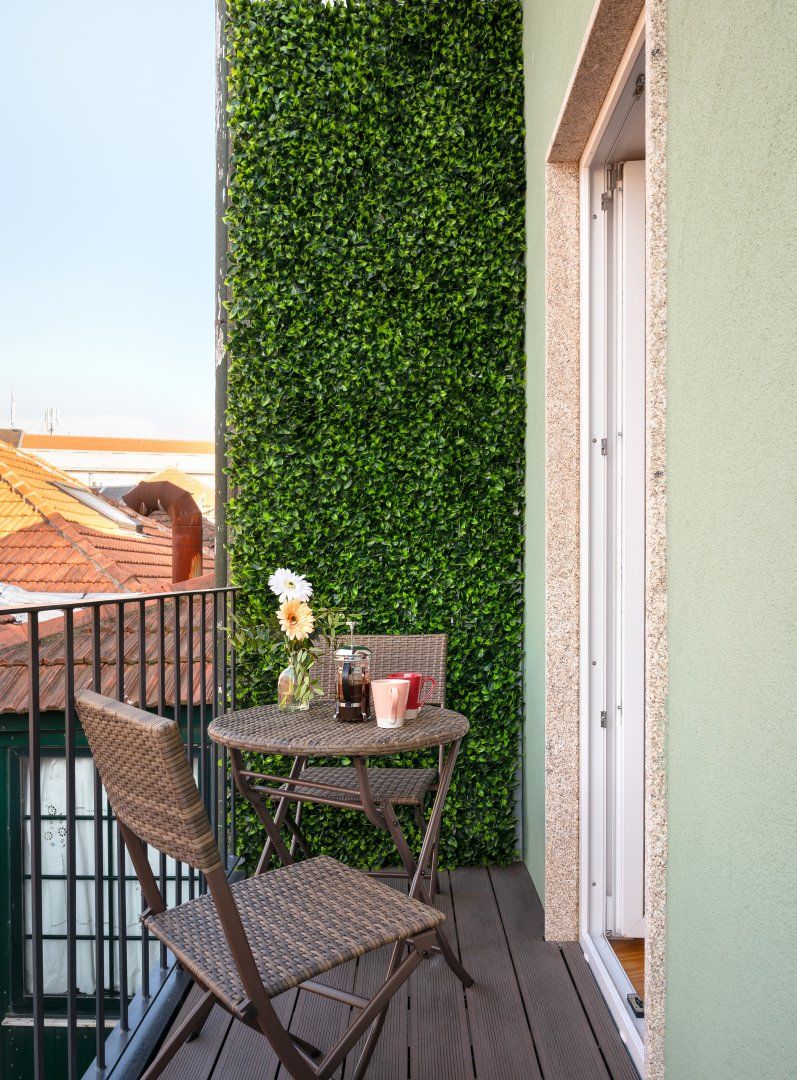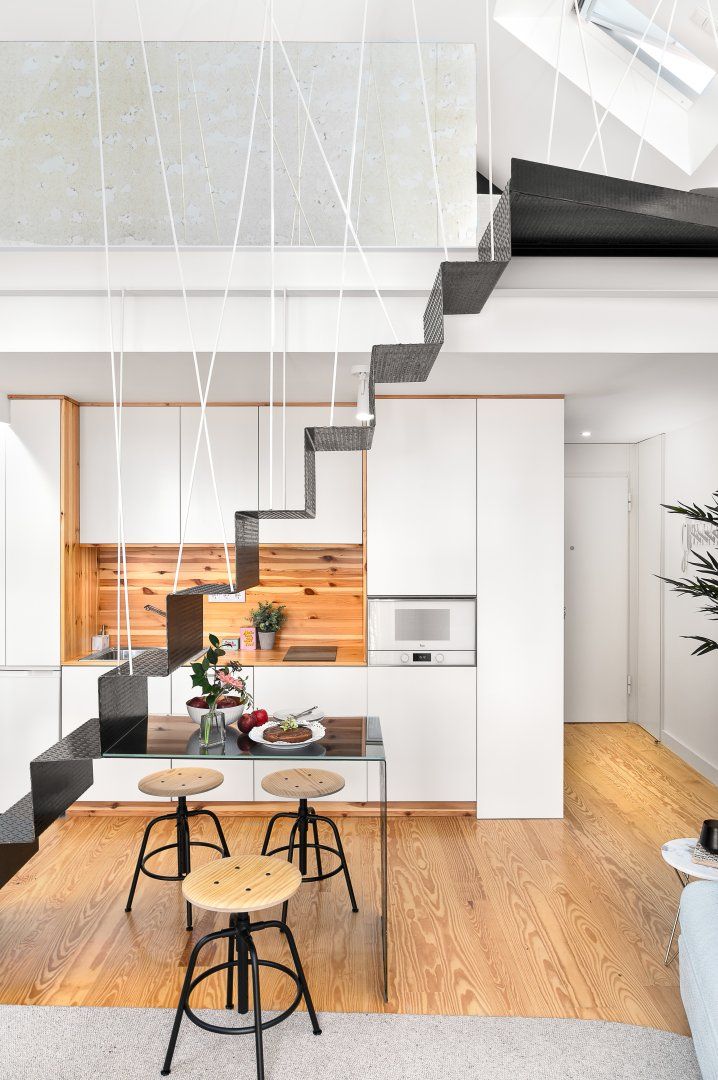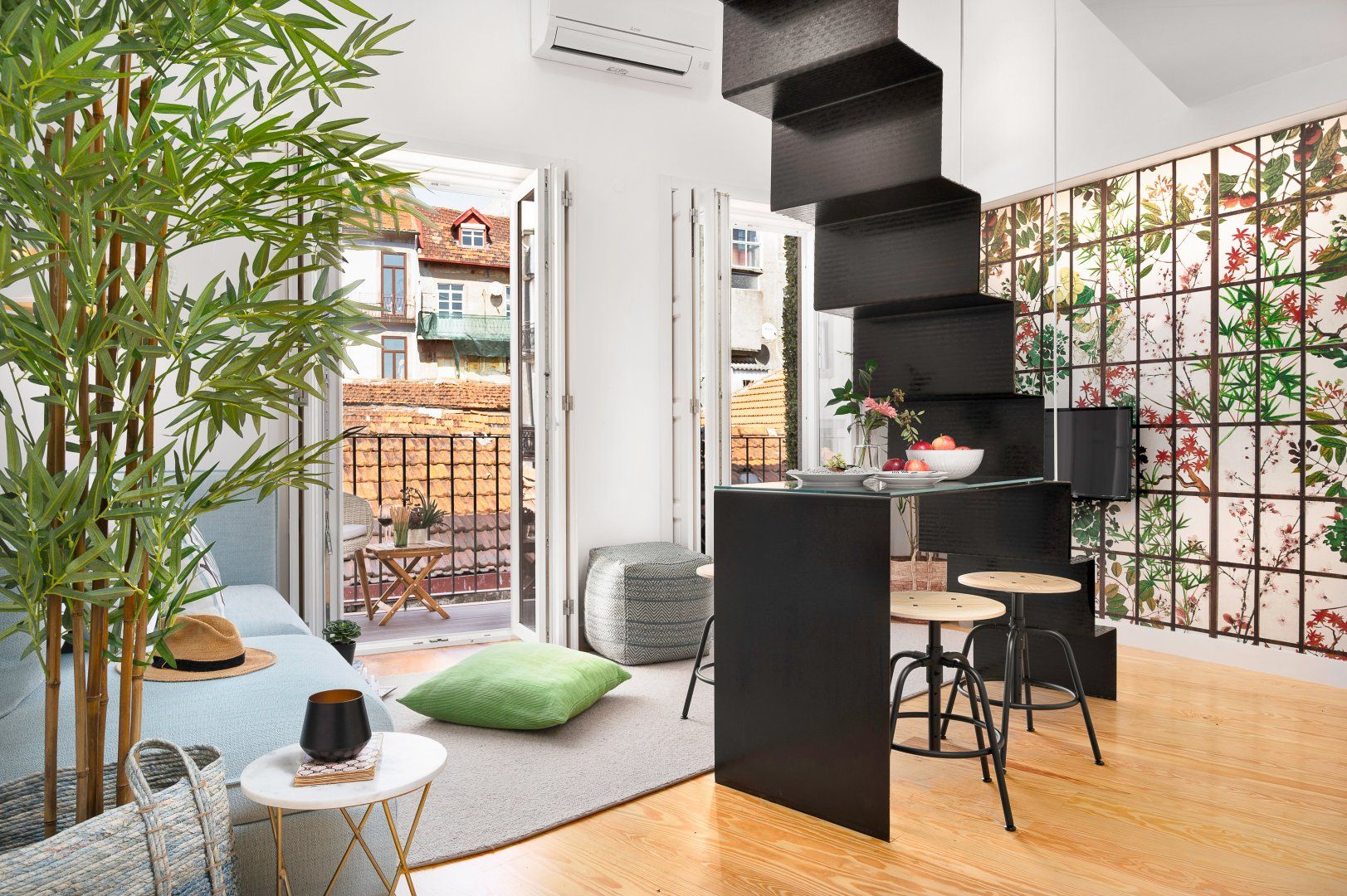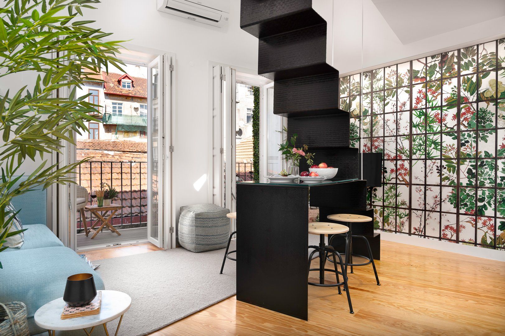 This loft apartment in Porto has been cleverly designed to maximise the amount of space available. The black floating staircase in the middle of the living room could easily dominate the space, but its sleek form lets natural light from the French doors flow around the space well. Similarly, the minimalist dining table is so slim that you can miss it from certain angles. The floral feature wall adds a bit of personality to the interior and works well with the large house plant. The addition of the balcony is particularly welcoming and allows for lovely views of the city's terracotta rooftops. It feels perfectly peaceful up here, but there are lots of famous landmarks nearby. The baroque Igreja do Carmo is two minutes' walk around the corner, while the equally impressive Palácio da Bolsa can be reached in ten.