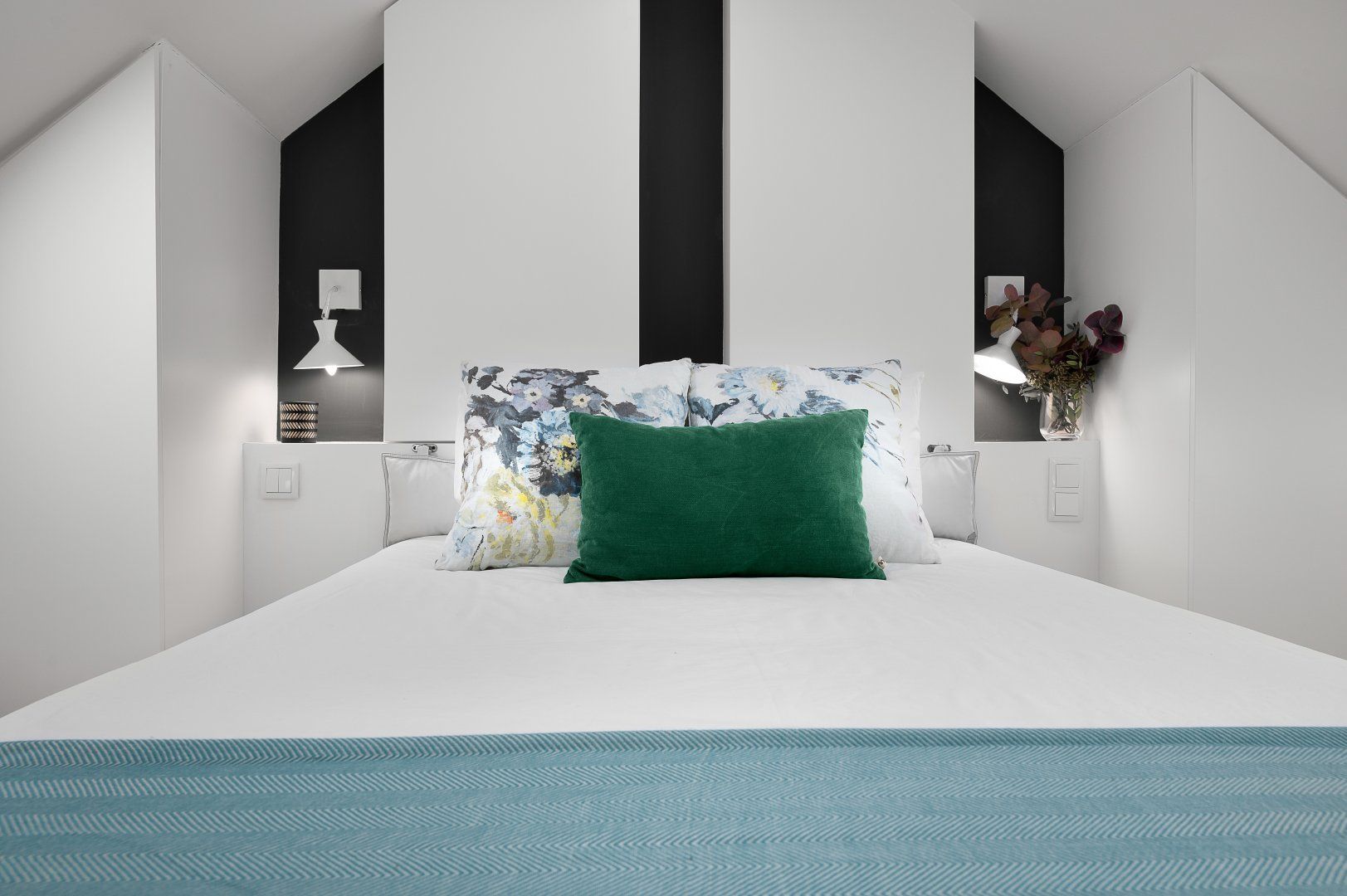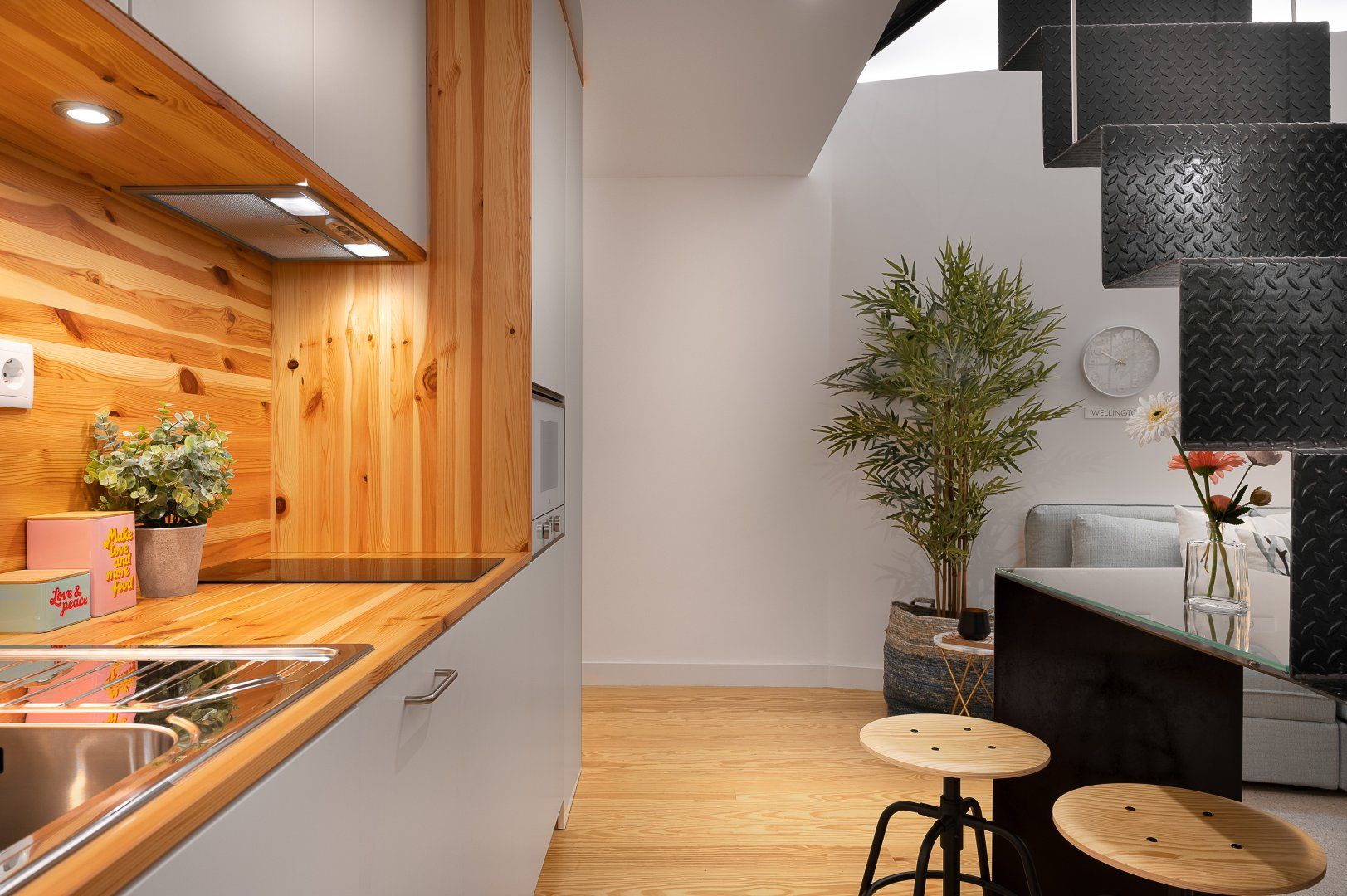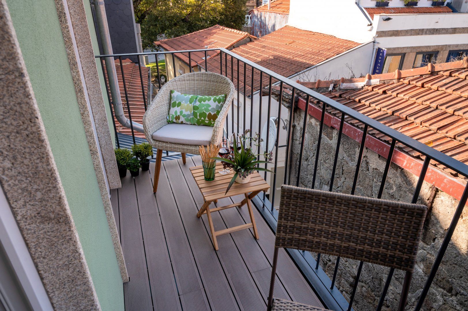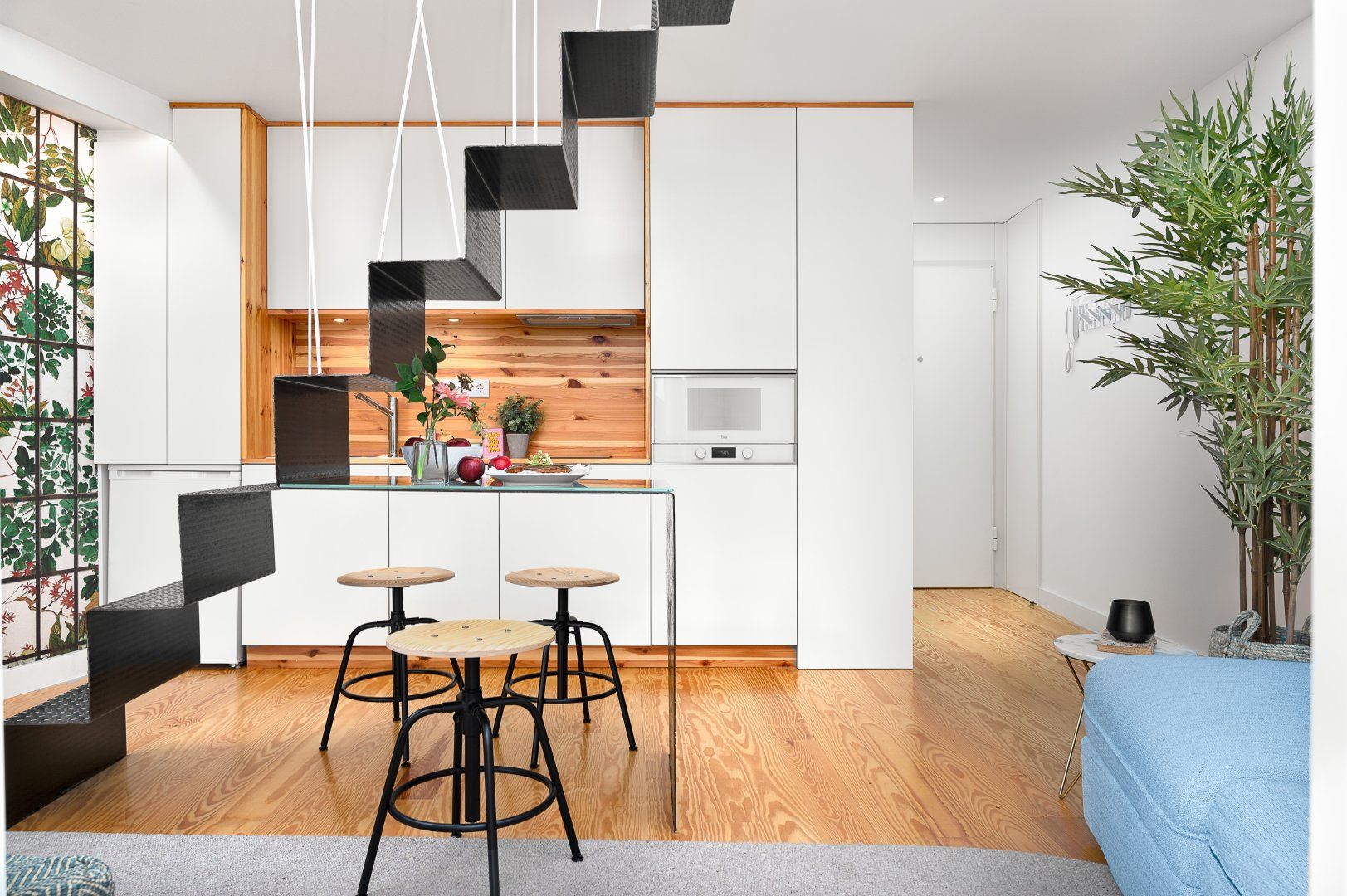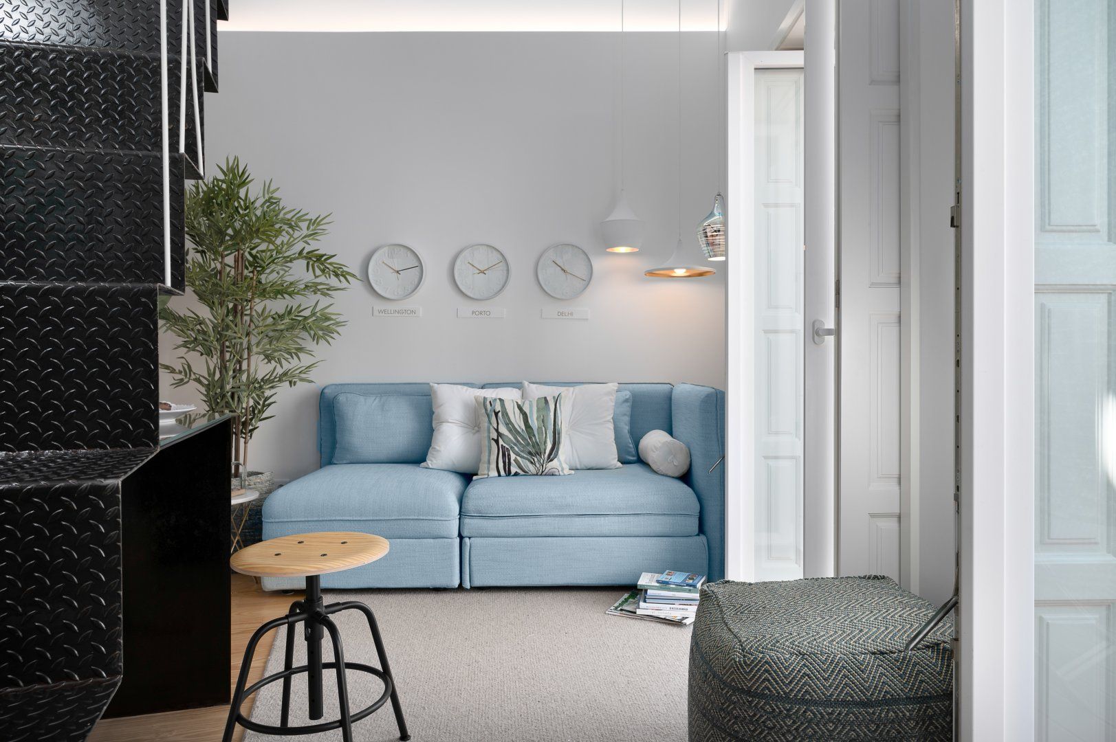 This loft apartment in Porto has been cleverly designed to maximise the amount of space available. The black floating staircase in the middle of the living room could easily dominate the space, but its sleek form lets natural light from the French doors flow around the space well. Similarly, the minimalist dining table is so slim that you can miss it from certain angles. The floral feature wall adds a bit of personality to the interior and works well with the large house plant. The addition of the balcony is particularly welcoming and allows for lovely views of the city's terracotta rooftops. It feels perfectly peaceful up here, but there are lots of famous landmarks nearby. The baroque Igreja do Carmo is two minutes' walk around the corner, while the equally impressive Palácio da Bolsa can be reached in ten.