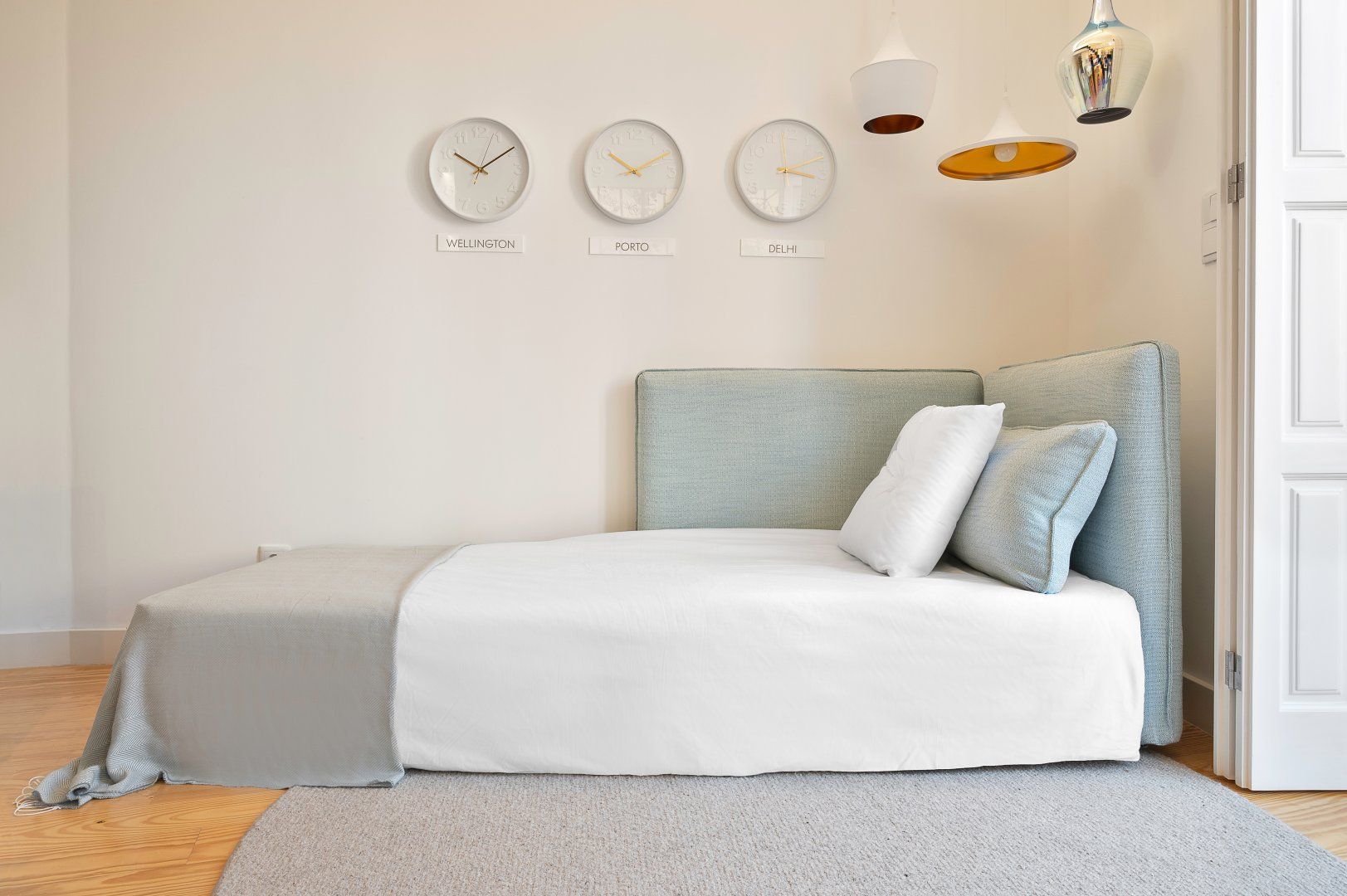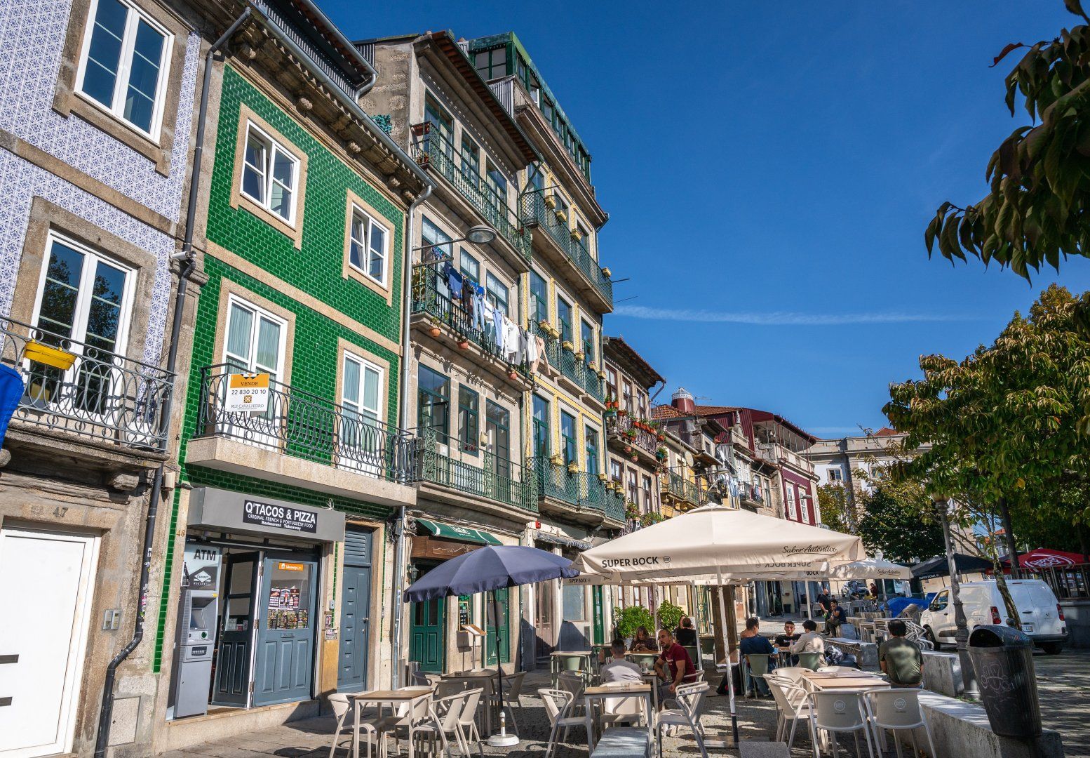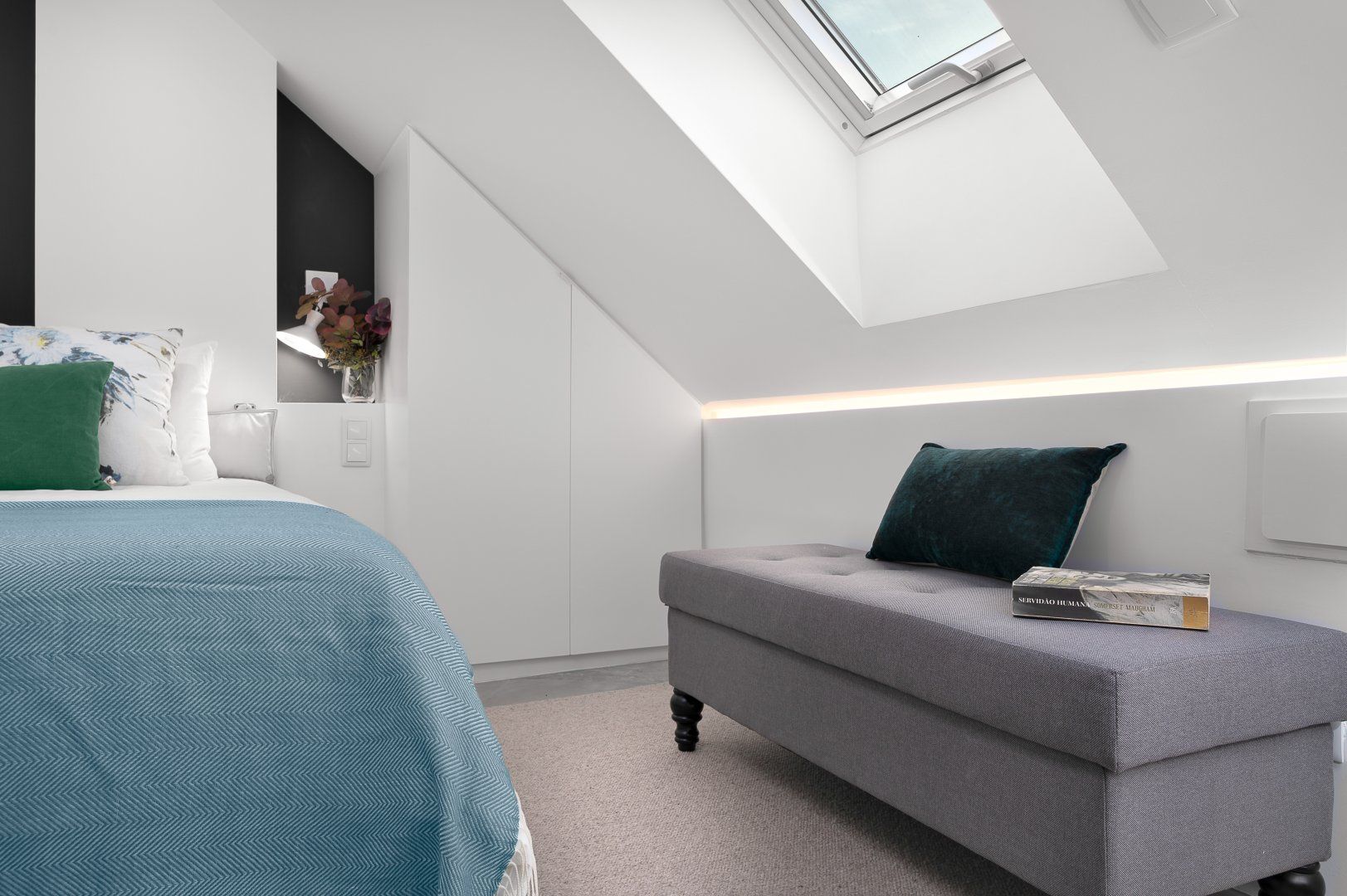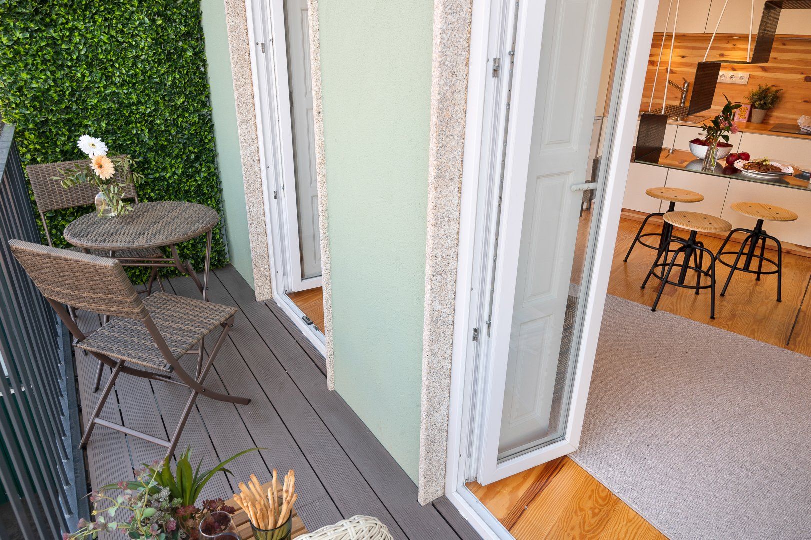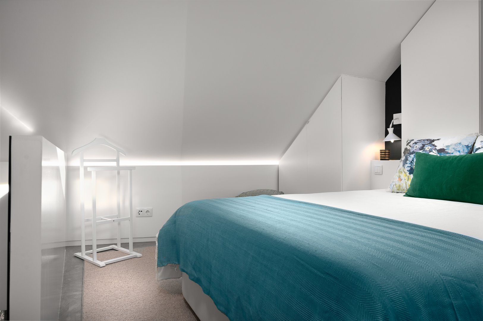 This loft apartment in Porto has been cleverly designed to maximise the amount of space available. The black floating staircase in the middle of the living room could easily dominate the space, but its sleek form lets natural light from the French doors flow around the space well. Similarly, the minimalist dining table is so slim that you can miss it from certain angles. The floral feature wall adds a bit of personality to the interior and works well with the large house plant. The addition of the balcony is particularly welcoming and allows for lovely views of the city's terracotta rooftops. It feels perfectly peaceful up here, but there are lots of famous landmarks nearby. The baroque Igreja do Carmo is two minutes' walk around the corner, while the equally impressive Palácio da Bolsa can be reached in ten.