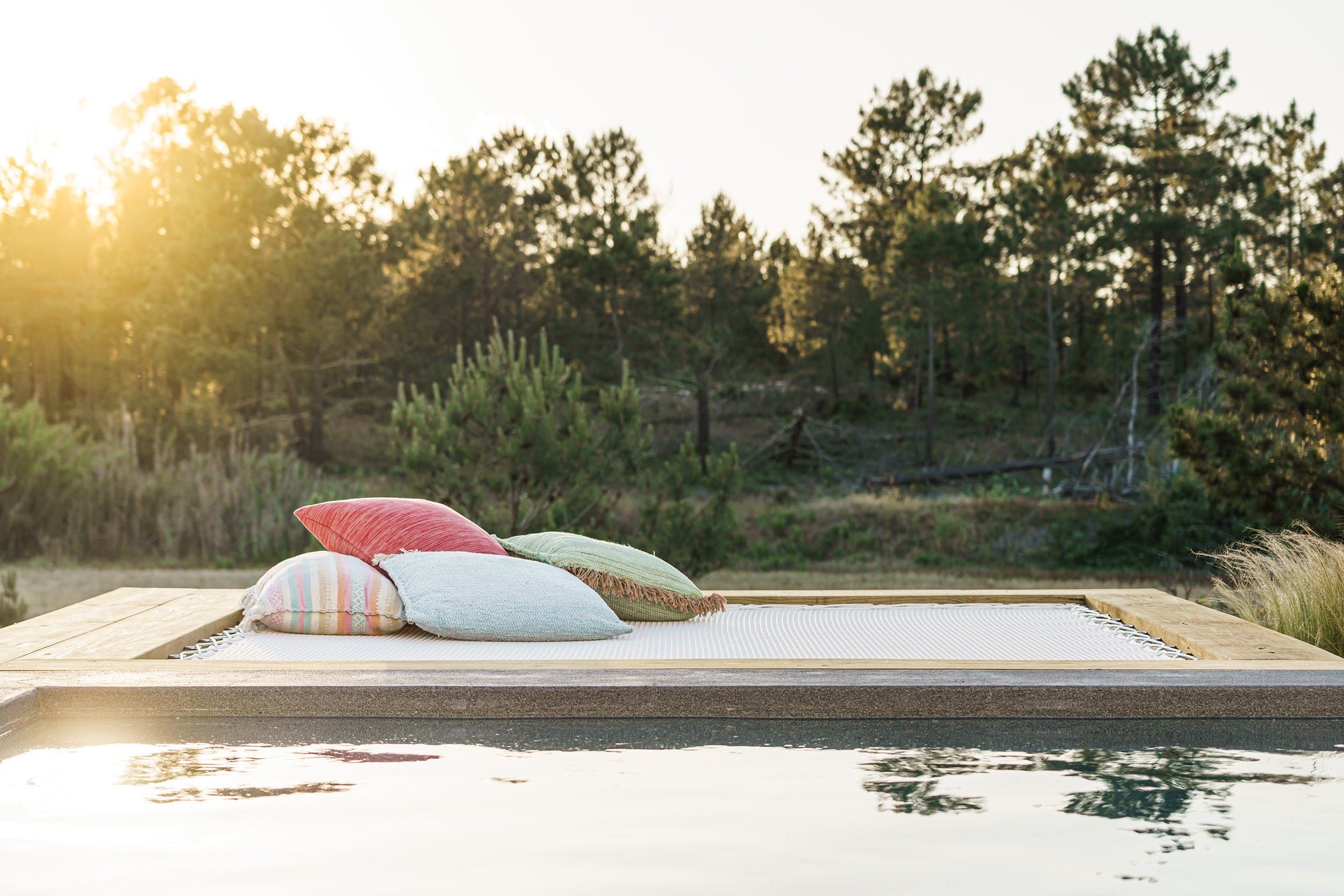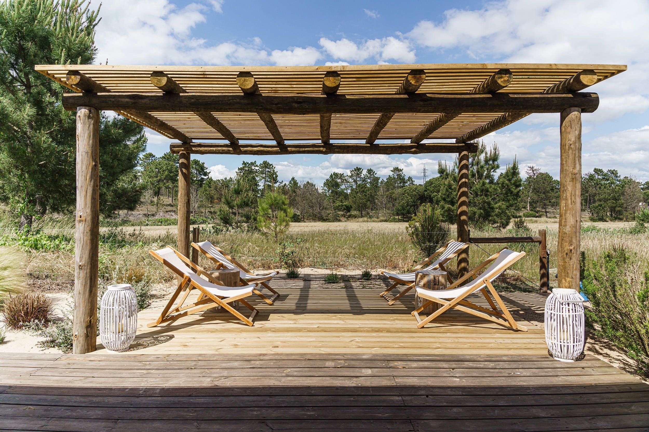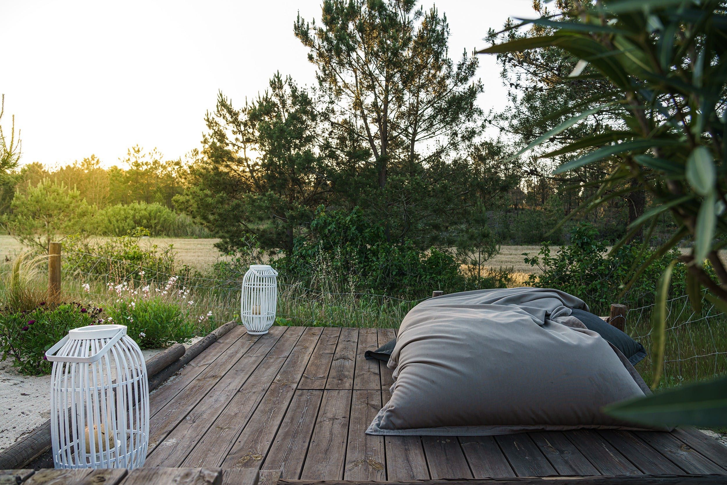 Firstly, we’re in awe of the spectacular garden. Nestled on your own private land, surrounded by verdant pine trees and nature, relaxing comes with ease. Out here, the hours whittle away while you’re relaxing on the sun loungers, taking a dip in the heated pool, catching up on your book on the bean bags, and taking in the scenery. When lunchtime rolls around, grill up a feast of local produce on the barbecue and gather around the pergola-covered bench-style dining table.