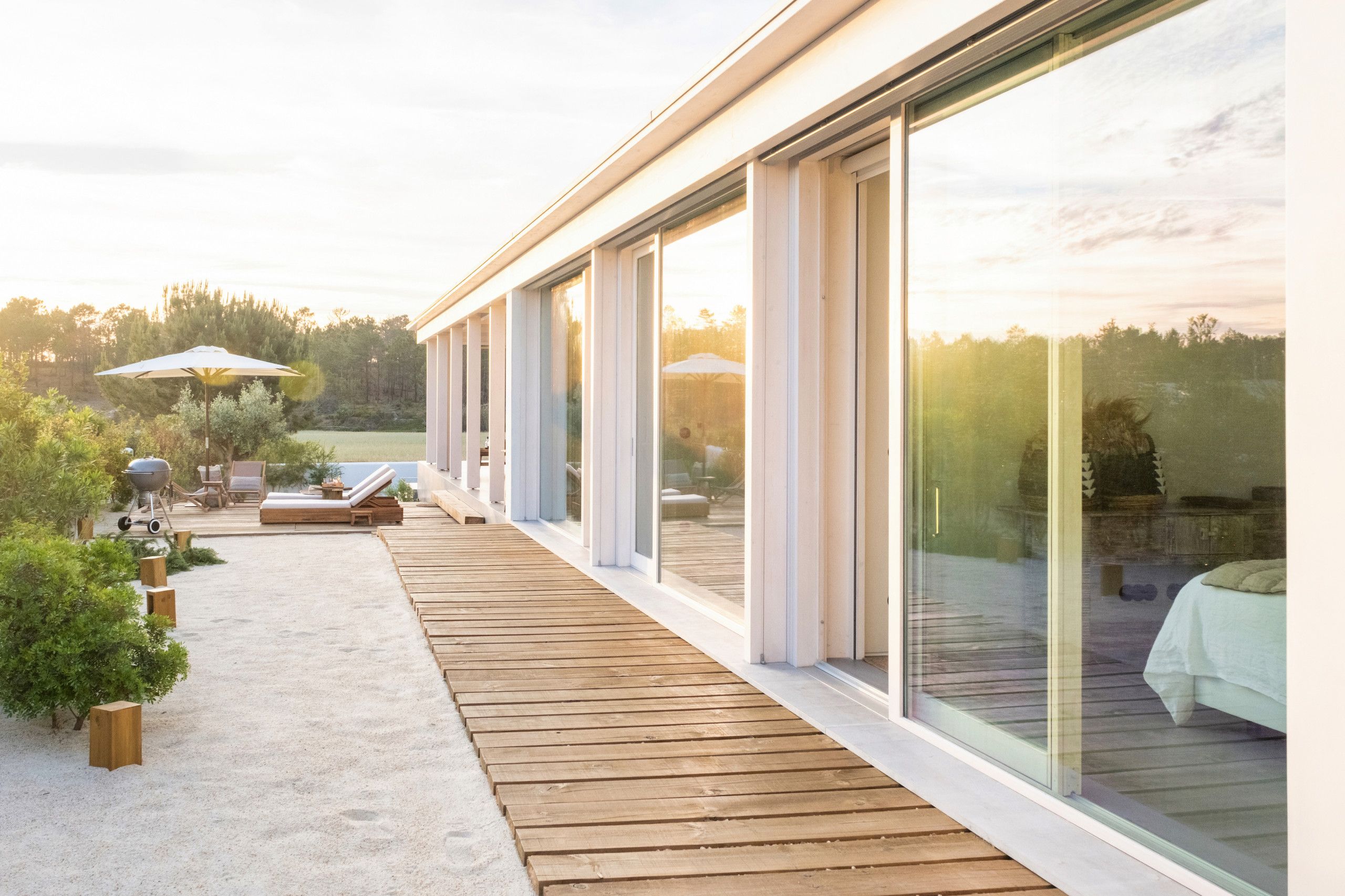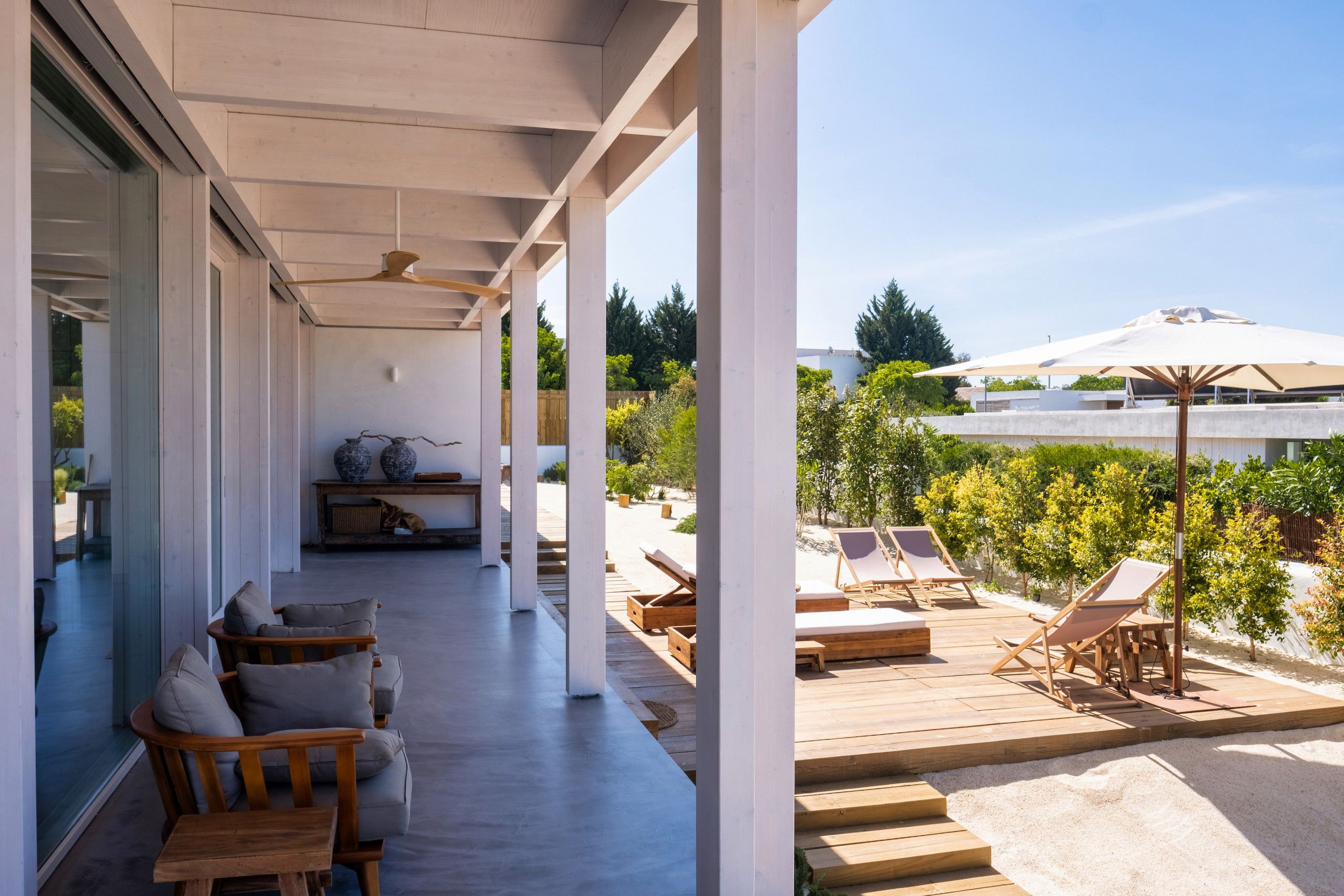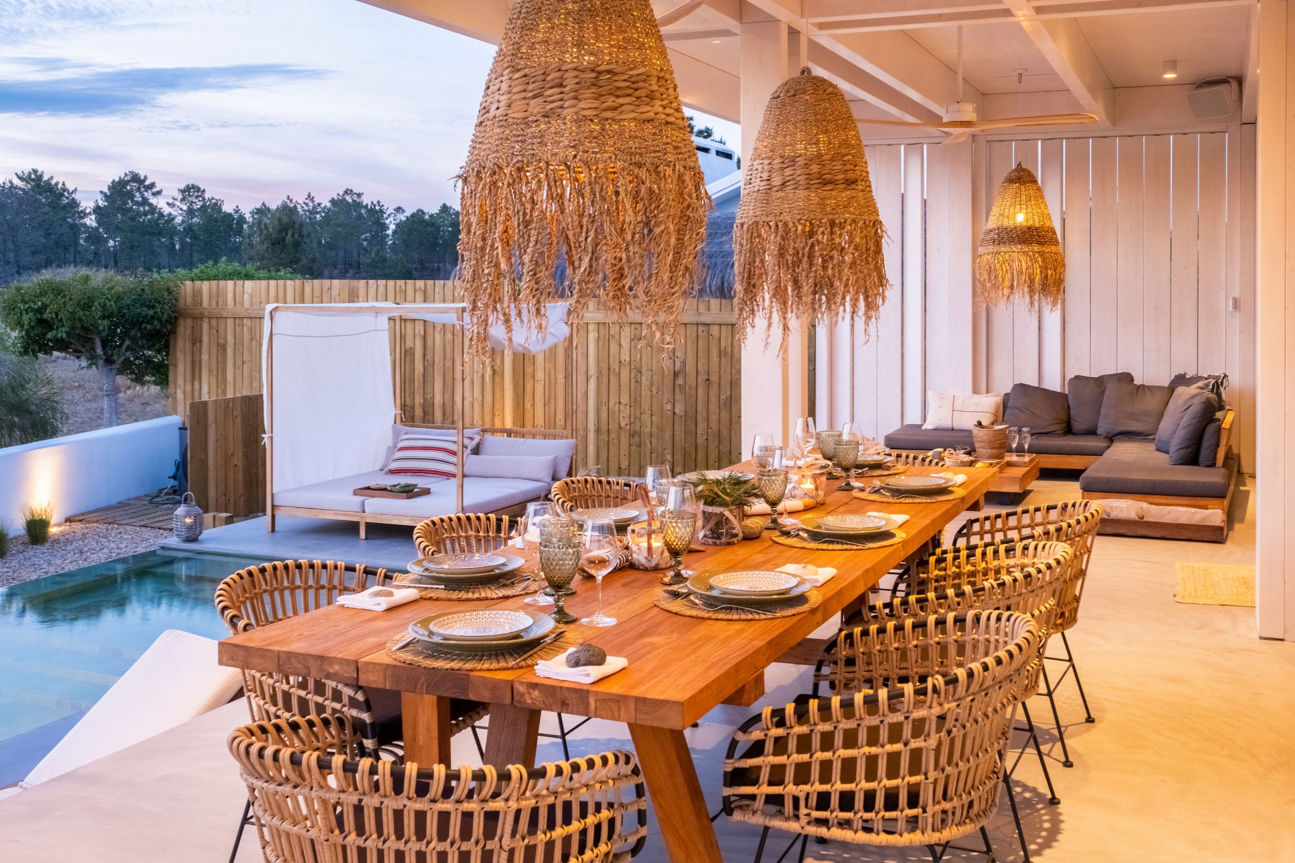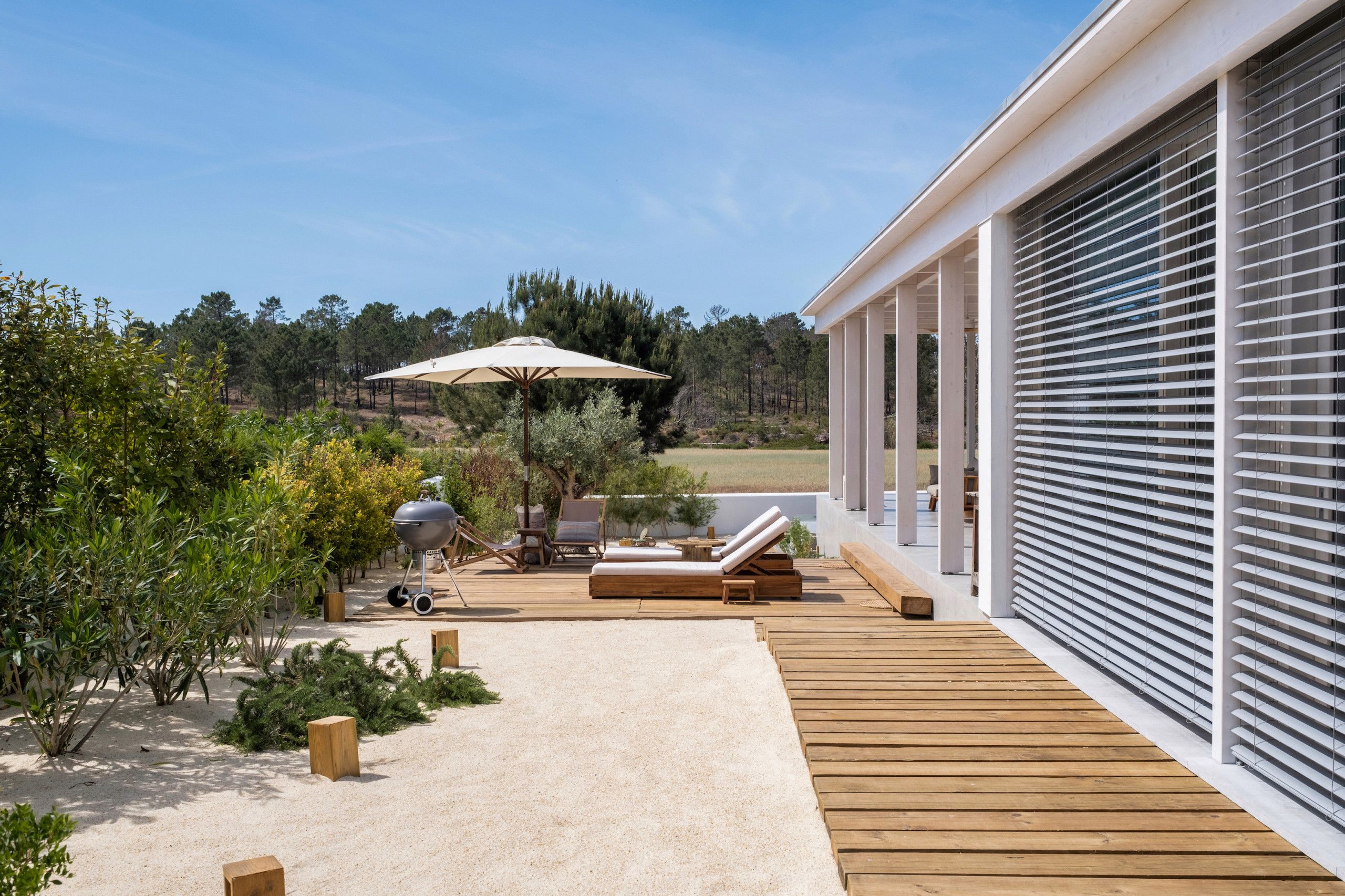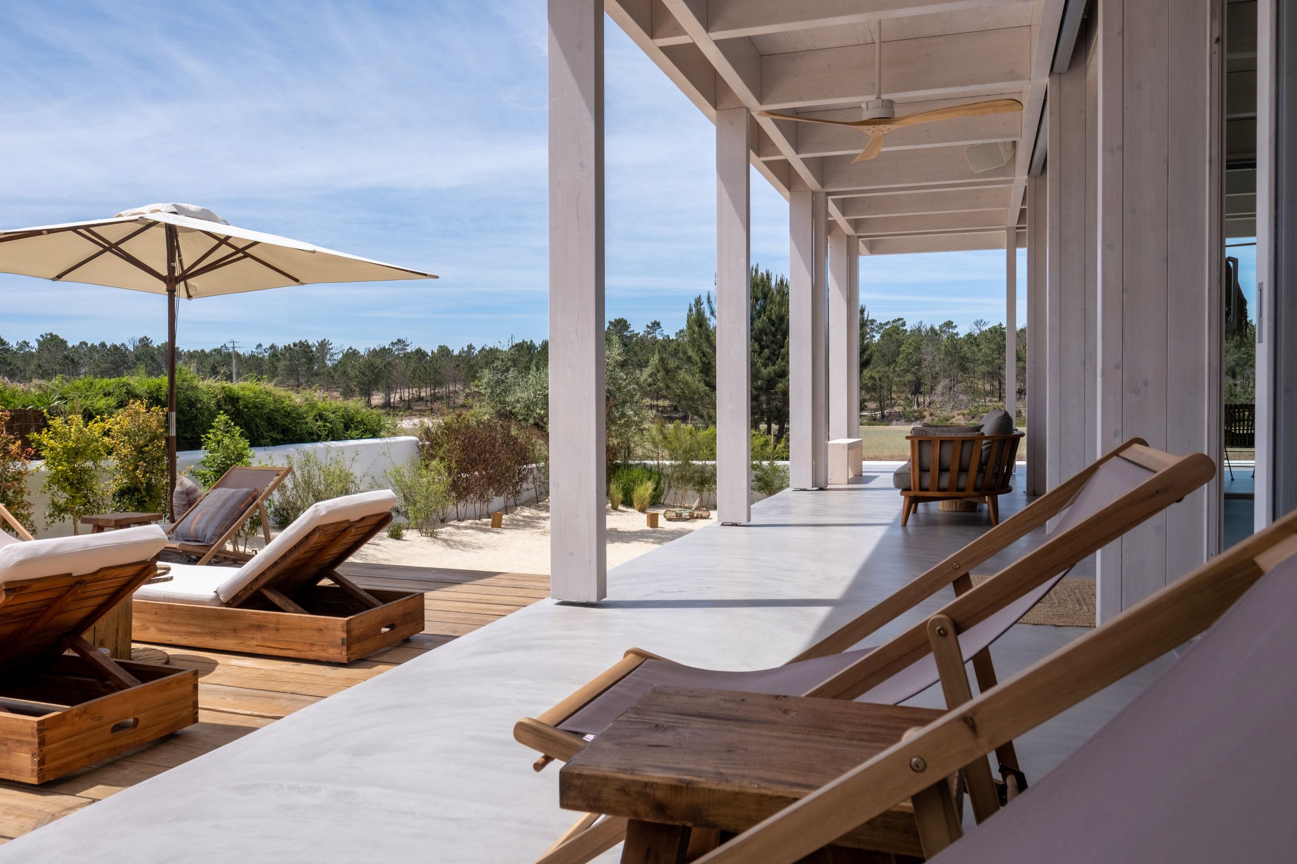 Found to the south of Comporta, this stunningly designed and furnished villa is perfect for families and friend groups seeking an idyllic coastal retreat. The home flows elegantly from living room to dining area to kitchen, each of which is bright, expansive, and fully equipped. The four bedrooms are just as comfortable, with two sharing a bathroom from either side and one downstairs triple room ideal for any younger guests who don't mind sharing. The heated pool area is stunning, more for aesthetic relaxation than morning lengths, while the adjoining alfresco dining table is one of many outdoor areas on the premises that are great for unwinding with a book and a beverage. If you have a day trip in mind, you can also reach the local beach in around fifteen minutes by car.