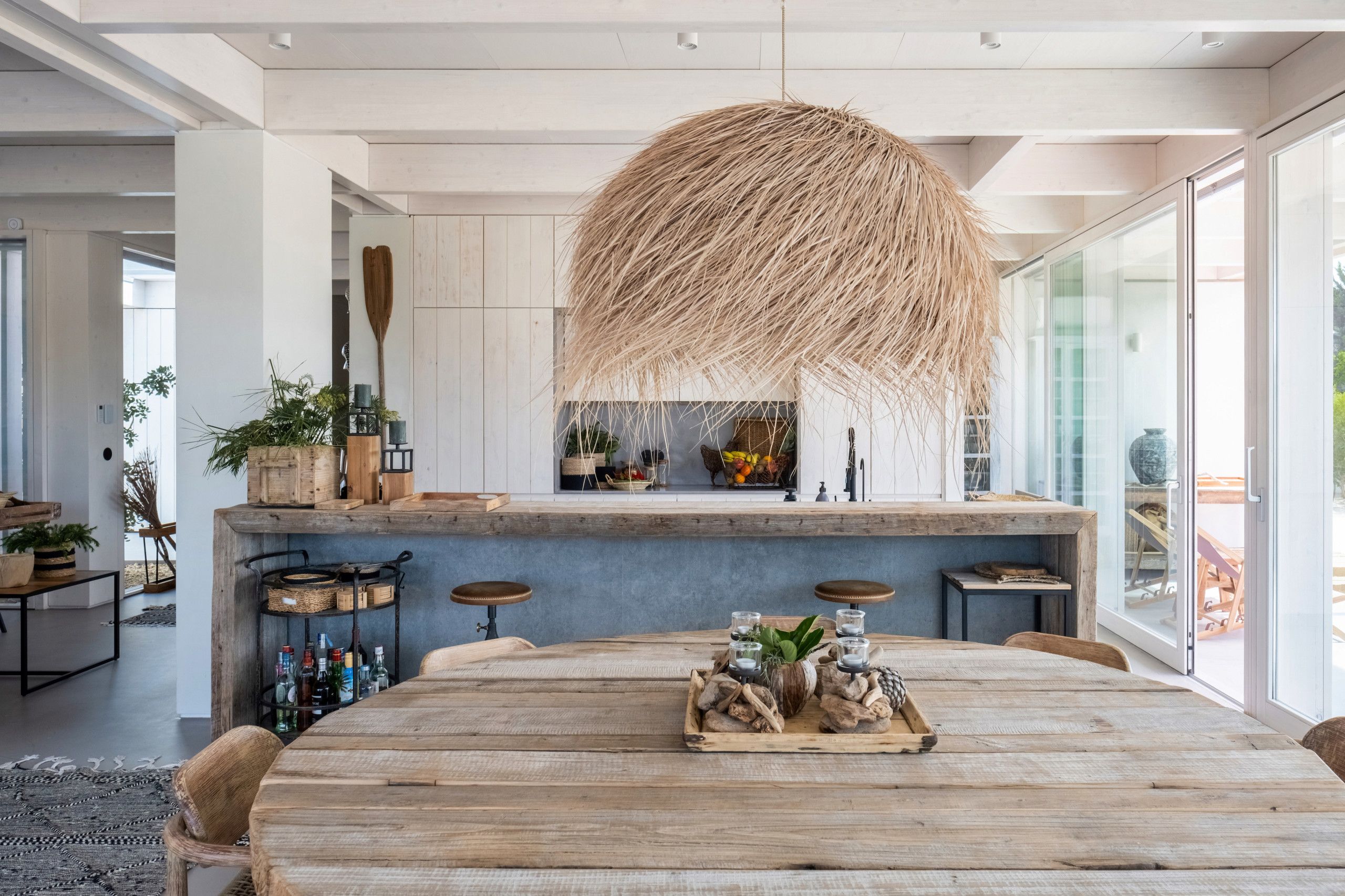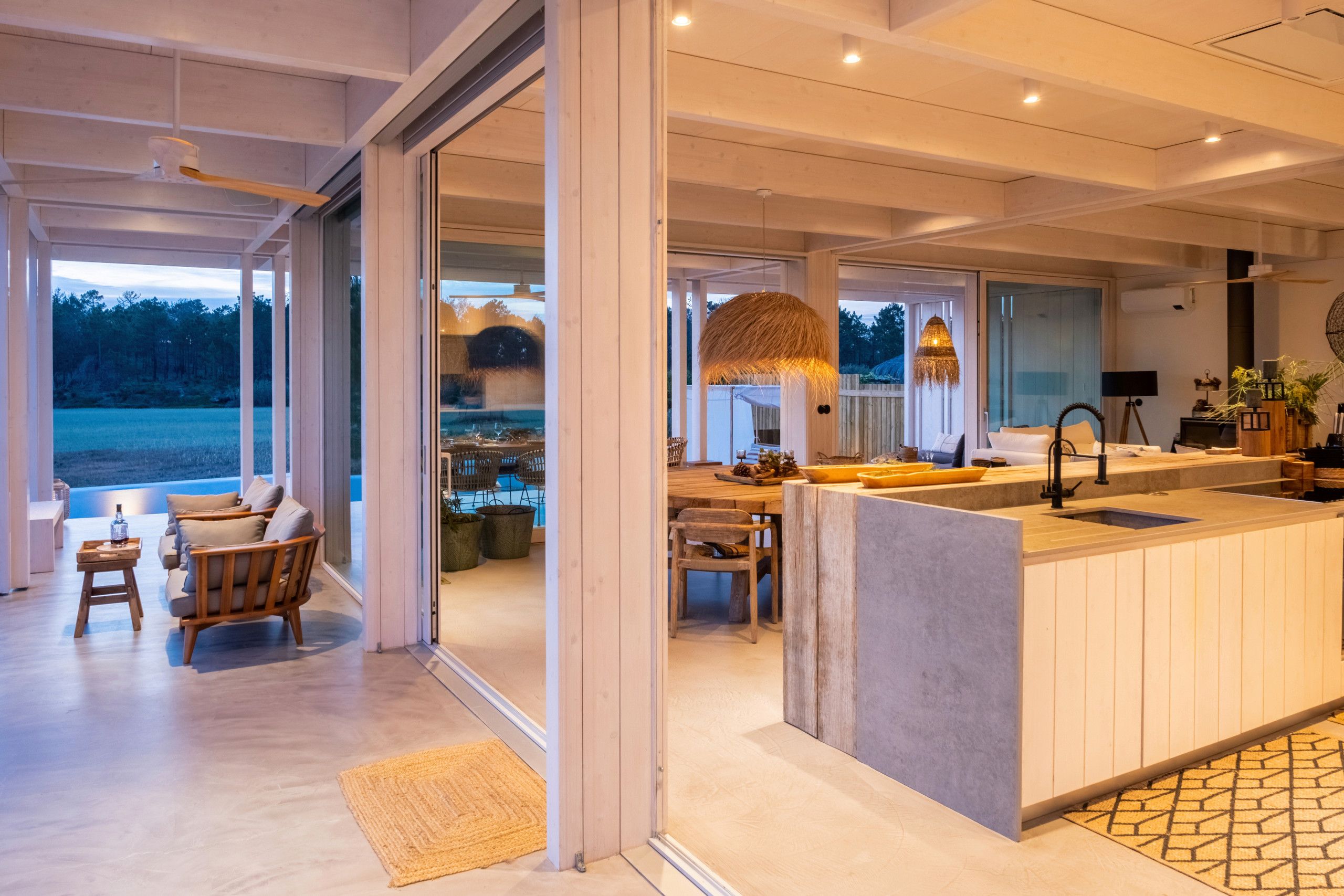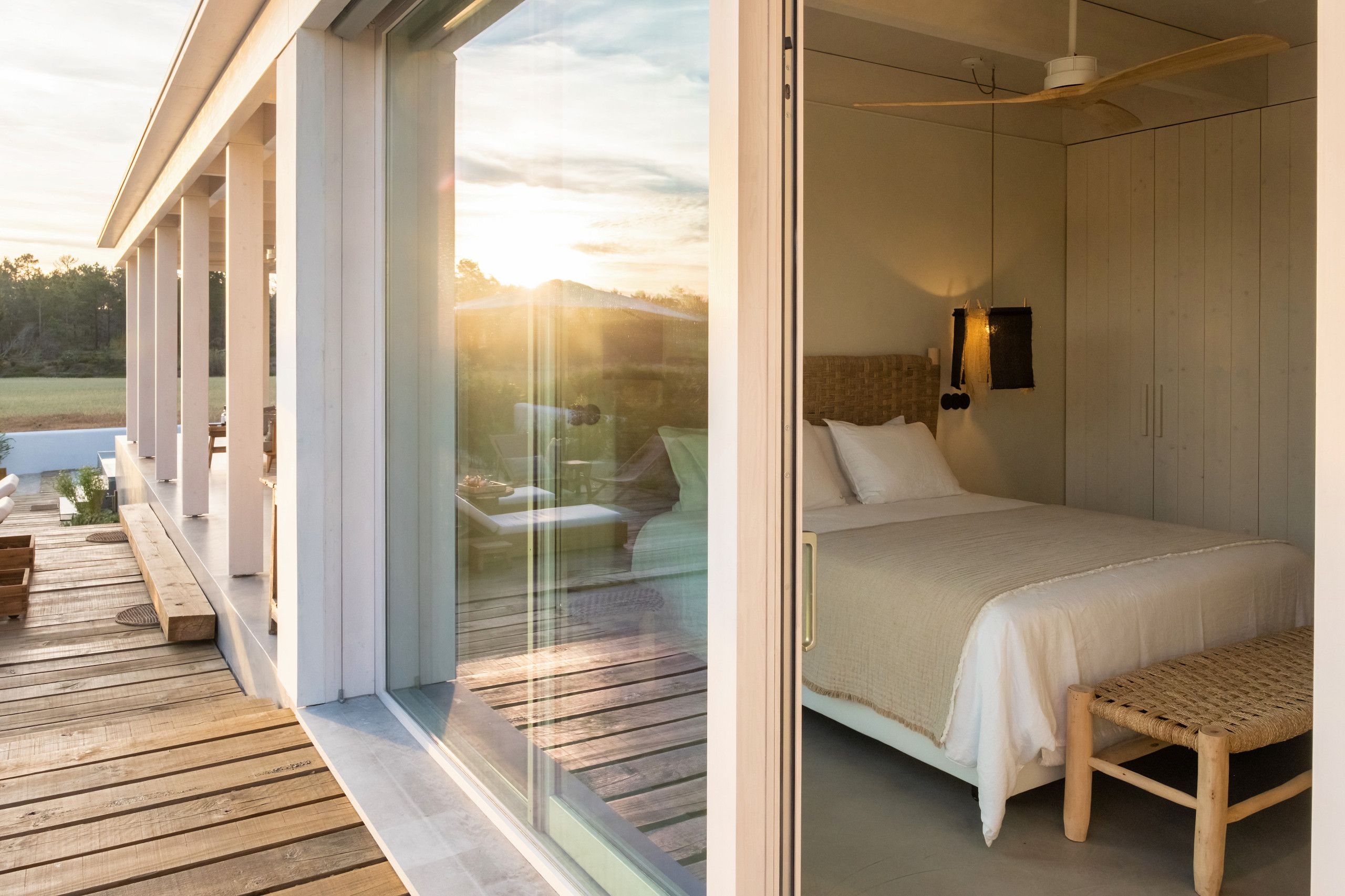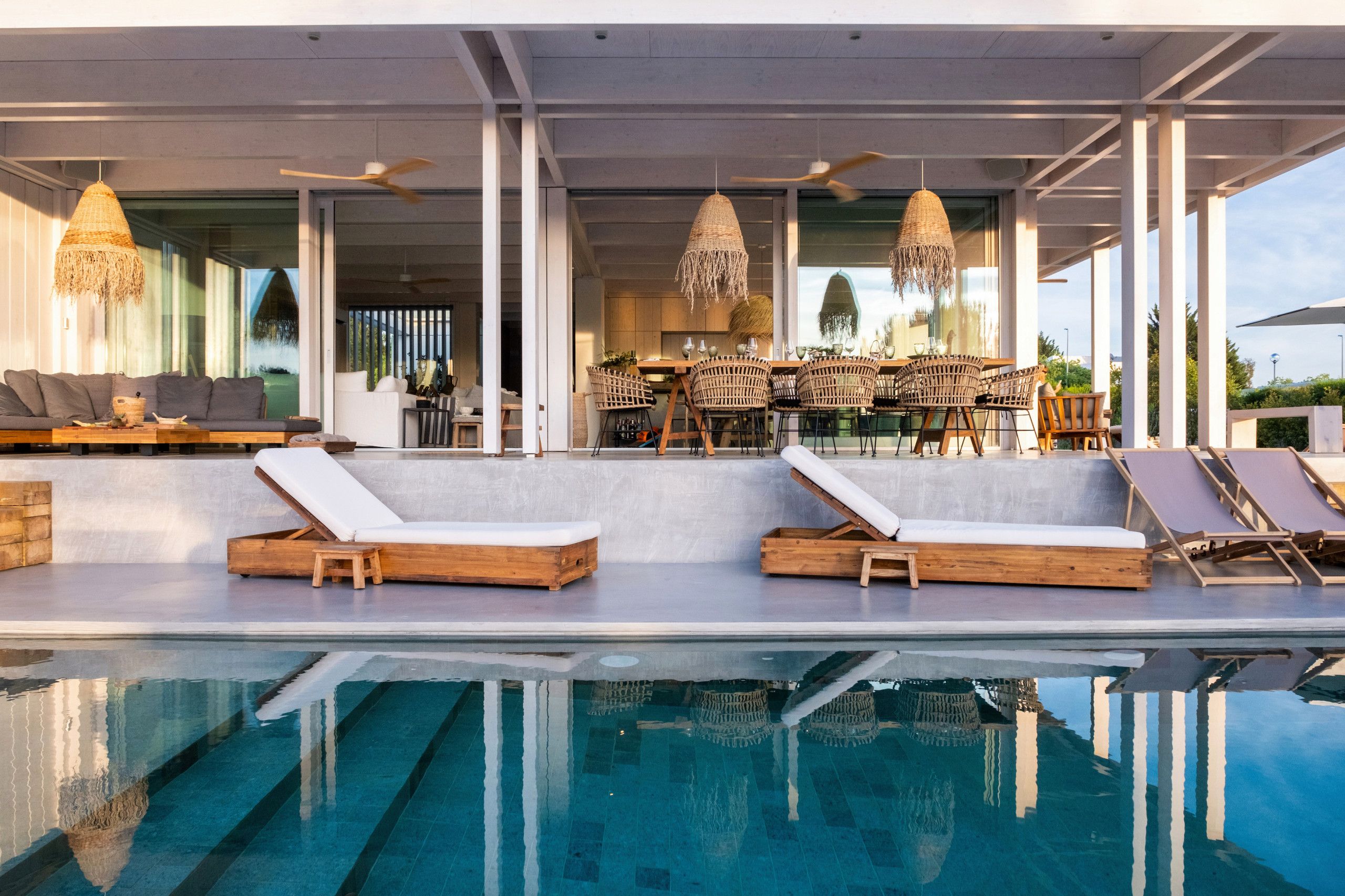 Found to the south of Comporta, this stunningly designed and furnished villa is perfect for families and friend groups seeking an idyllic coastal retreat. The home flows elegantly from living room to dining area to kitchen, each of which is bright, expansive, and fully equipped. The four bedrooms are just as comfortable, with two sharing a bathroom from either side and one downstairs triple room ideal for any younger guests who don't mind sharing. The heated pool area is stunning, more for aesthetic relaxation than morning lengths, while the adjoining alfresco dining table is one of many outdoor areas on the premises that are great for unwinding with a book and a beverage. If you have a day trip in mind, you can also reach the local beach in around fifteen minutes by car.