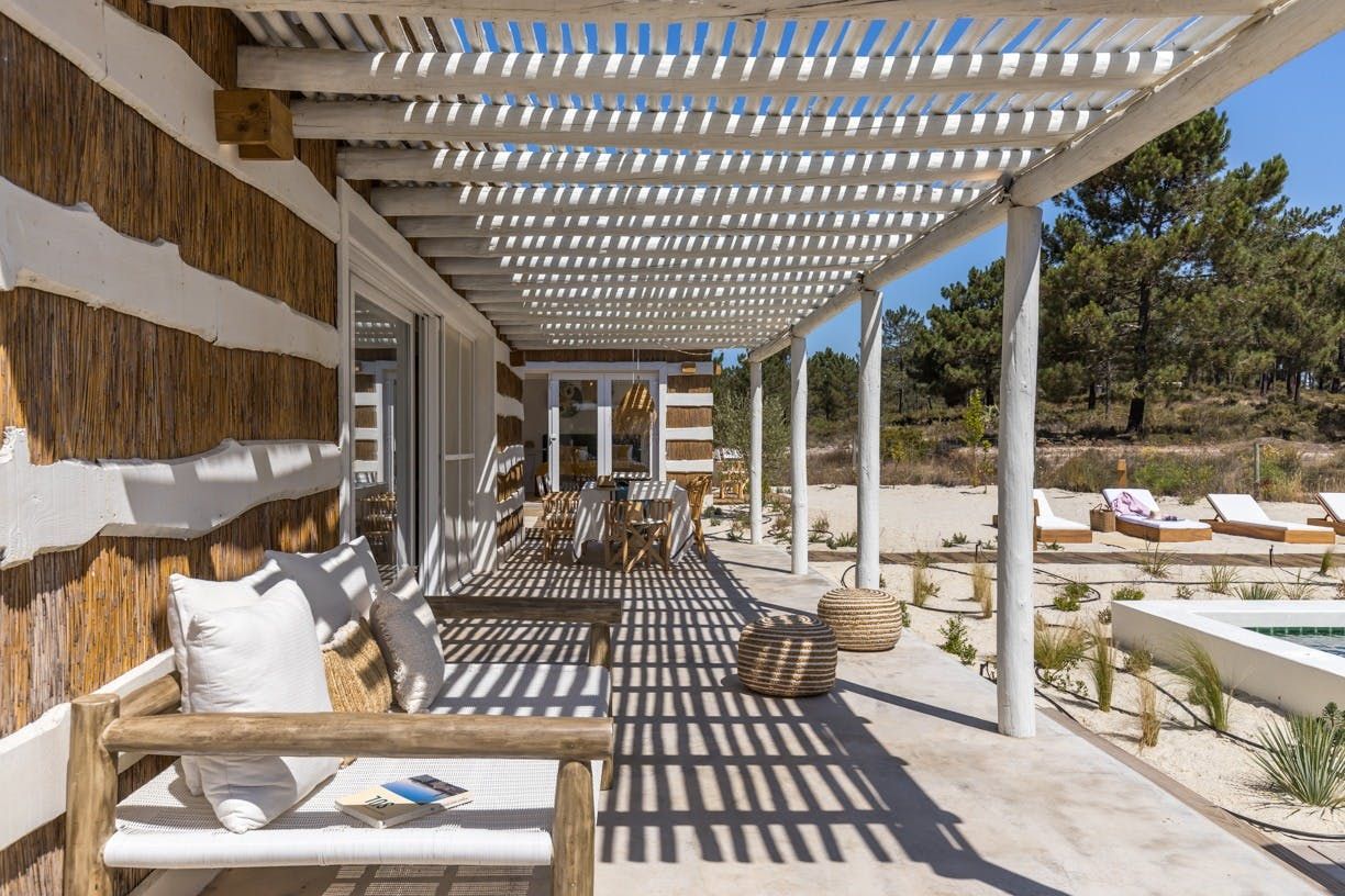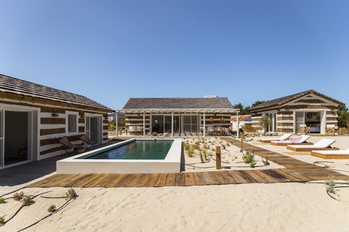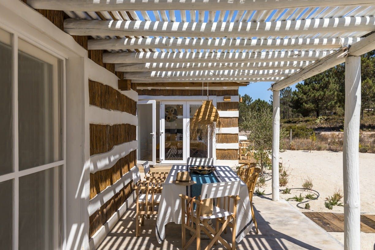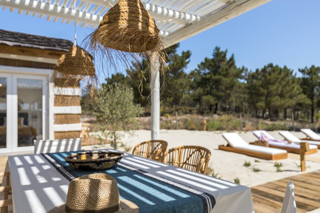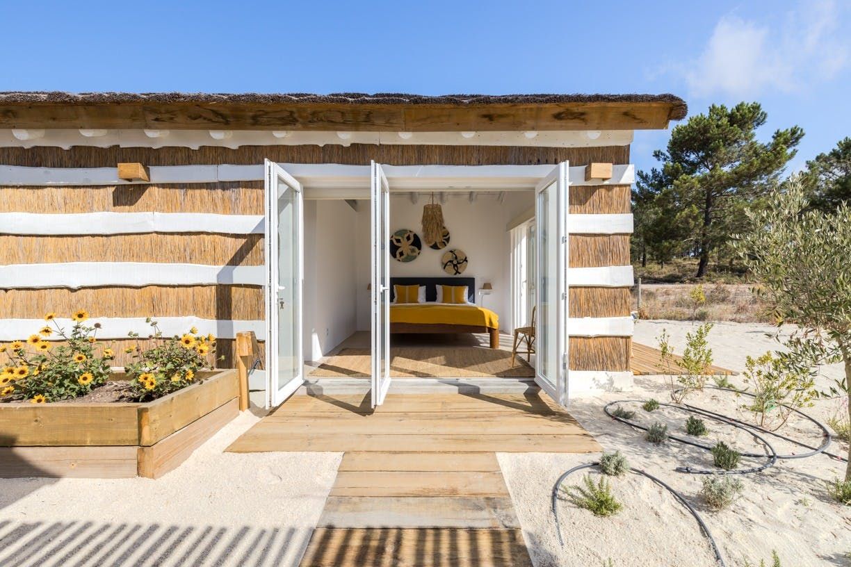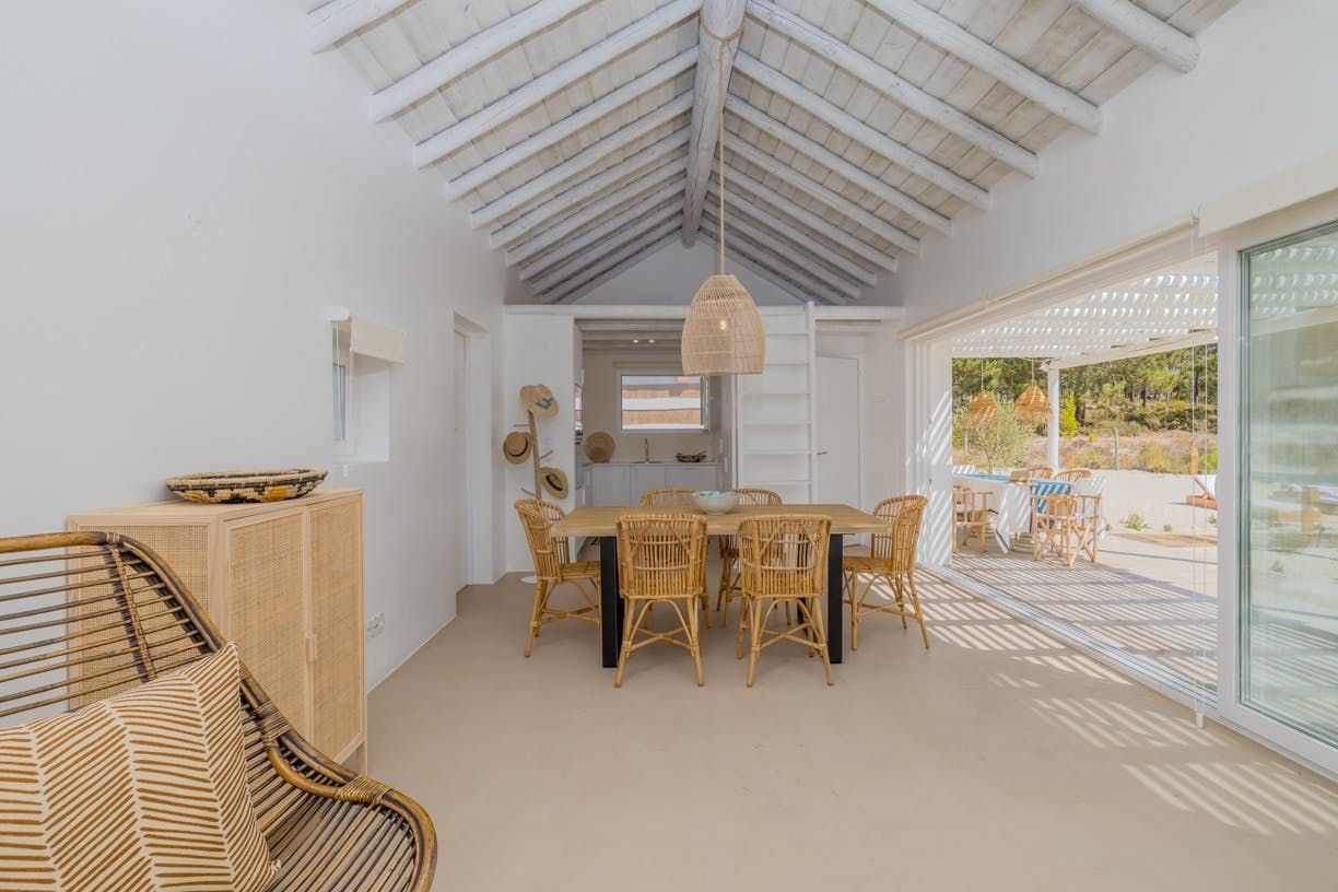 Interior spaces vibe perfectly with the creative, barefoot bohemian character of Comporta. Think bleached wood, wicker furniture and earth tones that help you feel integrated into your surroundings. Each building has been designed to remove the barriers between you and the natural world, with large doors that swing out to provide seamless access to the central pool surrounded by sun loungers and a rustic pergola for outdoor dining in the shade.