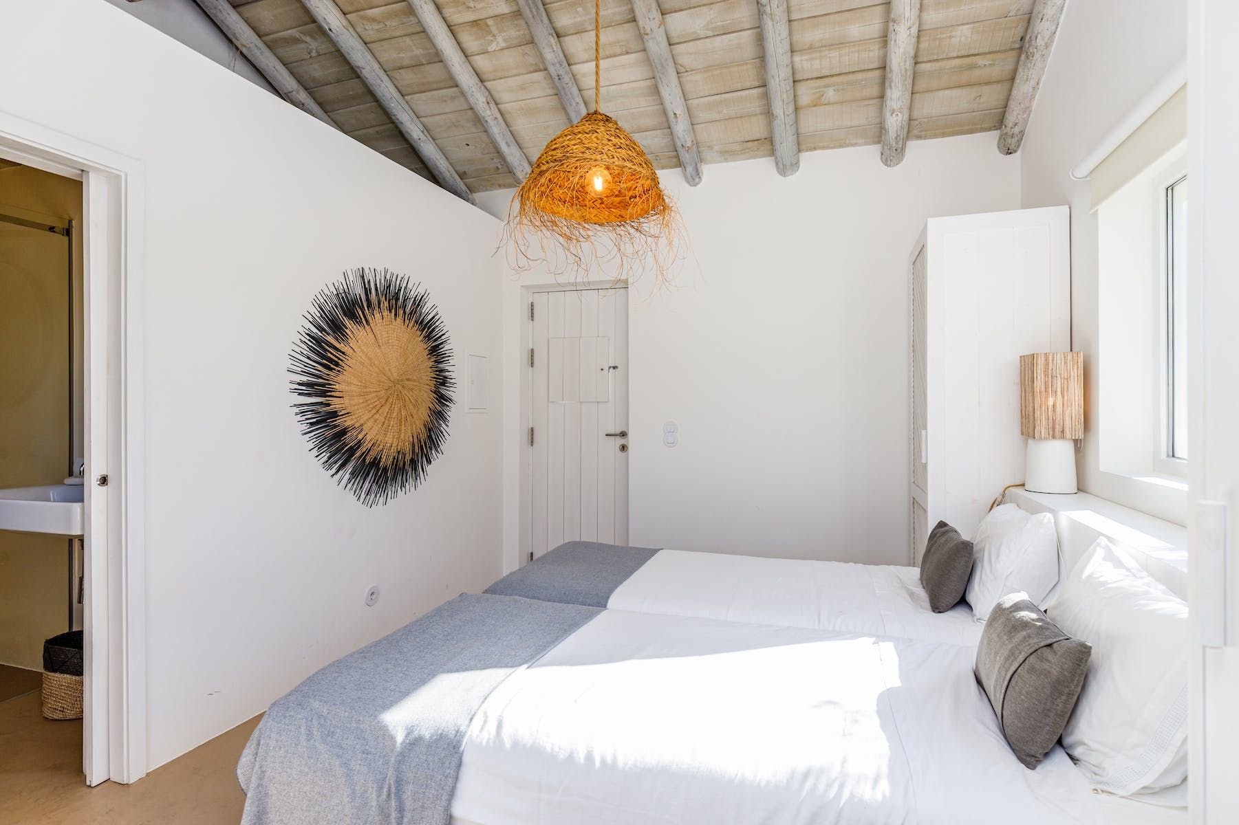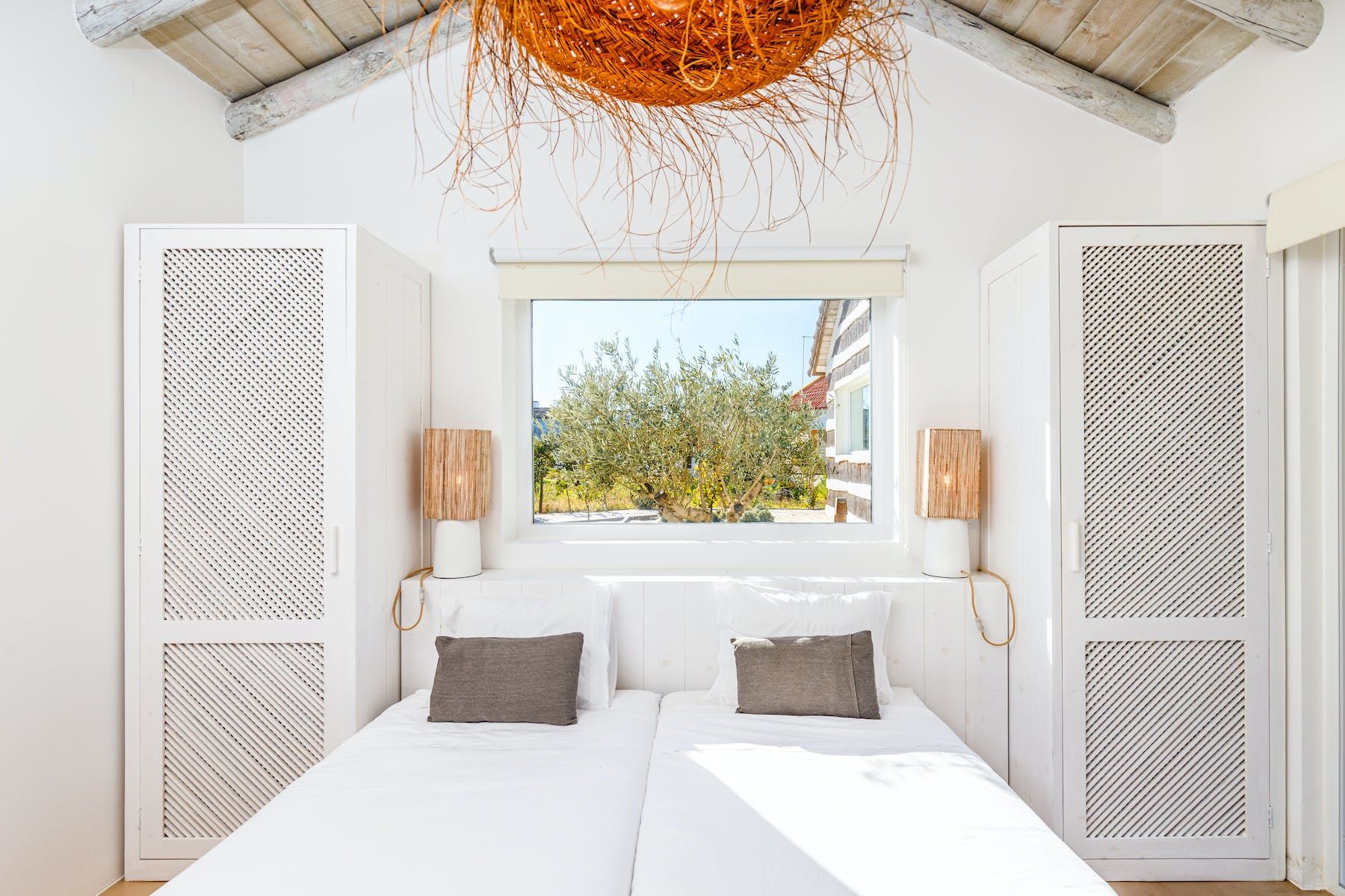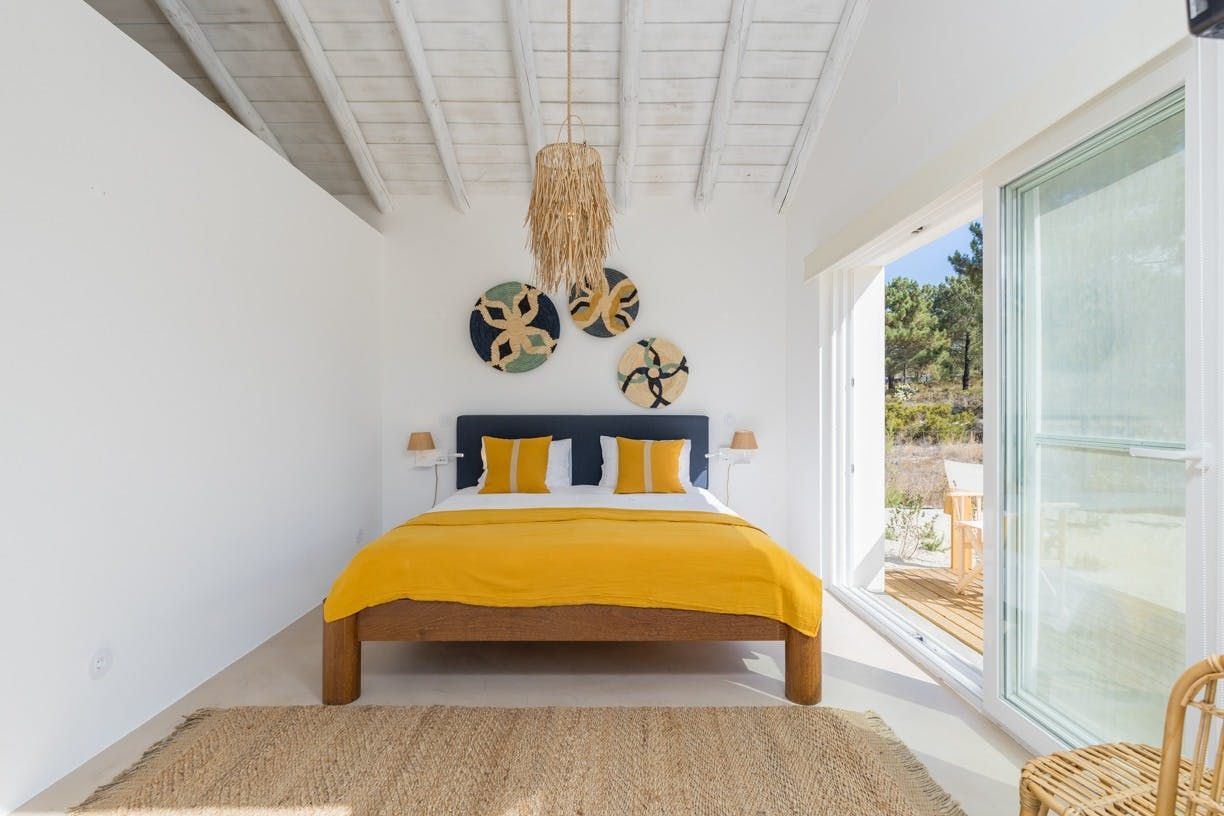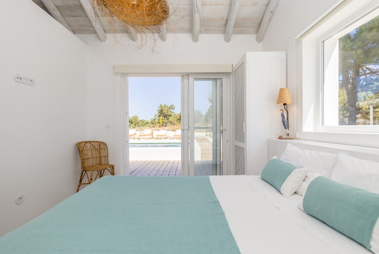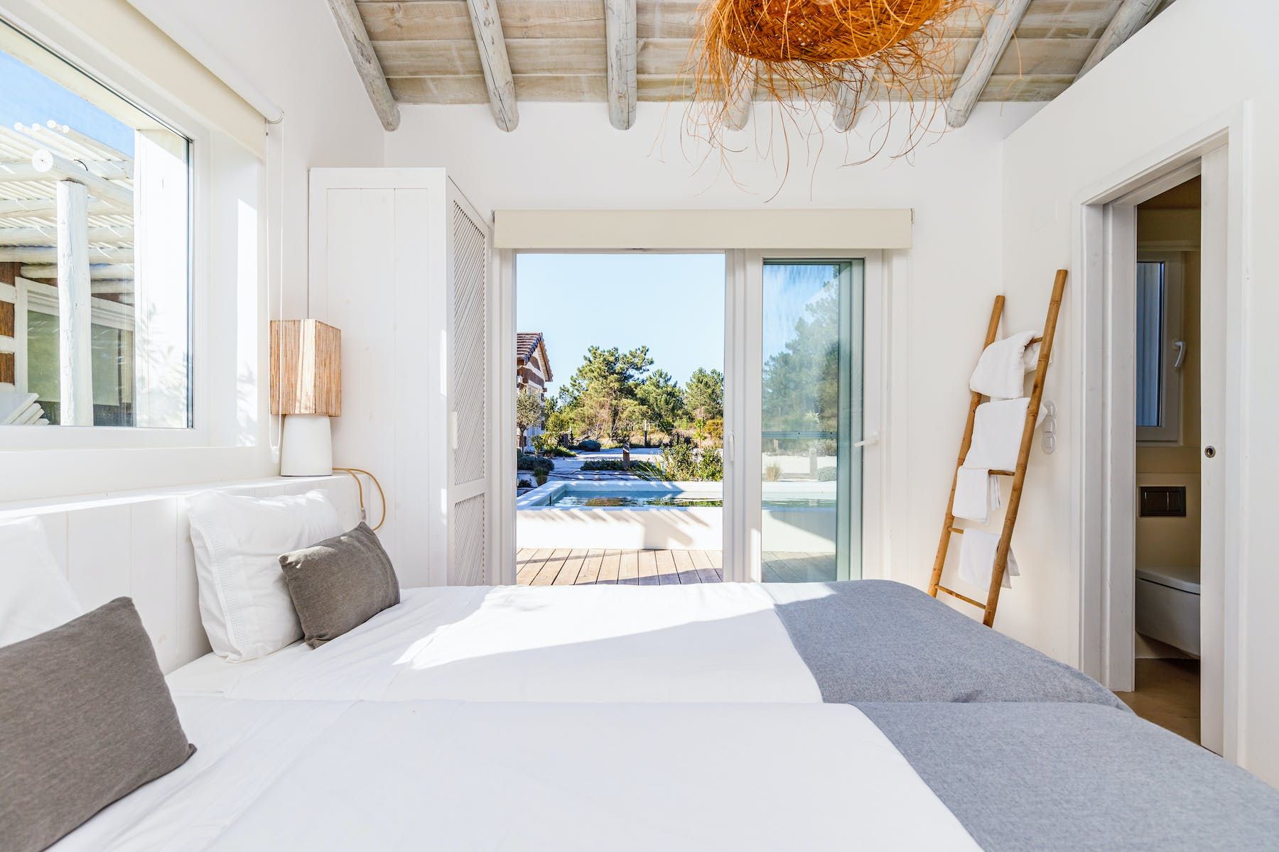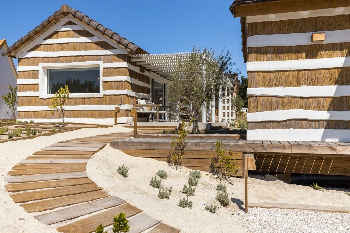 Interior spaces vibe perfectly with the creative, barefoot bohemian character of Comporta. Think bleached wood, wicker furniture and earth tones that help you feel integrated into your surroundings. Each building has been designed to remove the barriers between you and the natural world, with large doors that swing out to provide seamless access to the central pool surrounded by sun loungers and a rustic pergola for outdoor dining in the shade.