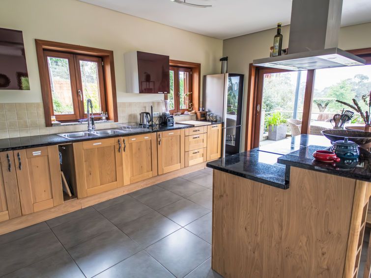 "Rio Lima Retreat", 8-room villa 350 m2 on 2 levels, south-west facing position. Very tasteful and cosy furnishings: 4 rooms, each room with 2 beds (90 cm, length 200 cm), shower/WC and electric heater. Exit to the terrace. Open kitchen (oven, dishwasher, 4 induction hot plates, toaster, kettle, microwave, freezer, electric coffee machine, cooking island) with dining table.