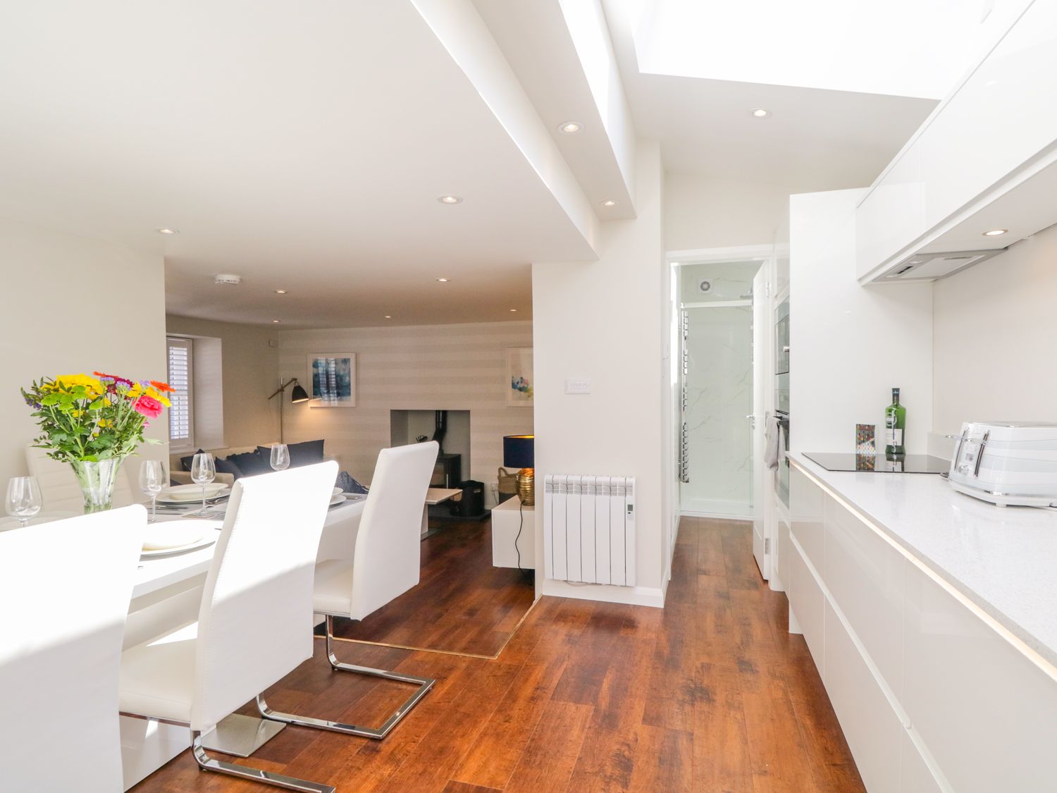 Accomodation Details Over two floors. Three bedrooms: 1 x ground floor super king-size, 1 x first floor super king-size with sea view, 1 x first floor twin. Ground floor bathroom with walk-in shower, basin and WC. Open-plan living room with a kitchen, dining area and sitting area with woodburning stove. Utility room.