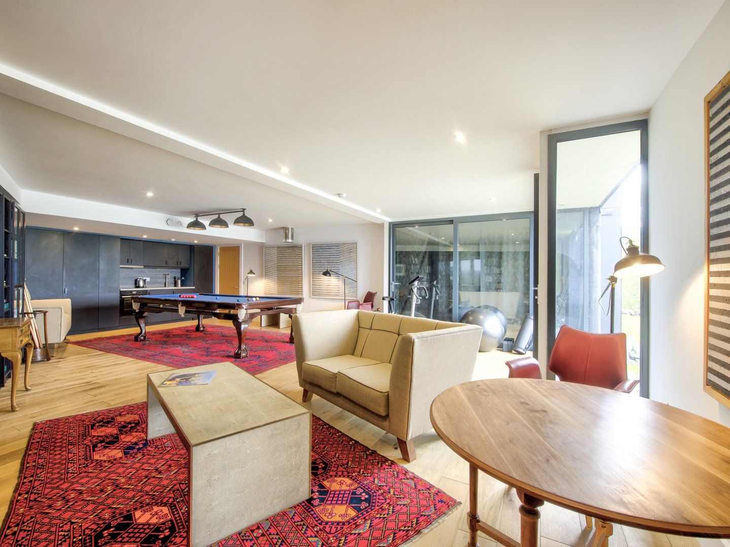Five bedrooms: Ground Floor - 1 x king-size with en-suite bath, shower over, basin and WC, 1 x twin (zip/link, can be super-king-size on request) with en-suite bath, shower over, basin and WC, 1st Floor - 1 king-size with en-suite bath, shower over, basin and WC, 1 x twin with en-suite bath, shower over, basin and WC, Lower-ground-floor super-king-size (zip/link can be twin on request) with en-suite bath, shower over, basin and WC, Cloakroom with basin and WC. Open-plan living space with kitchen, dining area and living area with woodburning stove. Utility. Lower-ground-floor games room with kitchenette