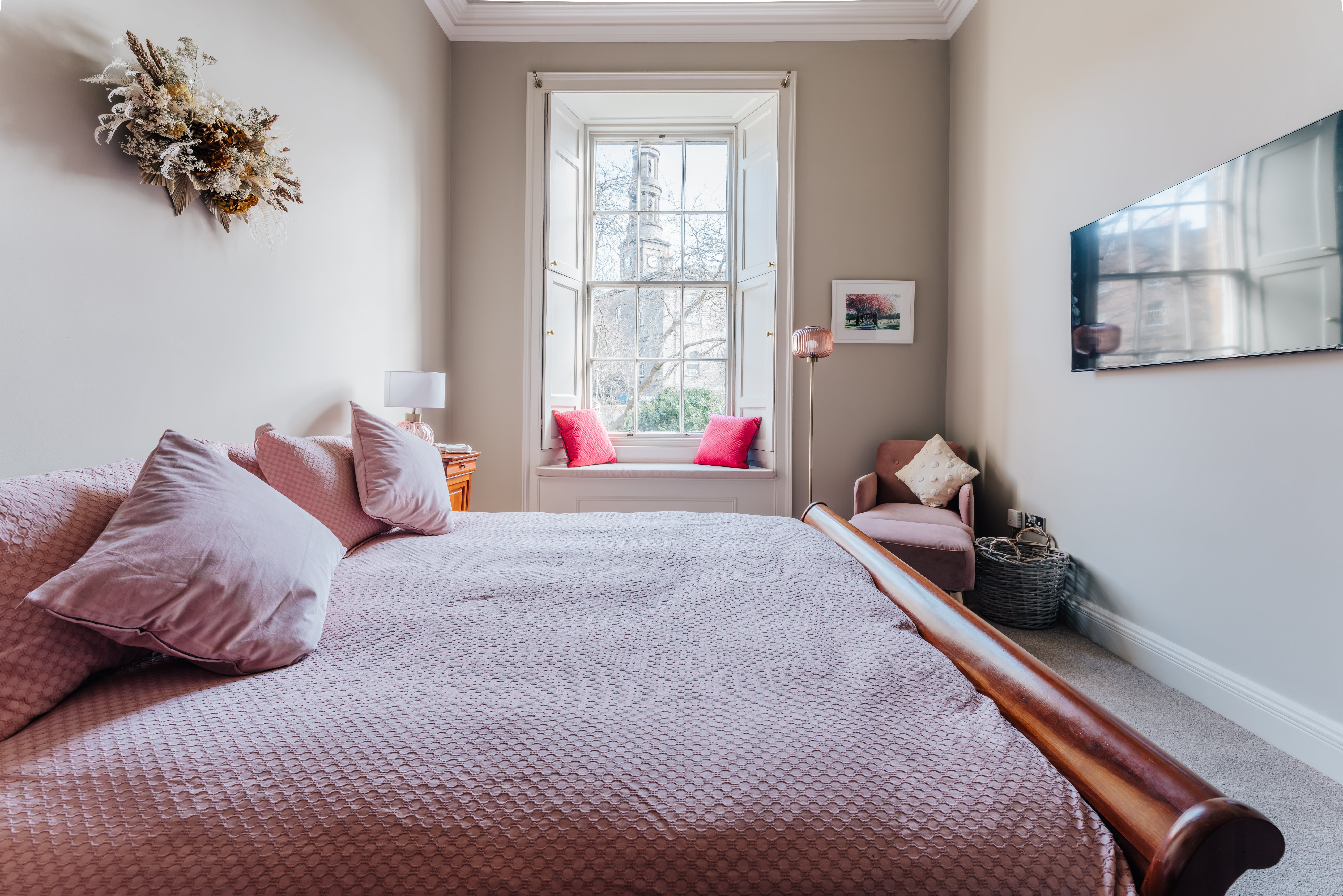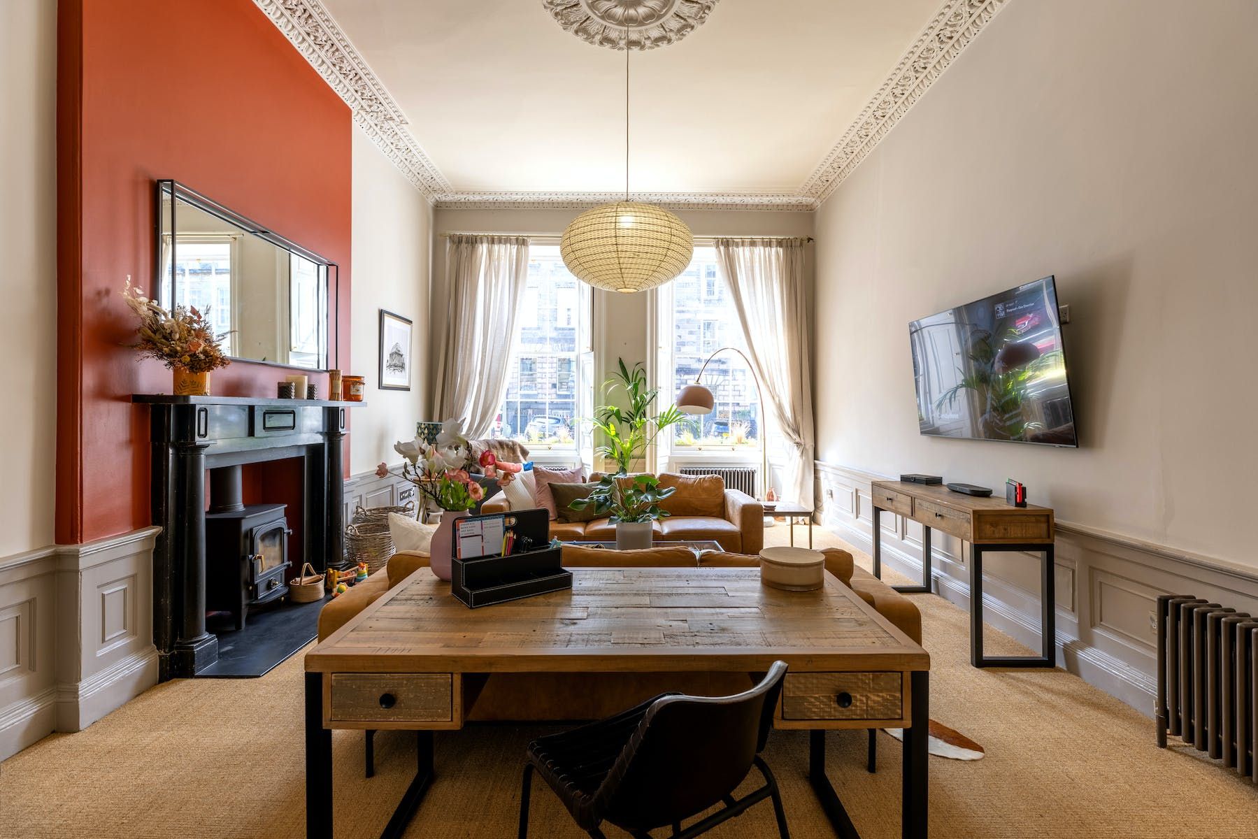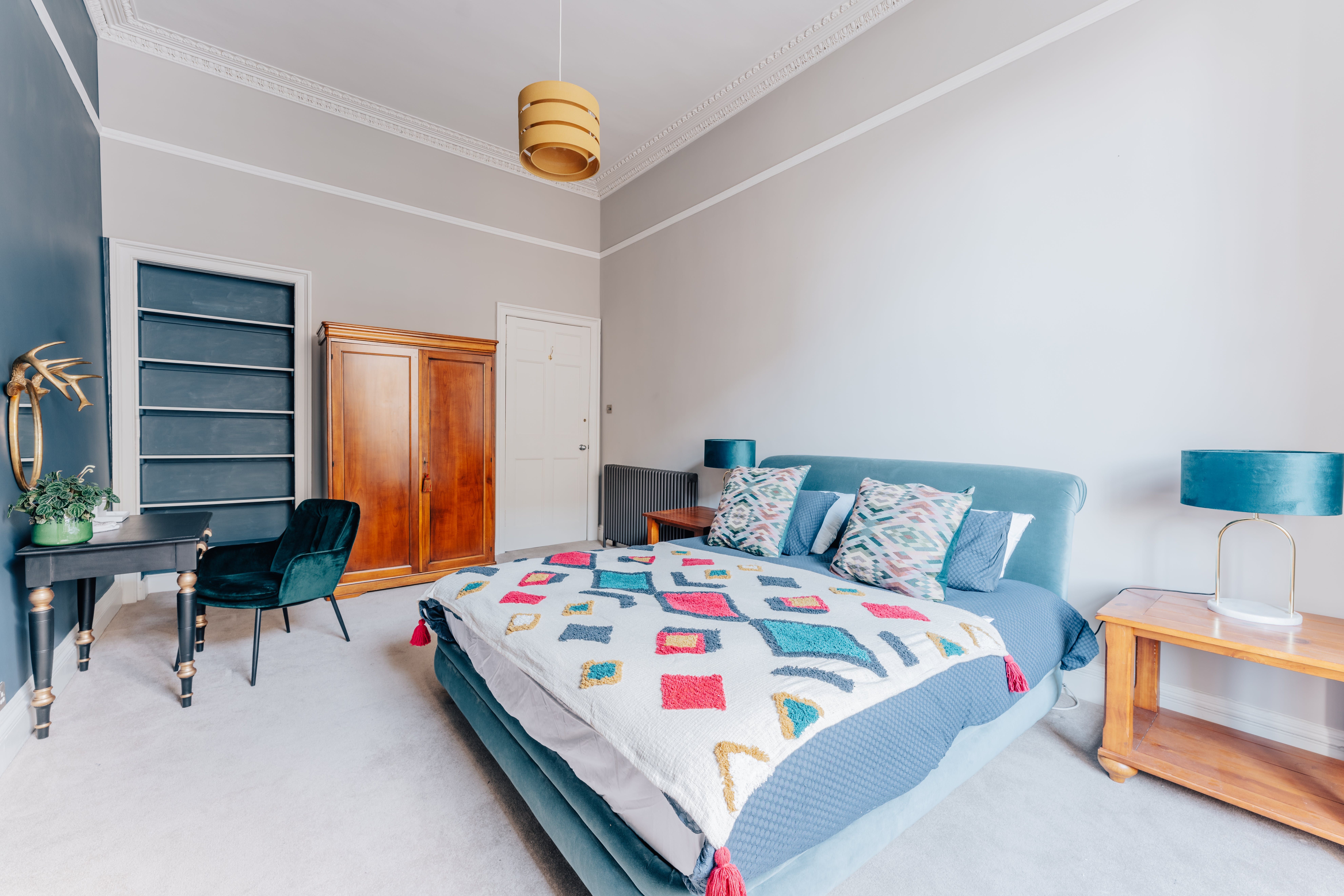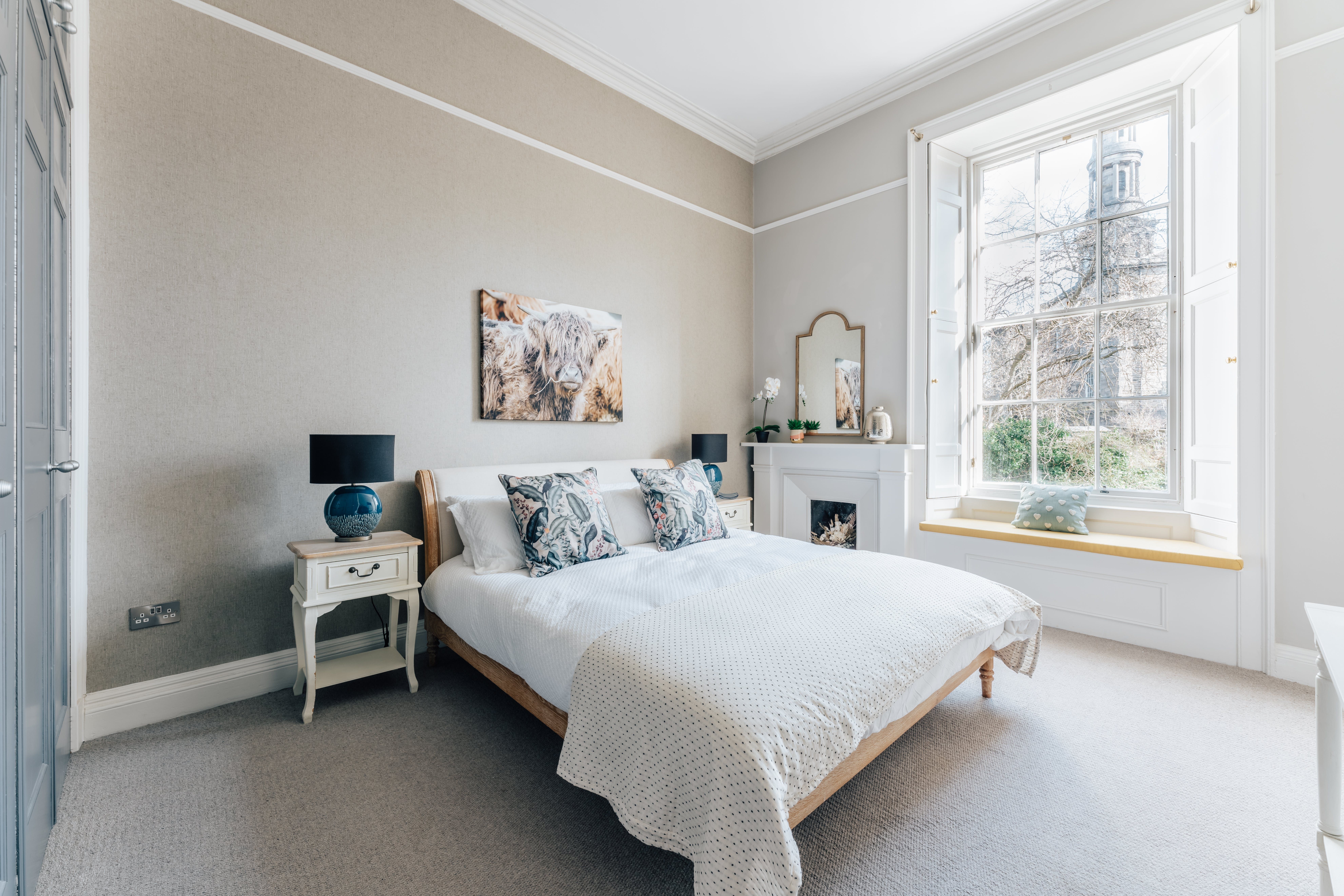 Tall corniced ceilings, wood floors and an abundance of light coming in through the sash windows create an instantly welcoming feel with chic, contemporary furnishings inviting you to make yourself at home. We love the living room’s large suede sofas that beckon relaxing evenings over a glass of wine by the period working fireplace, and the large kitchen bathed in natural light that’s ready to cater celebratory feasts aplenty. The three bedrooms, meanwhile, have each been carefully curated with a sophisticated touch and boast similarly large windows that give way to New Town views. We’re particularly fond of the main bedroom’s en-suite – a spa-like space with its rainfall shower and tempting tub, the latter providing the perfect end to a night with a glass of bubbly.