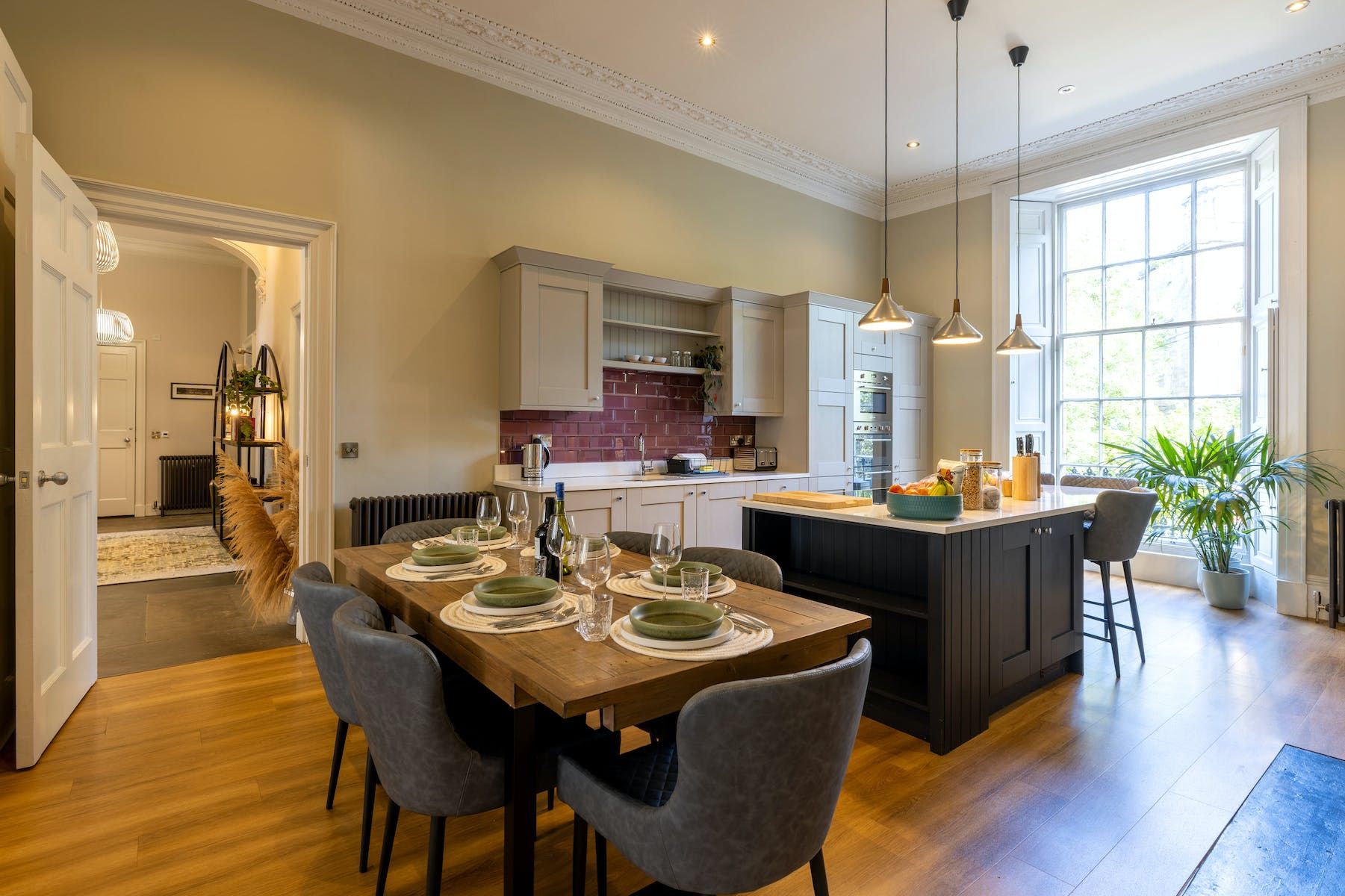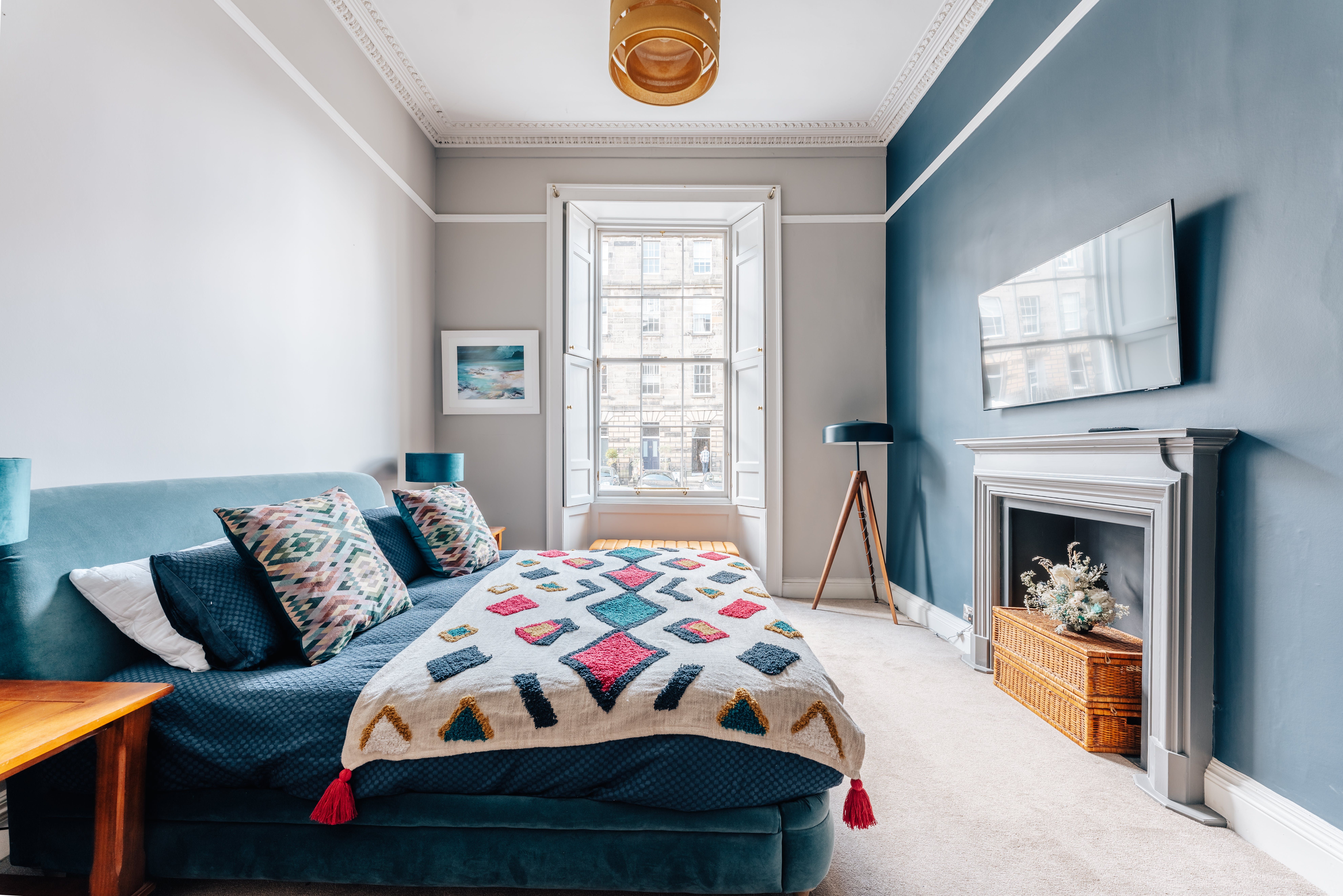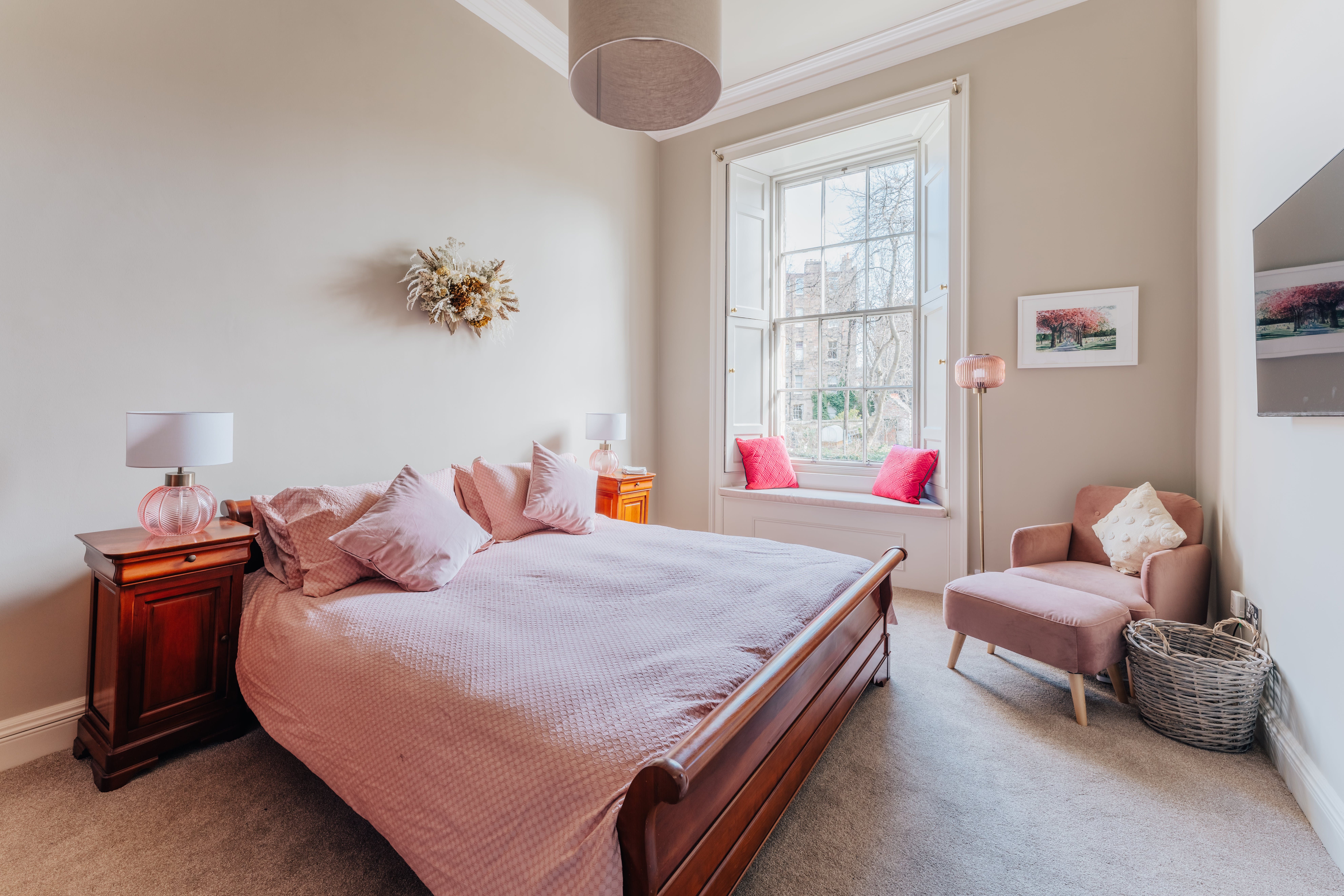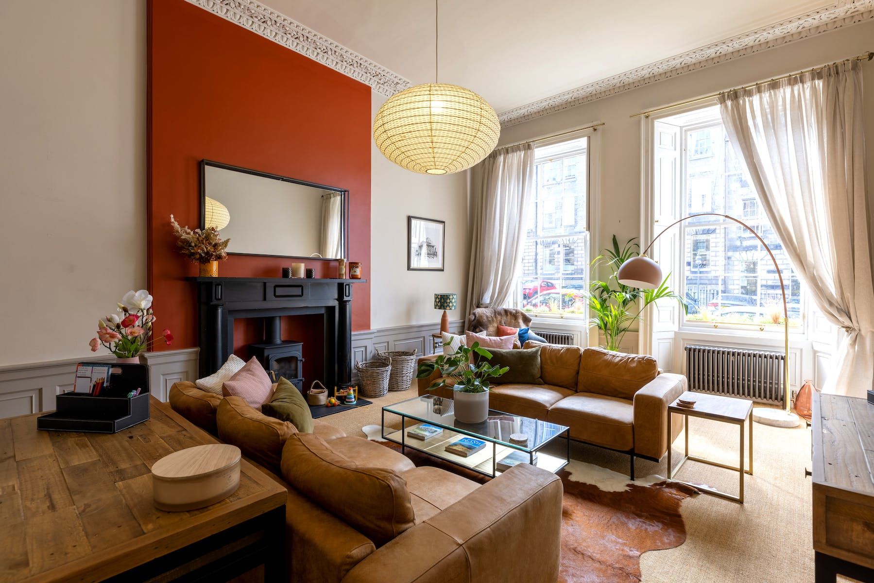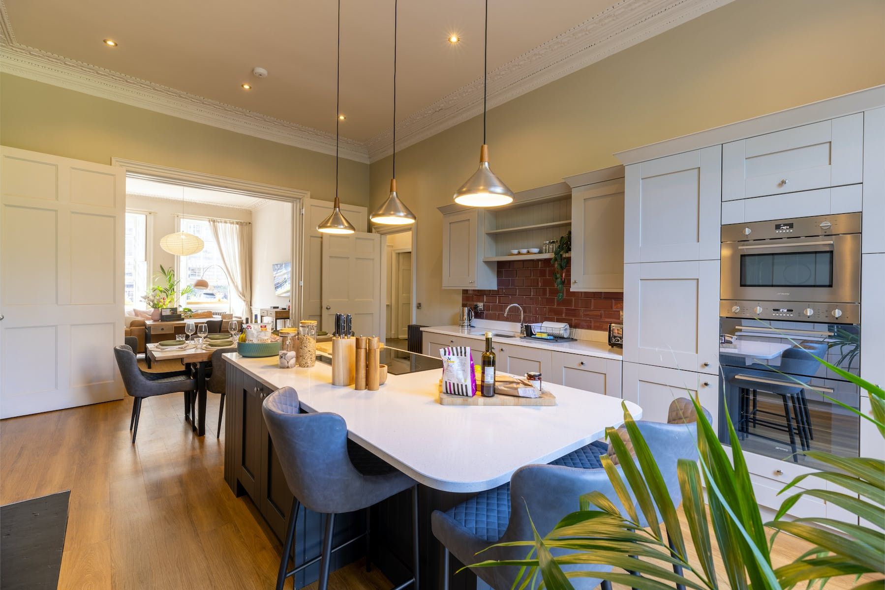 Tall corniced ceilings, wood floors and an abundance of light coming in through the sash windows create an instantly welcoming feel with chic, contemporary furnishings inviting you to make yourself at home. We love the living room’s large suede sofas that beckon relaxing evenings over a glass of wine by the period working fireplace, and the large kitchen bathed in natural light that’s ready to cater celebratory feasts aplenty. The three bedrooms, meanwhile, have each been carefully curated with a sophisticated touch and boast similarly large windows that give way to New Town views. We’re particularly fond of the main bedroom’s en-suite – a spa-like space with its rainfall shower and tempting tub, the latter providing the perfect end to a night with a glass of bubbly.