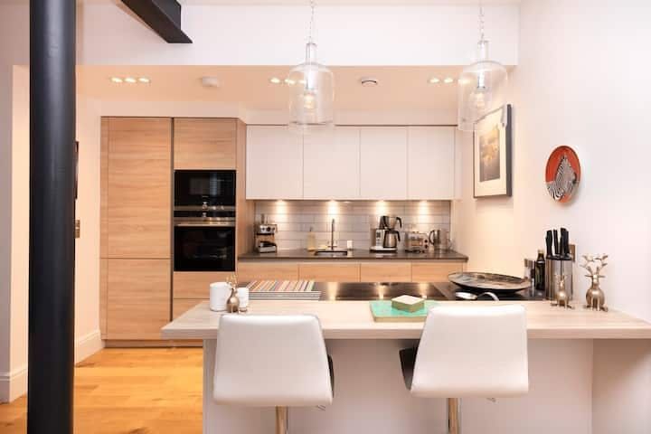 Situated in an elegant 1850s building in Edinburgh's theatre district, this beautiful home is a rarity indeed. It boasts Edinburgh Castle views from the entrance and a private outdoor space, complete with a gas fireplace and sofas. It's the perfect place for pre-theatre drinks or a wee dram at the end of the night. You may even be lucky enough to see one of the fireworks displays light up the sky around the castle.
