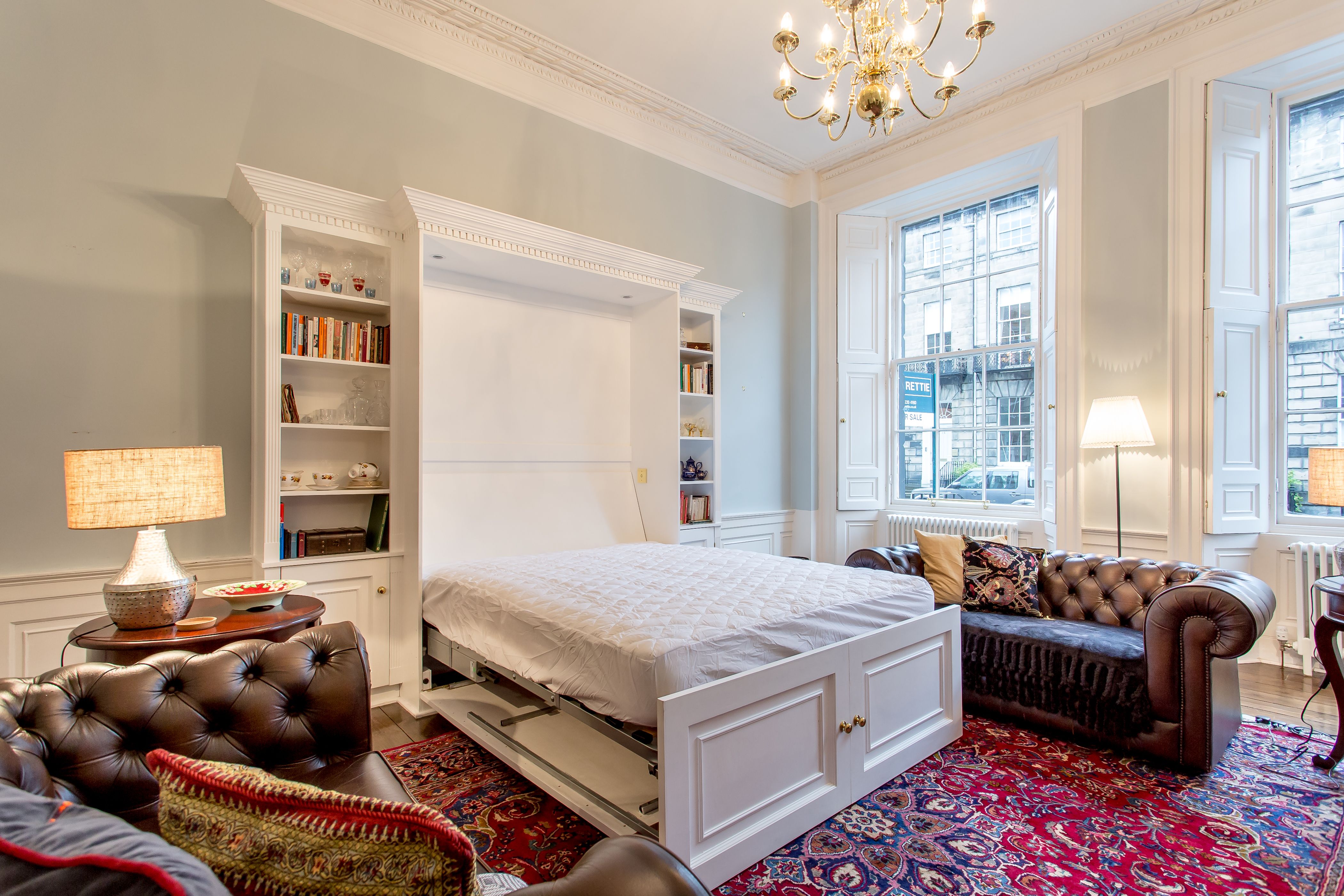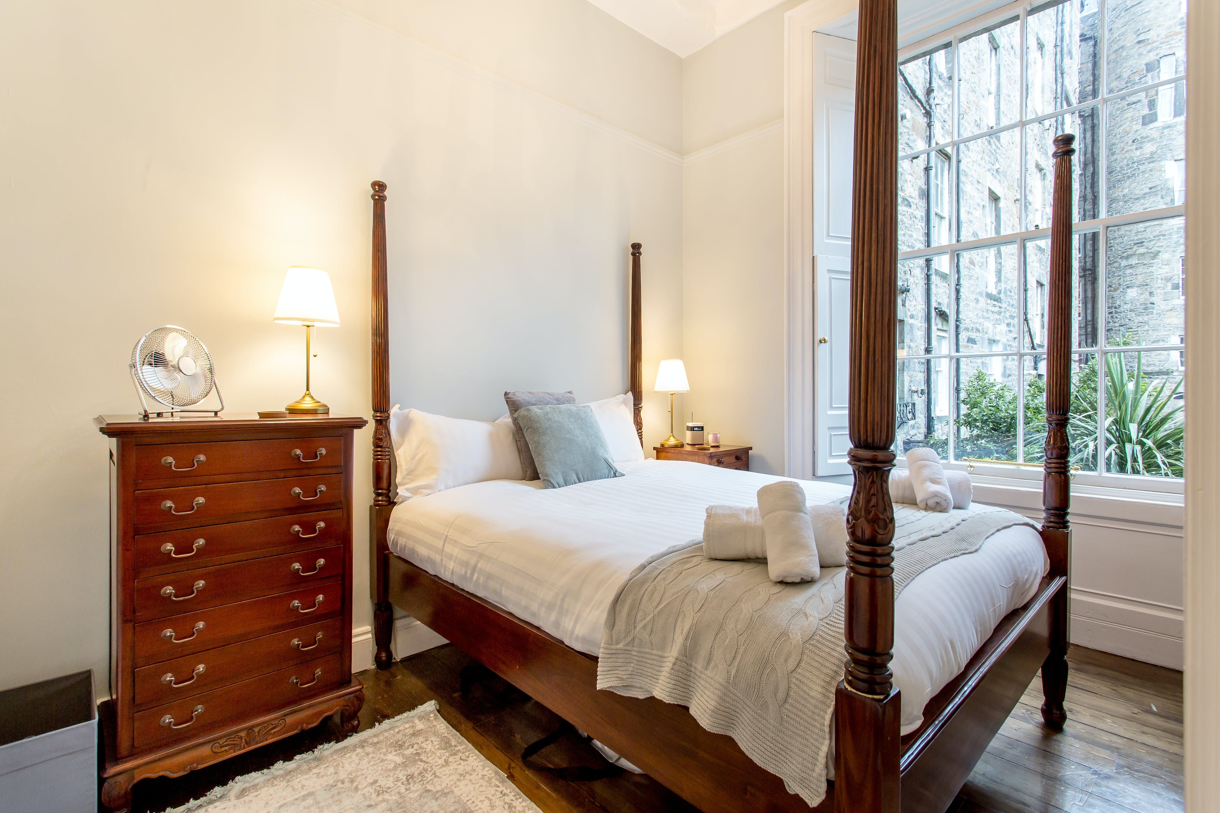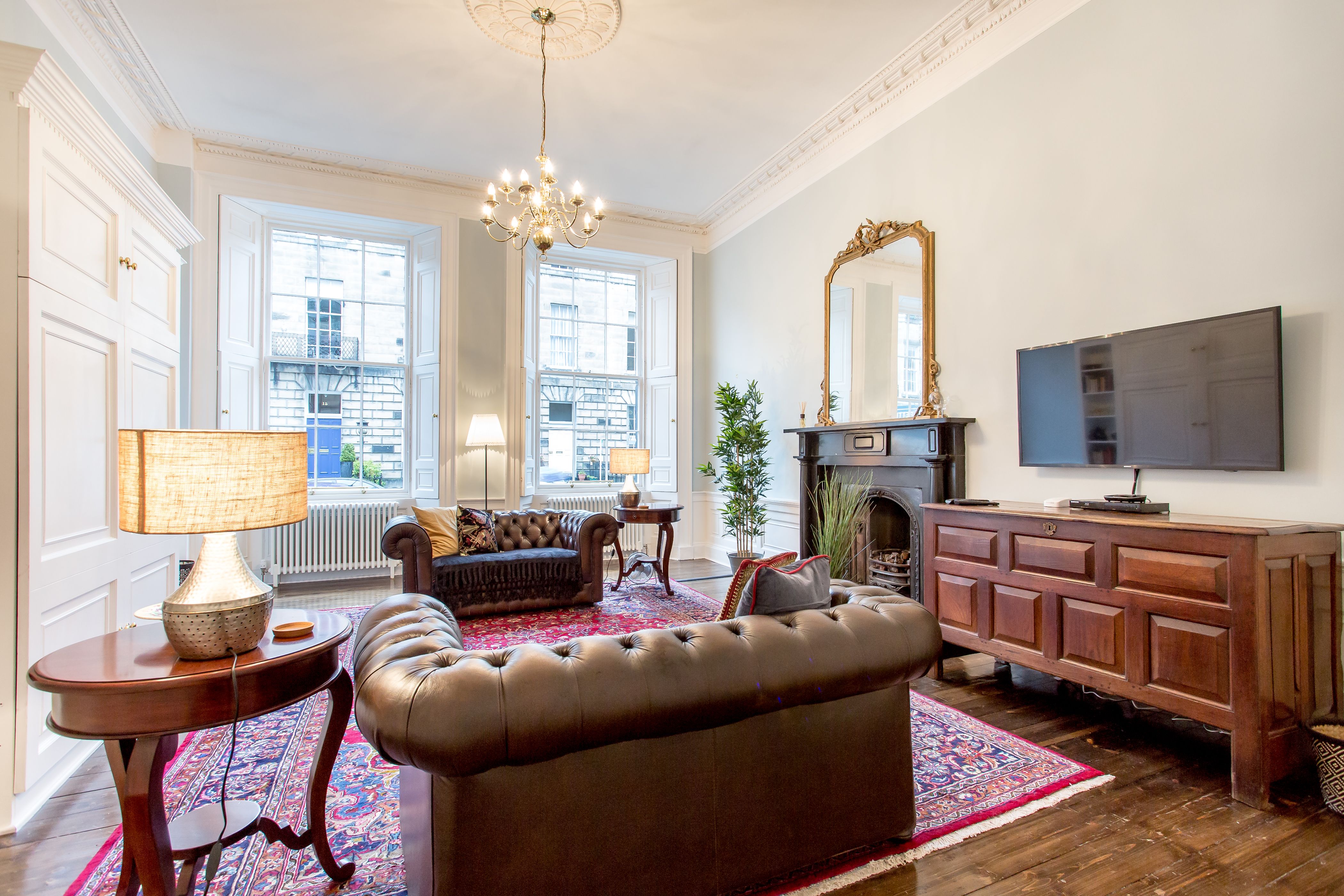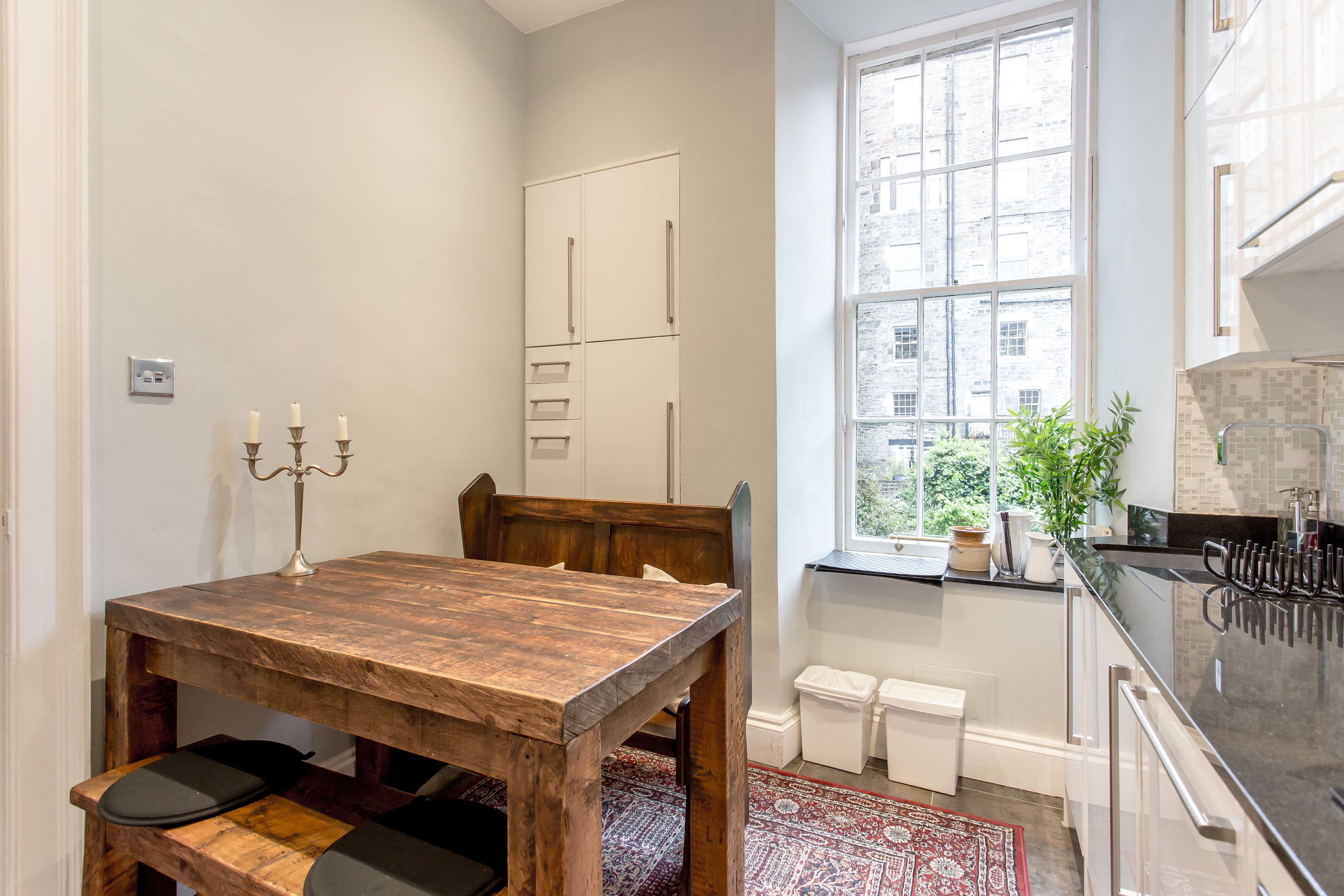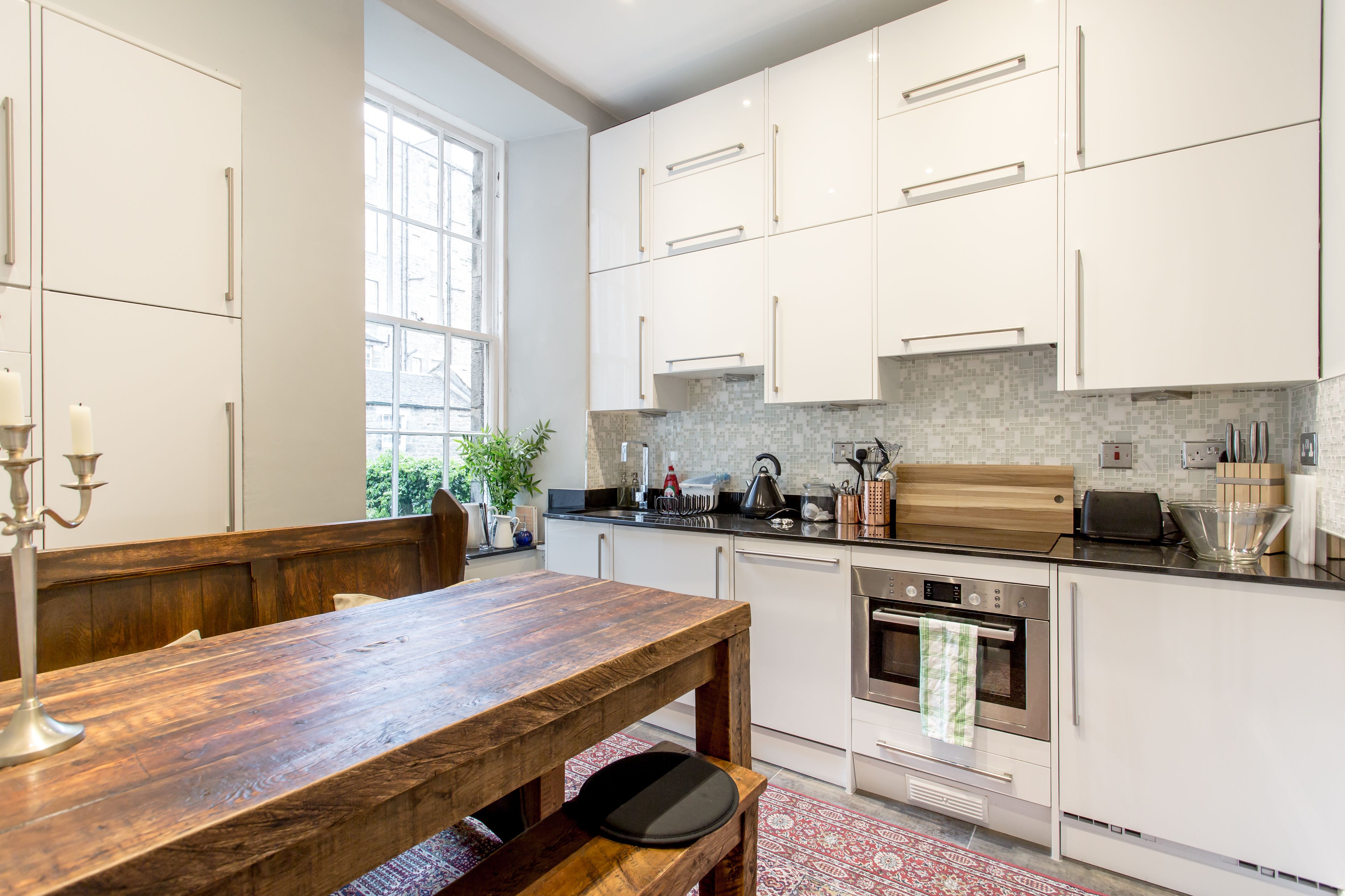 Sometimes you spot a grand-looking, historic building and think the interior could never live up to the impressive facade. That couldn’t be further from the truth for this apartment in Edinburgh’s New Town. The Georgian frontage and original features – think marble fireplaces, high ceilings, and hardwood floors – have been tastefully augmented with rich carpets, and antique and handmade furniture. It’s no wonder this place won a Hilden Style Award. You’ll find modern comforts in the sleek, white kitchen, though the solid wood table and crystal whisky decanter add a bit of old-world charm. This light-flooded city pad is a fantastic base for your Edinburgh stay and if you can peel yourself away from the grand Chesterfield sofas, you’re a ten-minute stroll from George Street, twenty from Edinburgh Castle and just over fifteen from the Royal Mile.