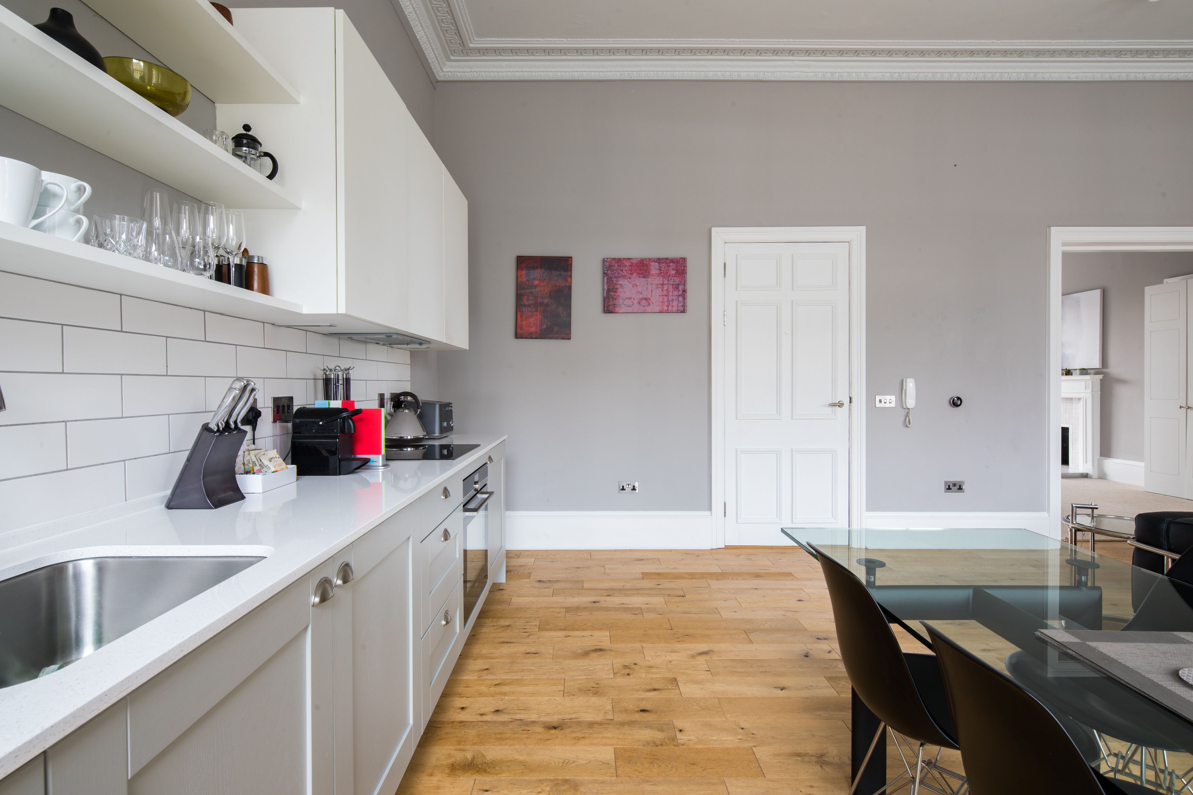Nestled between the regal buildings of Edinburgh’s UNESCO New Town, this beautiful apartment puts you right in the West End. With Princes Street a mere five minute walk away, you’ll not only wind up in the buzzing centre of the city, but also have the opportunity to catch a glimpse of the iconic Edinburgh Castle. Wander through the cosy neighbourhood and pop into one of the many restaurants serving fresh Scottish fare. To see the city’s more tranquil side, head to the Water of Leith walkway – a seven-minute stroll away – a traffic-free riverside path linking the beautiful Dean Village with Modern Art Galleries and beyond. If you wish to explore further afield, Haymarket Station is a stone’s throw away – from here you’ll be able to make a number of day trips around the country by rail.