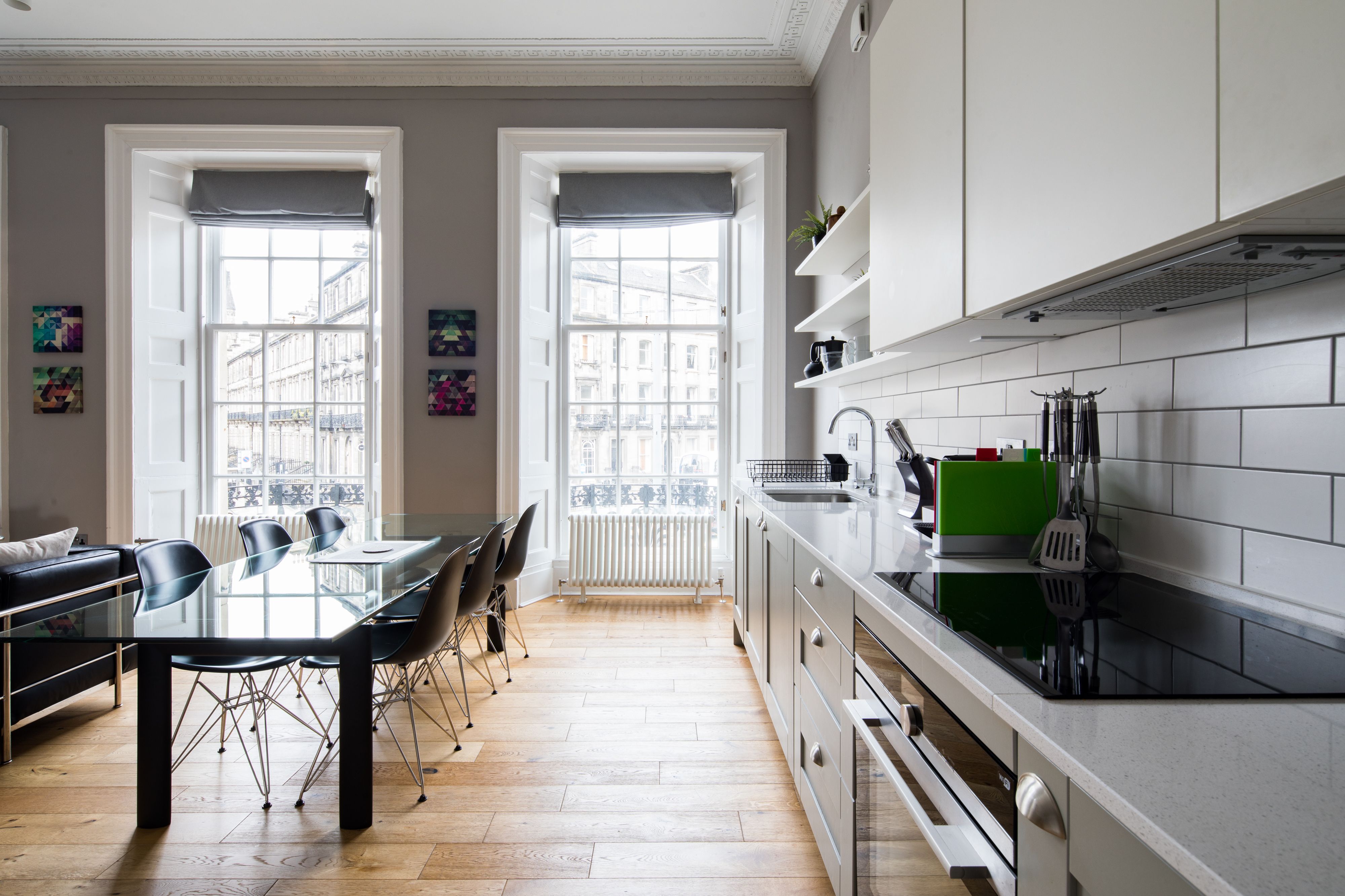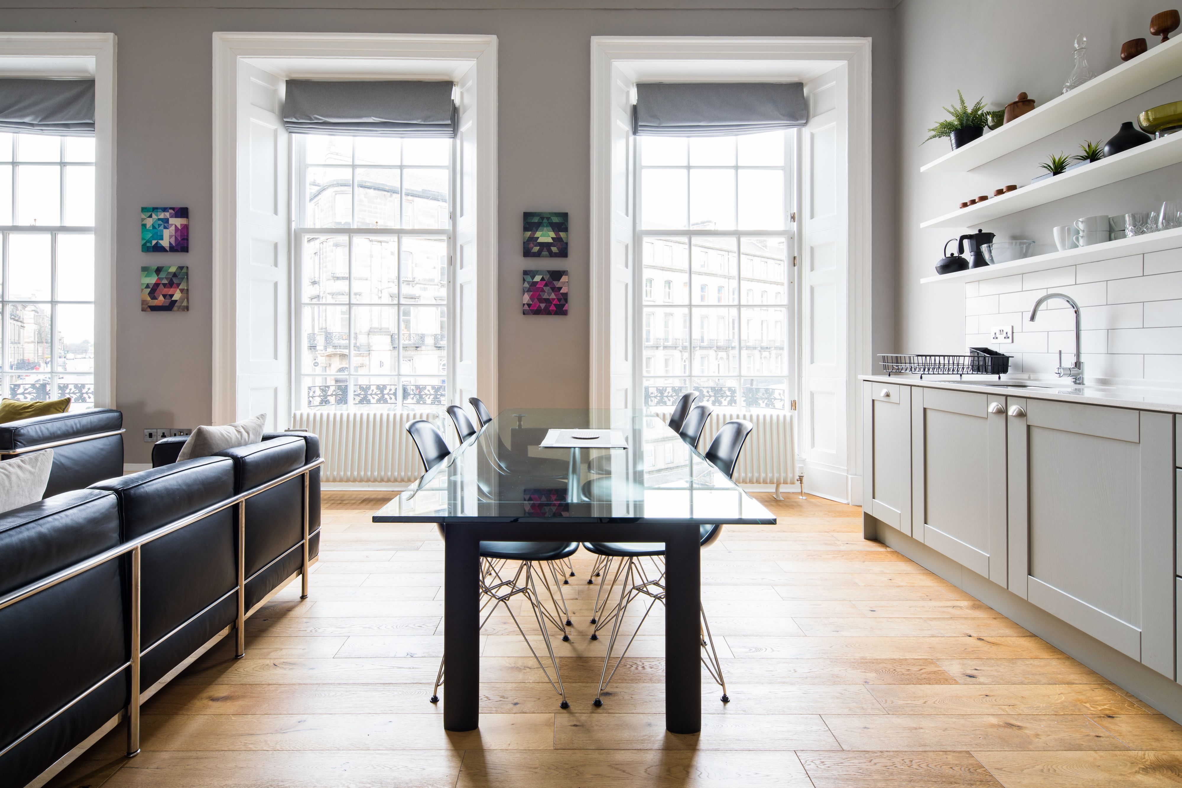 Back at this home, you’ll find the open living area brimming with vibrant artwork that sits in stark contrast with the otherwise neutral colour palette. There are plenty of period details, including corniced ceilings and huge sash windows, that blend perfectly with contemporary designs in this Georgian apartment. Speaking of windows – they let in plenty of light, which really contributes to how natural and relaxing this home feels. If you’re one for afternoon naps, you’ll be very taken by the sheer size of this bedroom. Doze off on the comfy bed as the afternoon sun starts to dip and wake up refreshed to head out for a night on the town.