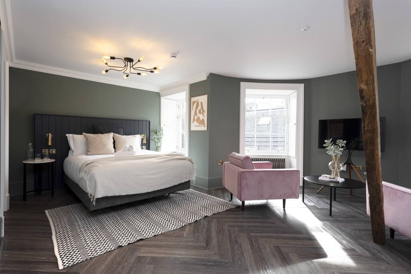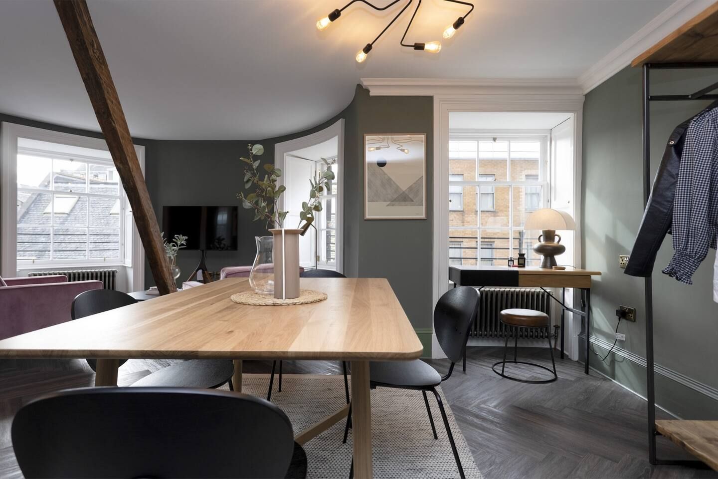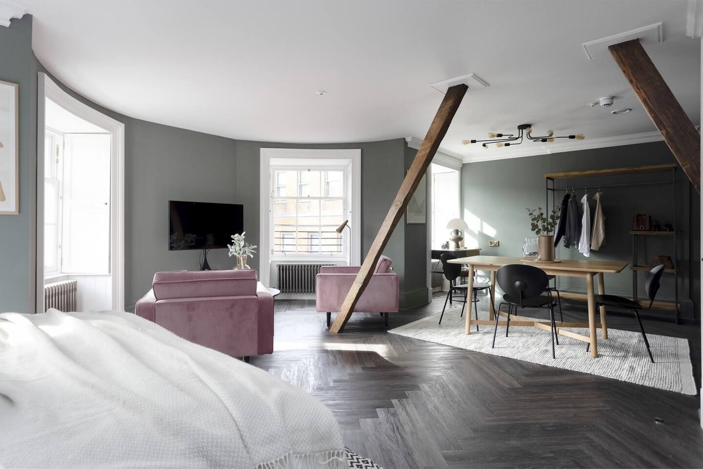 Housed in a beautifully preserved Georgian townhouse, this chic apartment in Edinburgh’s New Town will make you feel right at home. We love the contrast between the dark wood floors, sage-coloured walls and blush pink armchairs, creating a soft and intimate setting for a relaxing stay. Although a studio apartment, space is cleverly maximised here thanks to clever design details, like the wooden floor-to-ceiling beams that create a separation between the living and dining areas, and the cute kitchenette concealed within a stunning feature cabinet. After waking up and enjoying a soak under the tiled bathroom’s rainfall shower, head out for a stroll around Queen Street Gardens, just across the road. You’re also just a six-minute walk from shop-lined Princes Street, a twelve-minute walk from Edinburgh Castle and a fourteen-minute amble from Calton Hill with its panoramic views over the city.
