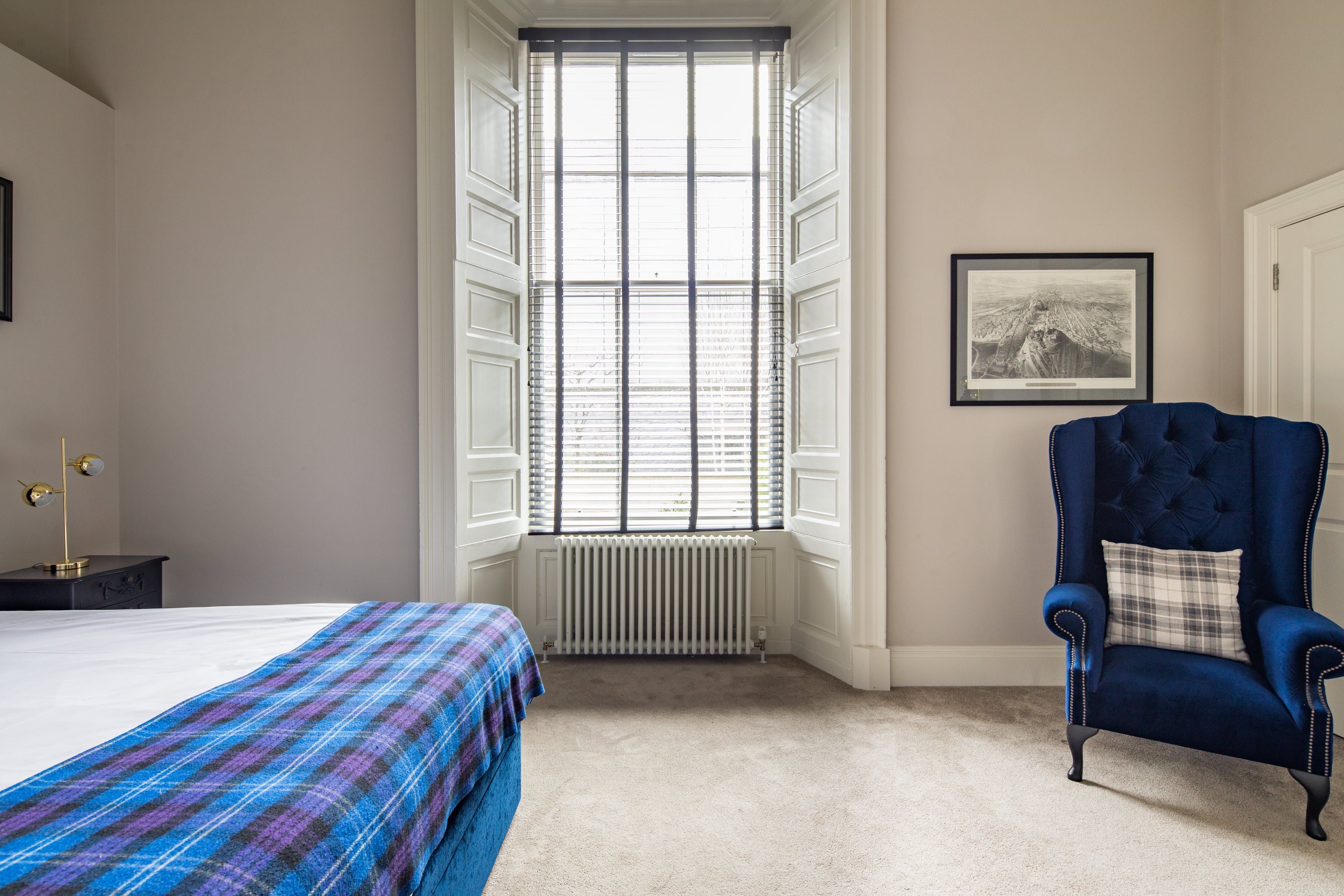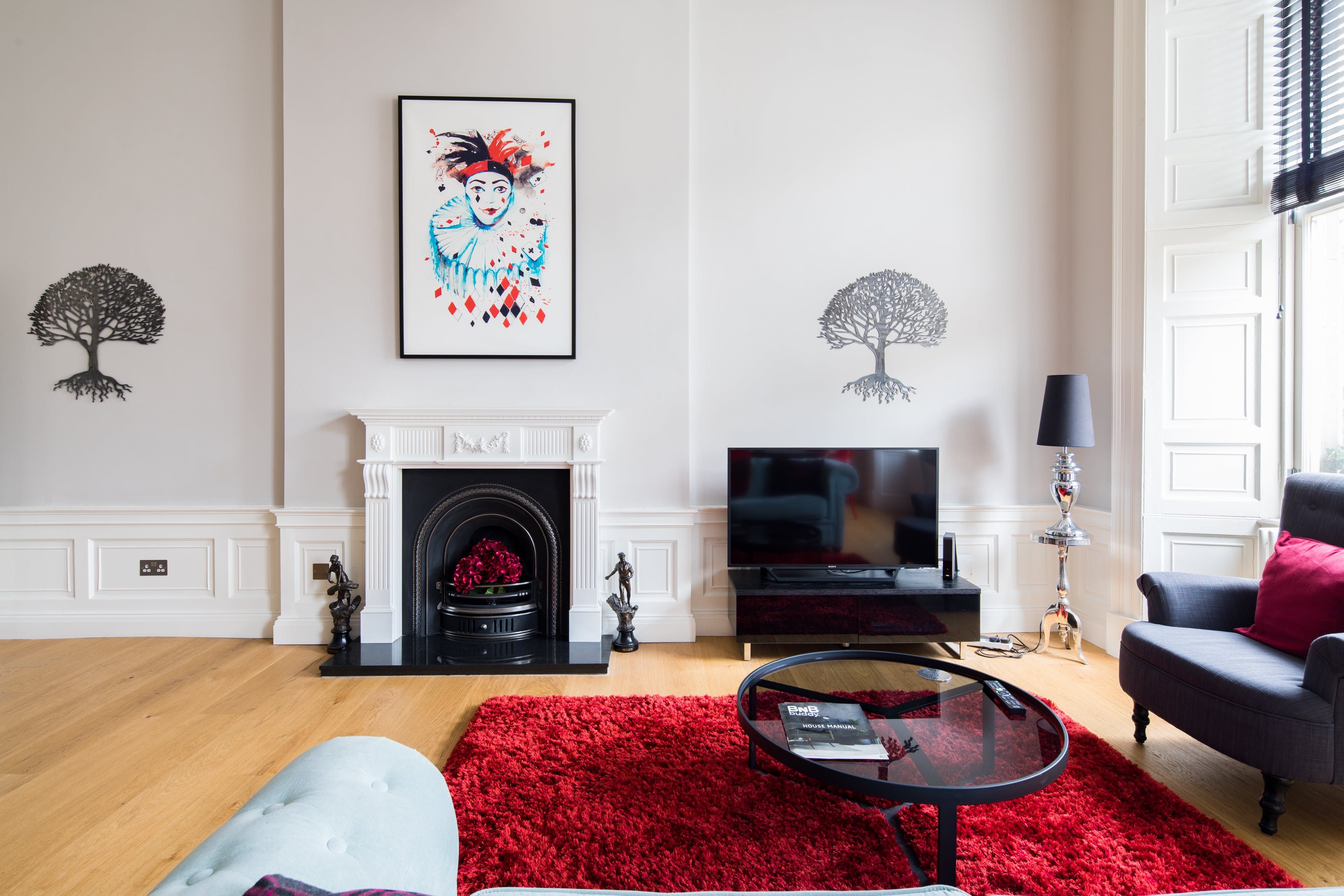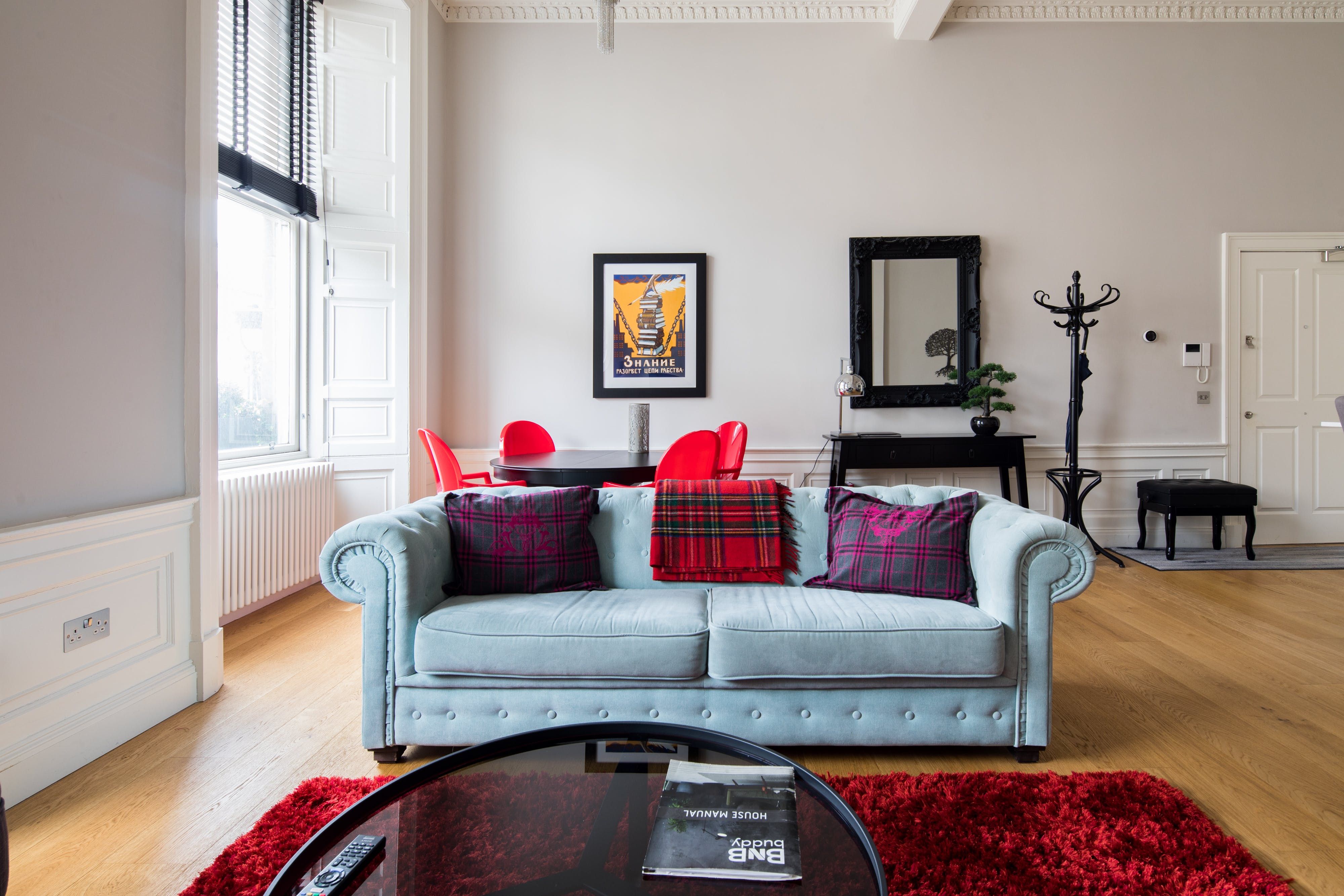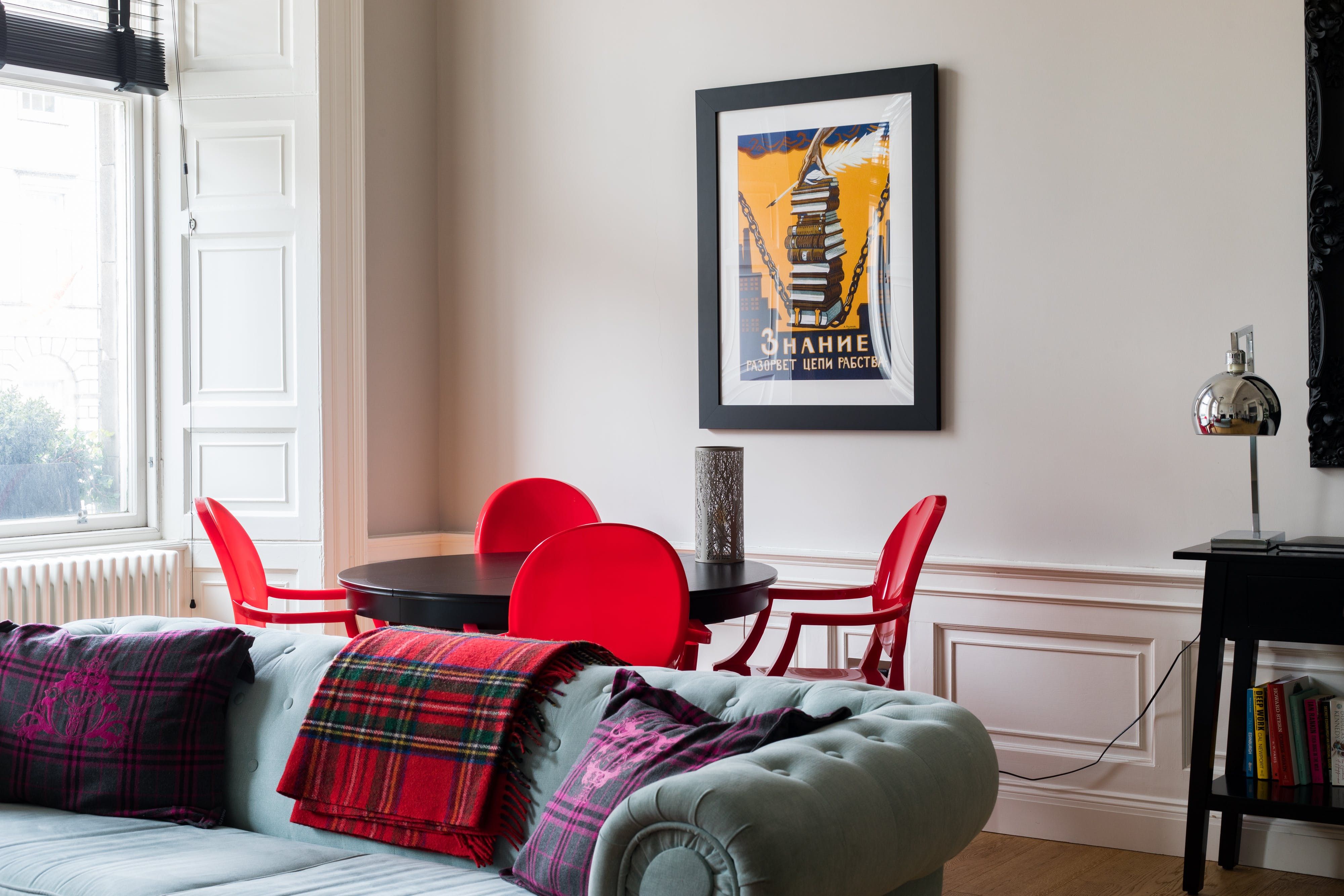 Playful and bold, this homey apartment has a lot going for it. It's packed with traditional Georgian features, yet there are plenty of modern updates that really make this place sing. The sleek kitchen has a stylish breakfast bar and is perfectly sized for rustling up meals, and there's no better spot to kick back and relax than the open living space. With its plush sofa, vibrant red accents and ornamental fireplace, there's an old-world parlour feel to this room that we find utterly charming. Cosy and contemporary, you'll love coming home to this apartment after a day out and about. Located just off Queen Street, this part of town is where you'll find lovely cafes, trendy bars and delicious restaurants. It's not far from Waverly Station β about an eight-minute walk β and both picturesque Old Town and Edinburgh Castle are about fifteen minutes away.