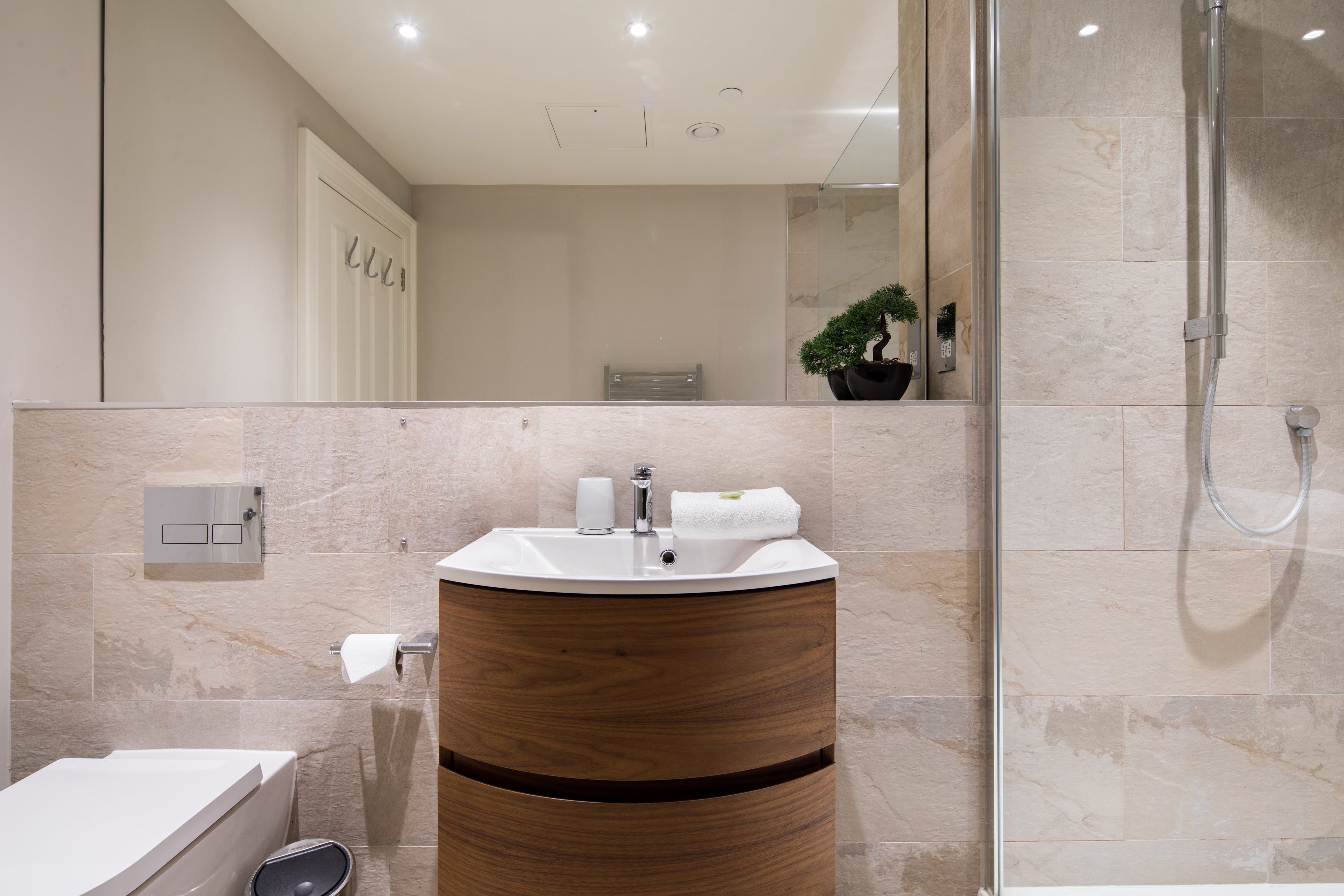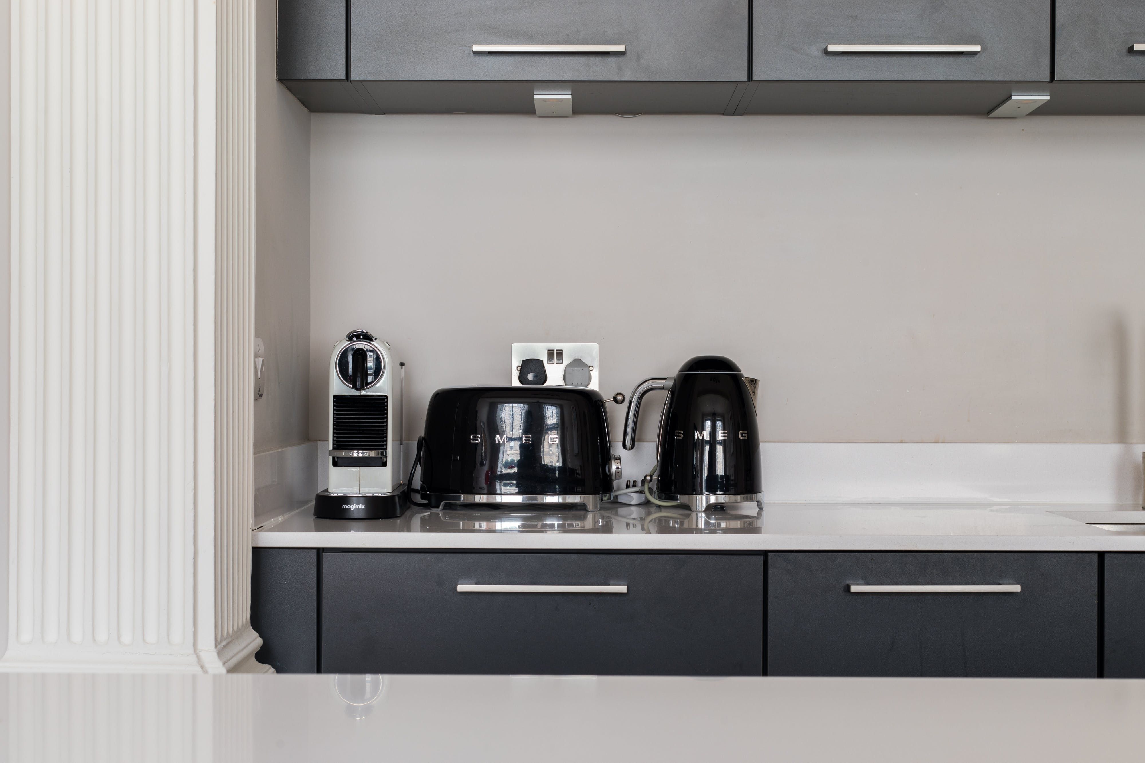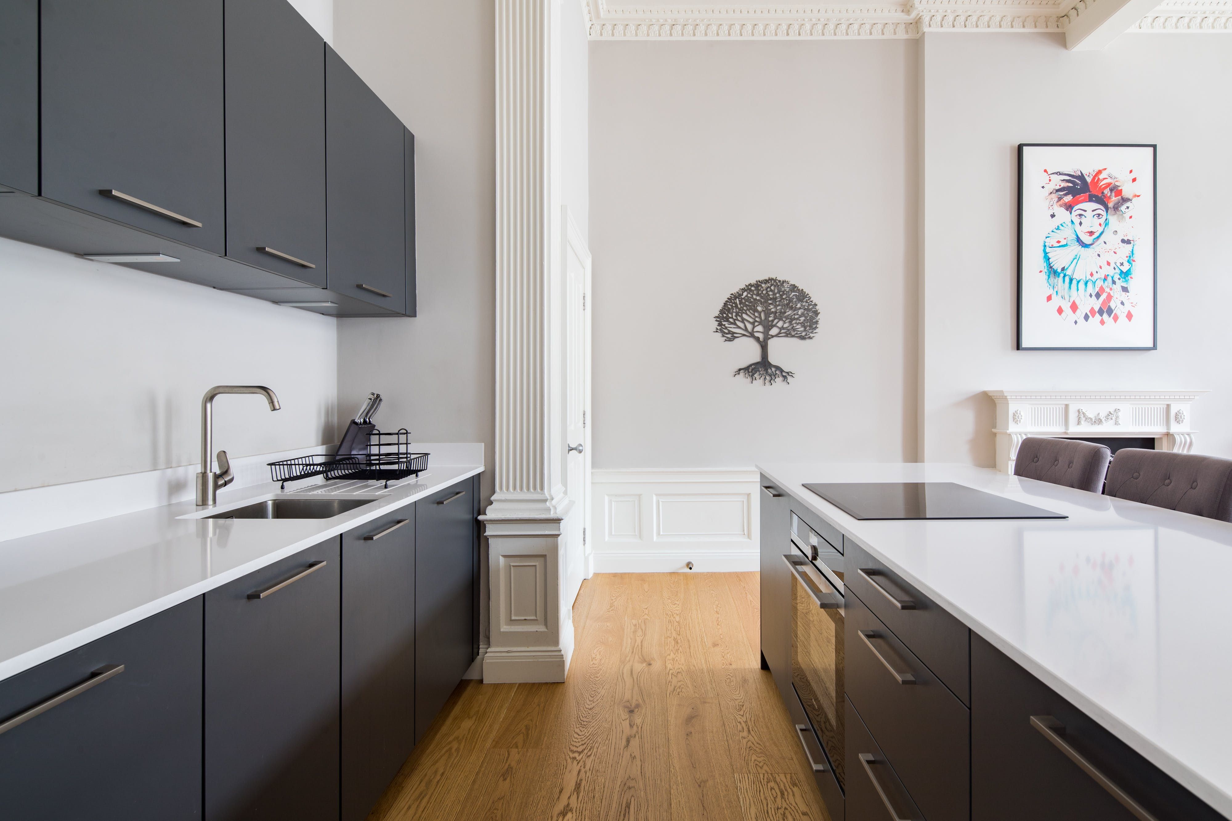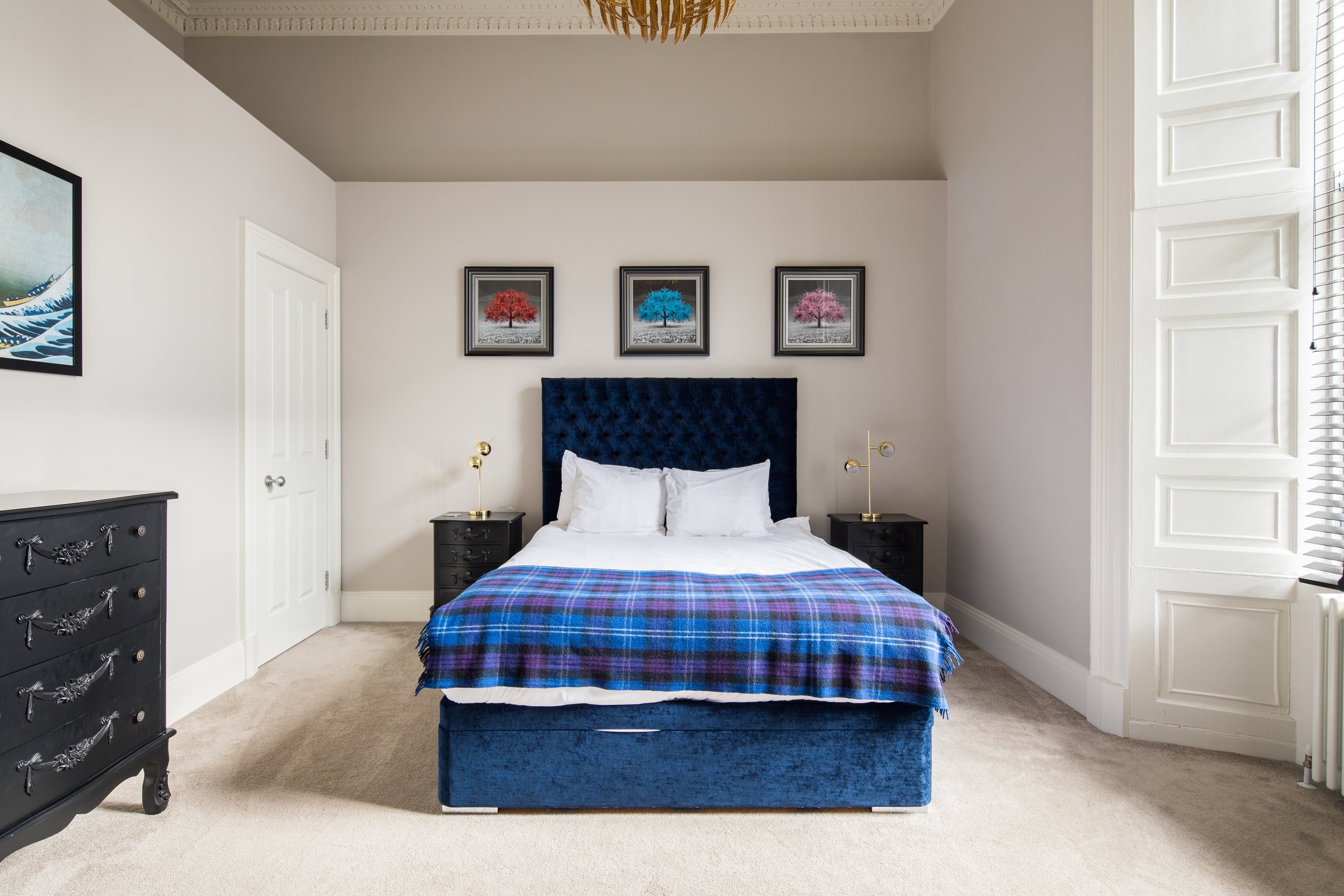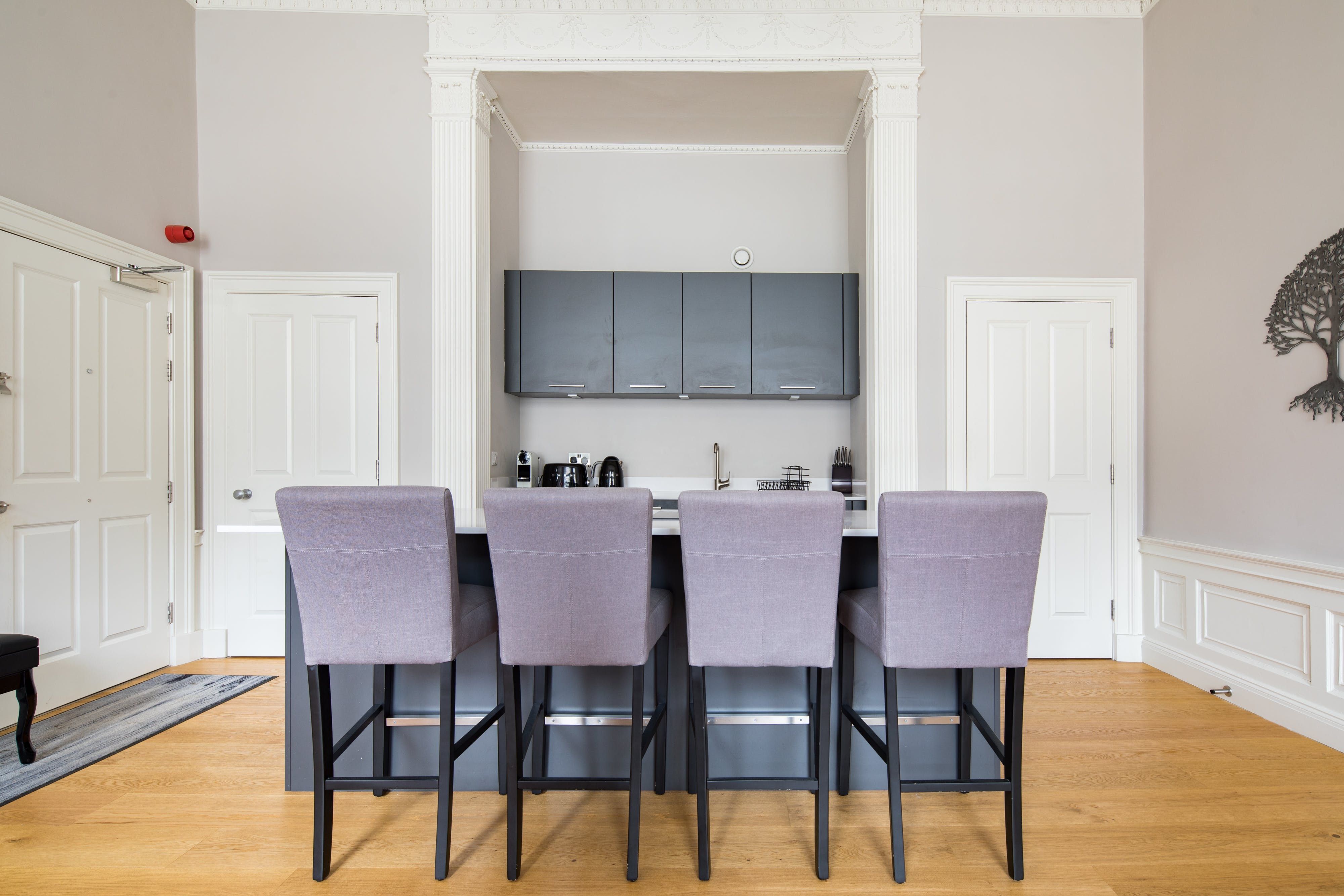 Playful and bold, this homey apartment has a lot going for it. It's packed with traditional Georgian features, yet there are plenty of modern updates that really make this place sing. The sleek kitchen has a stylish breakfast bar and is perfectly sized for rustling up meals, and there's no better spot to kick back and relax than the open living space. With its plush sofa, vibrant red accents and ornamental fireplace, there's an old-world parlour feel to this room that we find utterly charming. Cosy and contemporary, you'll love coming home to this apartment after a day out and about. Located just off Queen Street, this part of town is where you'll find lovely cafes, trendy bars and delicious restaurants. It's not far from Waverly Station β about an eight-minute walk β and both picturesque Old Town and Edinburgh Castle are about fifteen minutes away.