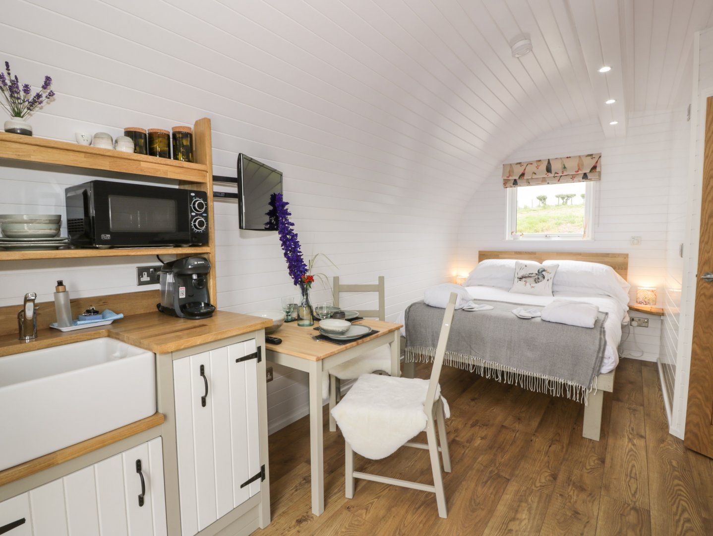 Accomodation Details Single-storey. Studio-style layout with double bed, kitchen, dining area and sitting area with sofa bed. Shower room with walk-in shower, basin and WC