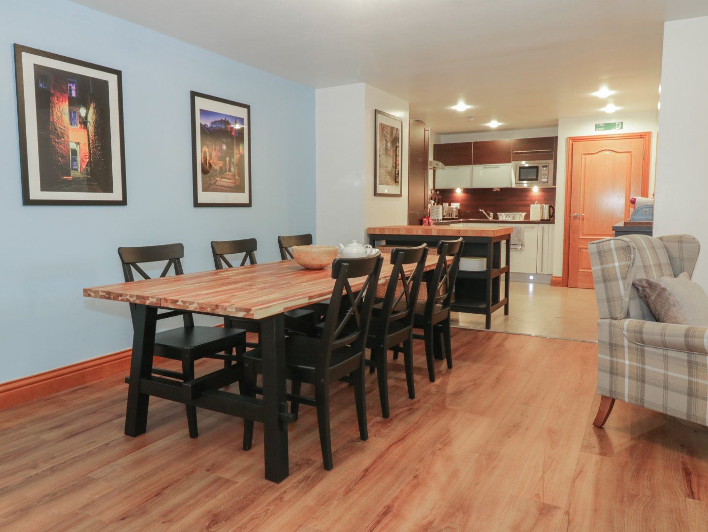 First-floor apartment. Two bedrooms: 1 x king-size with en-suite walk-in shower, basin and WC, 1 x family room with single and bunk. Bathroom with bath, walk-in shower, basin and WC. Open-plan living space with kitchen, dining area and sitting area