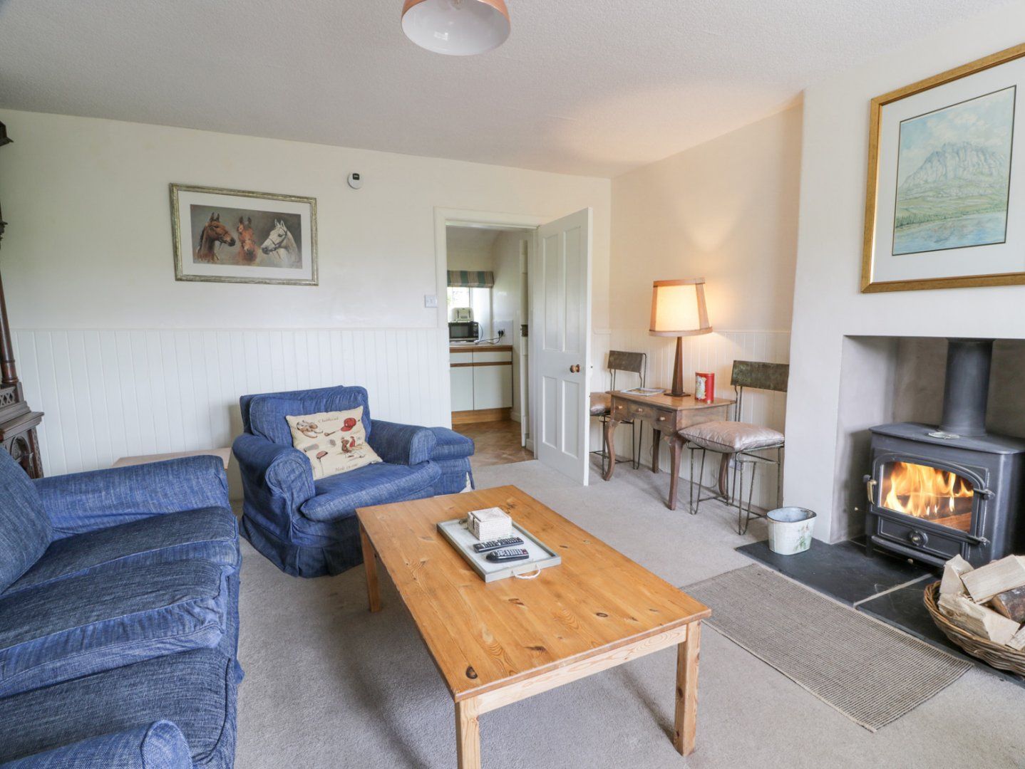 Oil-fired central heating. Electric oven and hob, microwave, fridge with ice box, washing machine. Smart TV, WiFi. Fuel, power, and starter pack for woodburning stove inc. in rent. Bed linen and towels inc. in rent. Off-road parking for 1 car to the front, with additional to the rear. Enclosed rear garden with lawn and furniture. One well-behaved dog welcome. Sorry, no smoking. Shop 6.1 miles, and pub 6 miles. Note: There are steps in the garden and a step up into the home; please take care
