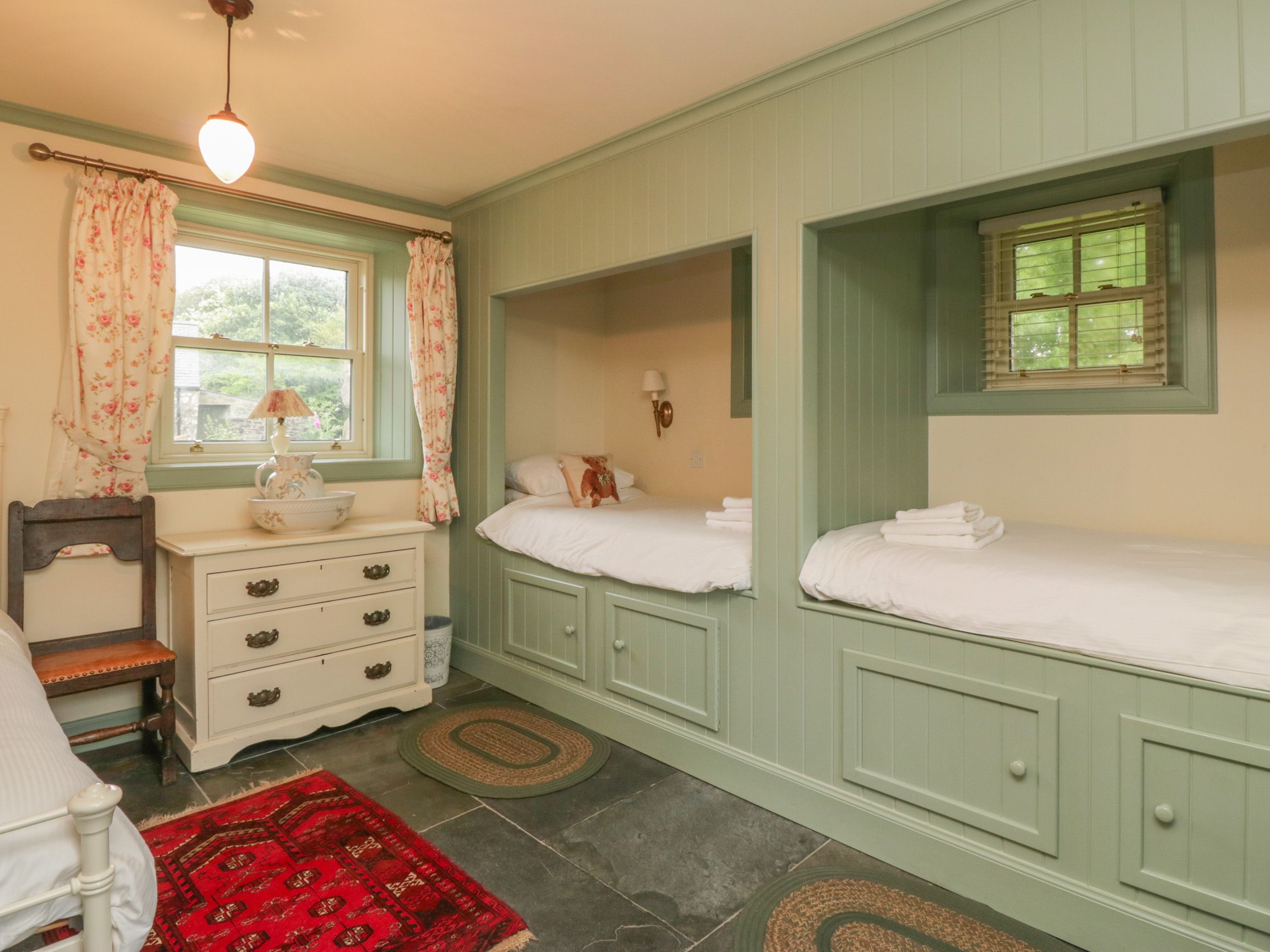 Accomodation Details All ground-floor. Two bedrooms: 1 x four-poster double with woodburning stove, 1 x triple. Bathroom with shower over bath, basin and WC. Open-plan living/kitchen/dining room with woodburning stove