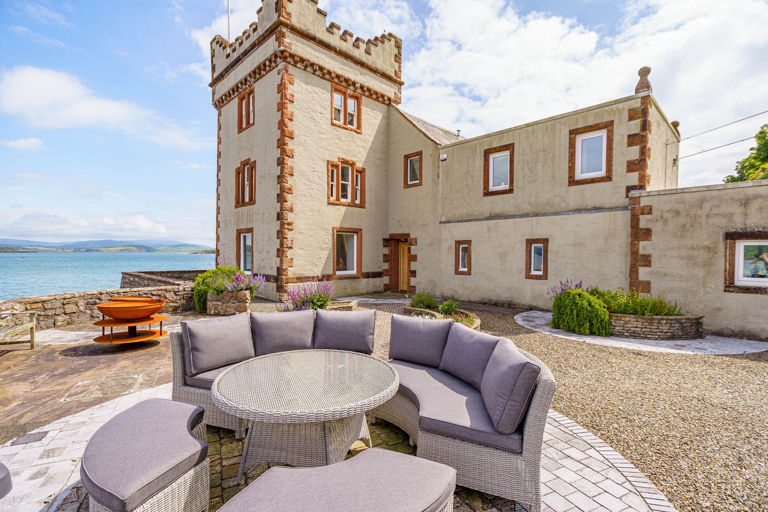 Holiday home Balcary Tower consists of a kitchen with oven, hob, microwave, fridge, freezer, and dishwasher, a utility with washing machine and tumble dryer, a dining area, a dining room, a sitting area and sitting room with TV and woodburning stove, plus a cloakroom. The bedrooms consist of a king-size with en-suite bath, ground-floor double, double with en-suite bath, and second-floor double, serviced by a bathroom and Jack-and-Jill shower room. WiFi, fuel, power, bed linen, and towels inc. in rent. Outside, there is a front garden with patio, furniture, fire pit, and barbecue, a garage for storage, and off-road parking. Two well-behaved dogs welcome. Sorry, no smoking. Escape to Balcary Tower. Note: Dogs are not allowed on carpeted floors. Note: Steps throughout the property. Note: No guest access to the sea rock pool. Note: Pond in the garden and paths leading to cliff garden have rough steps, low walls/no walls, and steep drops near the path. Note: Good Housekeeping Bond of 450 GBP.