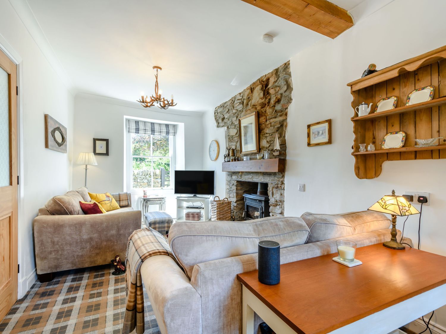 Oil central heating. Electric oven and hob, microwave, fridge/freezer, dishwasher. TV with Freeview, DVD, WiFi, selection of books, games and DVDs. Fuel, power and starter pack for woodburning stove inc. in rent. Bed linen and towels inc. in rent. Cot and highchair available on request (sheets not included). Parking at the front of the property and roadside on the main street. Side patio with furniture. One well-behaved pet welcome. Sorry, no smoking. Shop 0.1 miles, pub 0.3 miles. Note: En-suite WC accessed down two steps from bedroom. Note: Mobile signal can be intermittent. Note: Check in time is 3pm, Check out time is 10am. Please note: this property only accepts bookings Friday to Friday