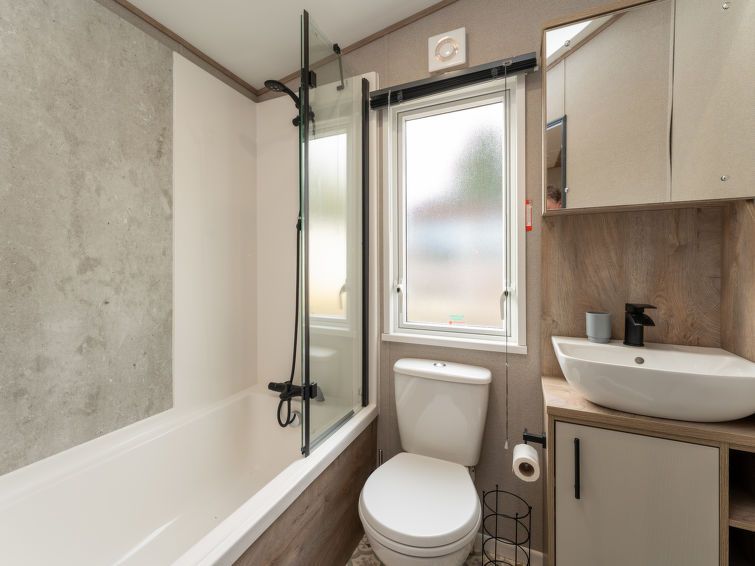 3-room chalet. Open living/dining room with dining table and TV. Exit to the terrace. 1 double bedroom with 1 double bed and bath/shower/WC. 1 small children's room with 2 beds. Open kitchen (toaster, kettle, microwave, freezer, grill). Shower/WC. Heating. Terrace furniture. Facilities: children's high chair, baby cot for up to 2 year olds.