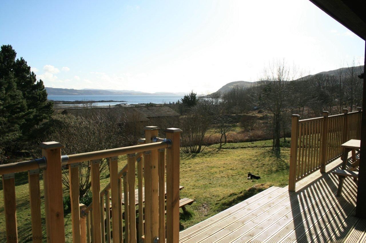 Bluebell Lodge is a lovely wooden house set in a large garden with stunning views over the sea to the Isle of Mull. Located on the hillside in the crofting village of Kilchoan, Bluebell Lodge is ideally situated to explore the charming village and the beautiful Ardnamurchan countryside that encompasses it. It’s a short stroll to the local pub, tearoom and village shop as well as the ferry crossing to the many coloured houses, cafes and restaurants of Tobermory, on the Isle of Mull. Comfortably furnished, Bluebell Lodge is suitable for families and groups of friends. The property has floor to ceiling windows allowing wonderful light and uninterrupted sea views throughout the day, and a wood burning stove to ensure you stay cosy on cooler evenings. At the front of the house, there is a wooden deck with seating and a BBQ overlooking a large, secluded garden, ideal for children to play on. To the side the garden stretches to a small river and wooded area with more seating. On one level: A large and airy living room with dining area and kitchen. One double bedroom, two twin bedrooms, a bathroom with bath, shower and toilet, additional separate toilet and washbasin. Garden: Surrounded by open garden and front decking.