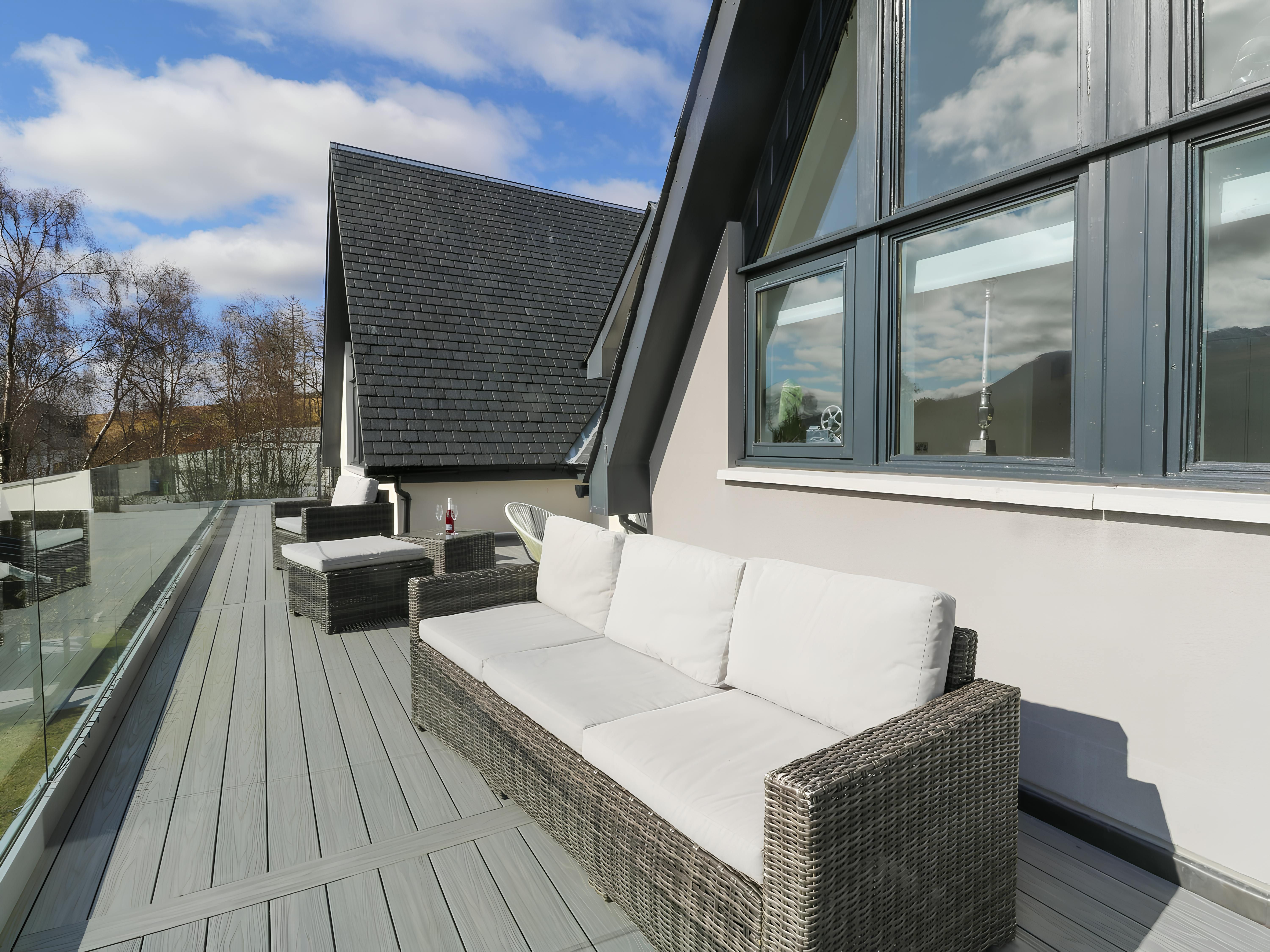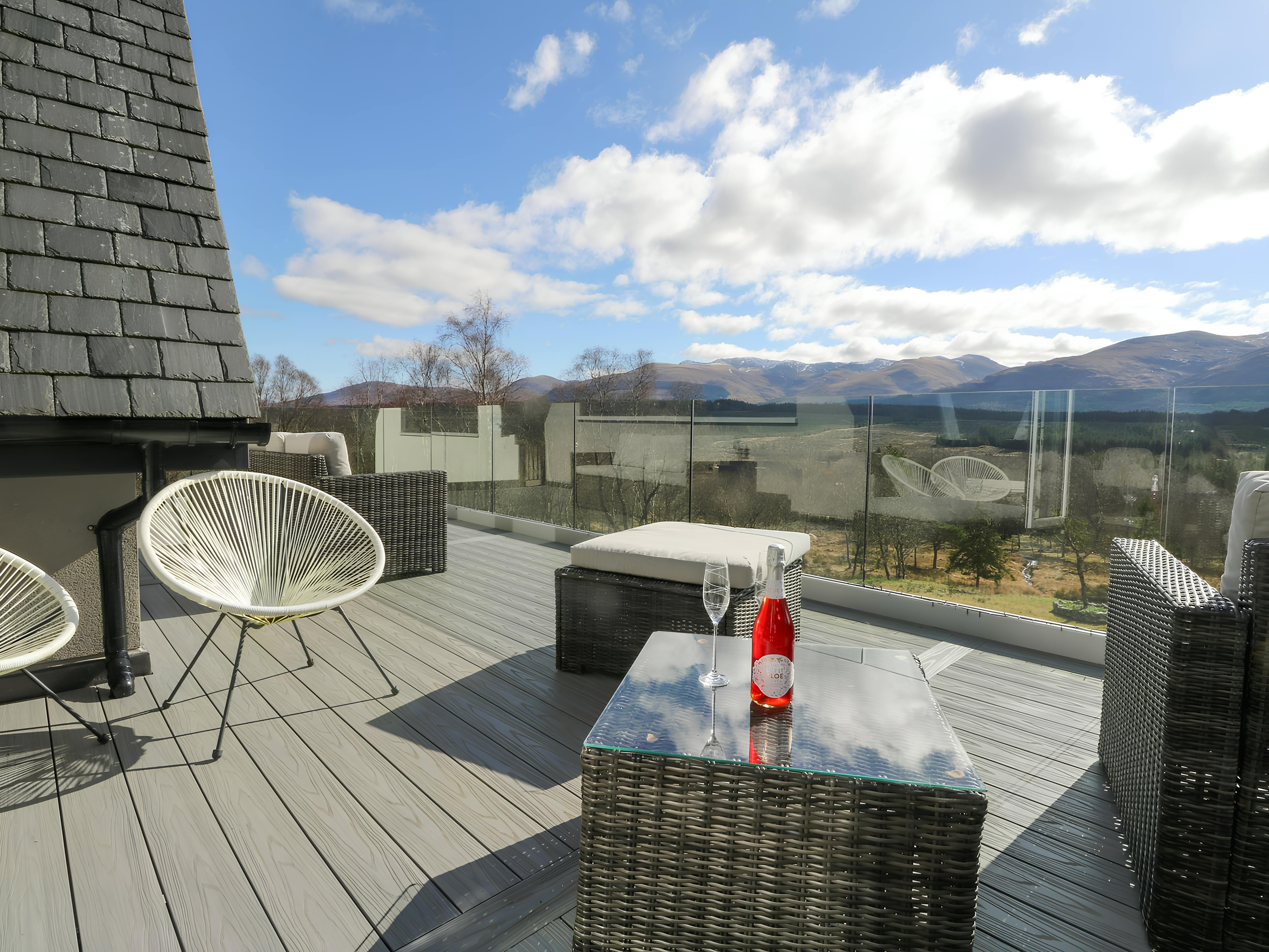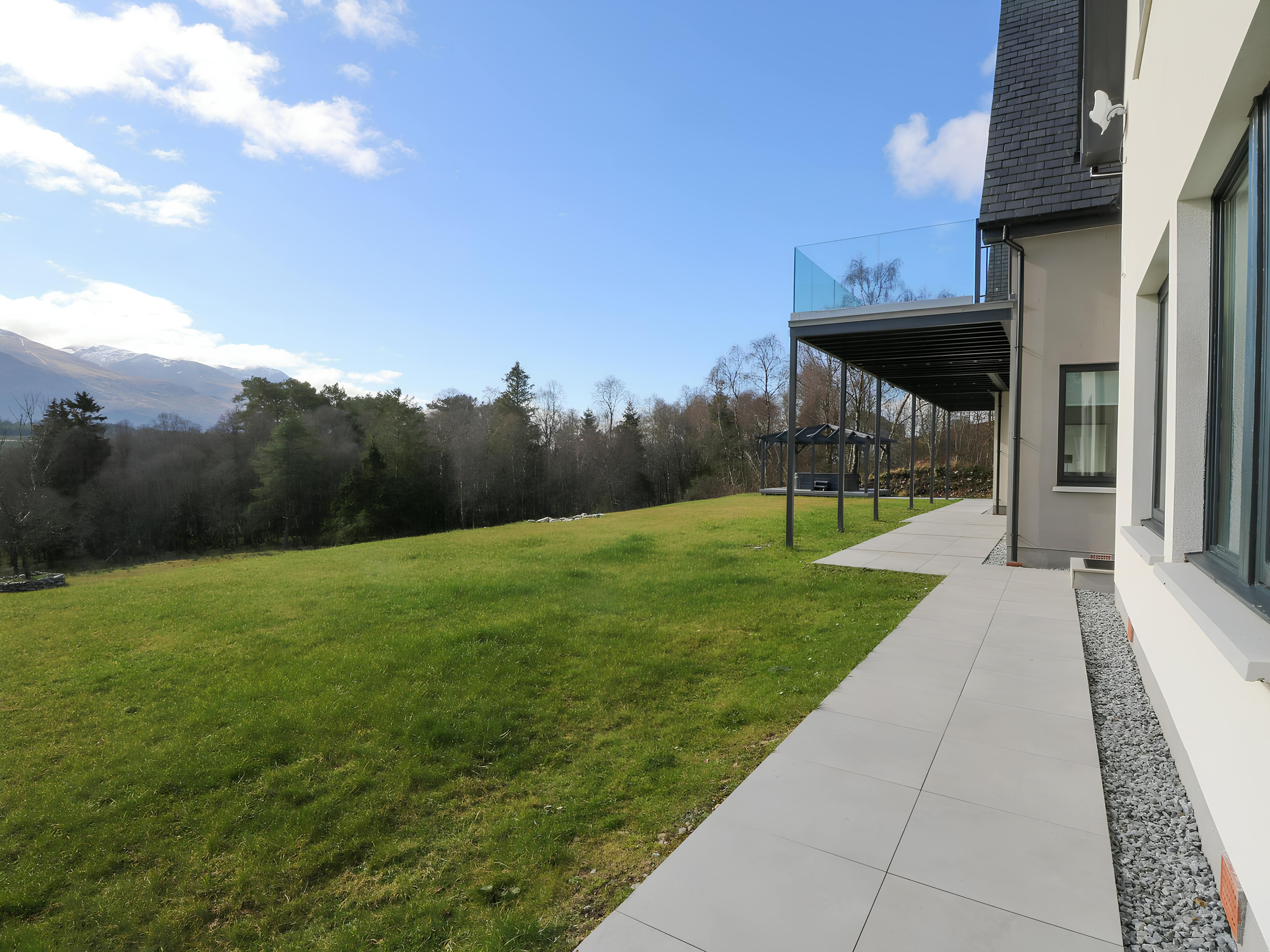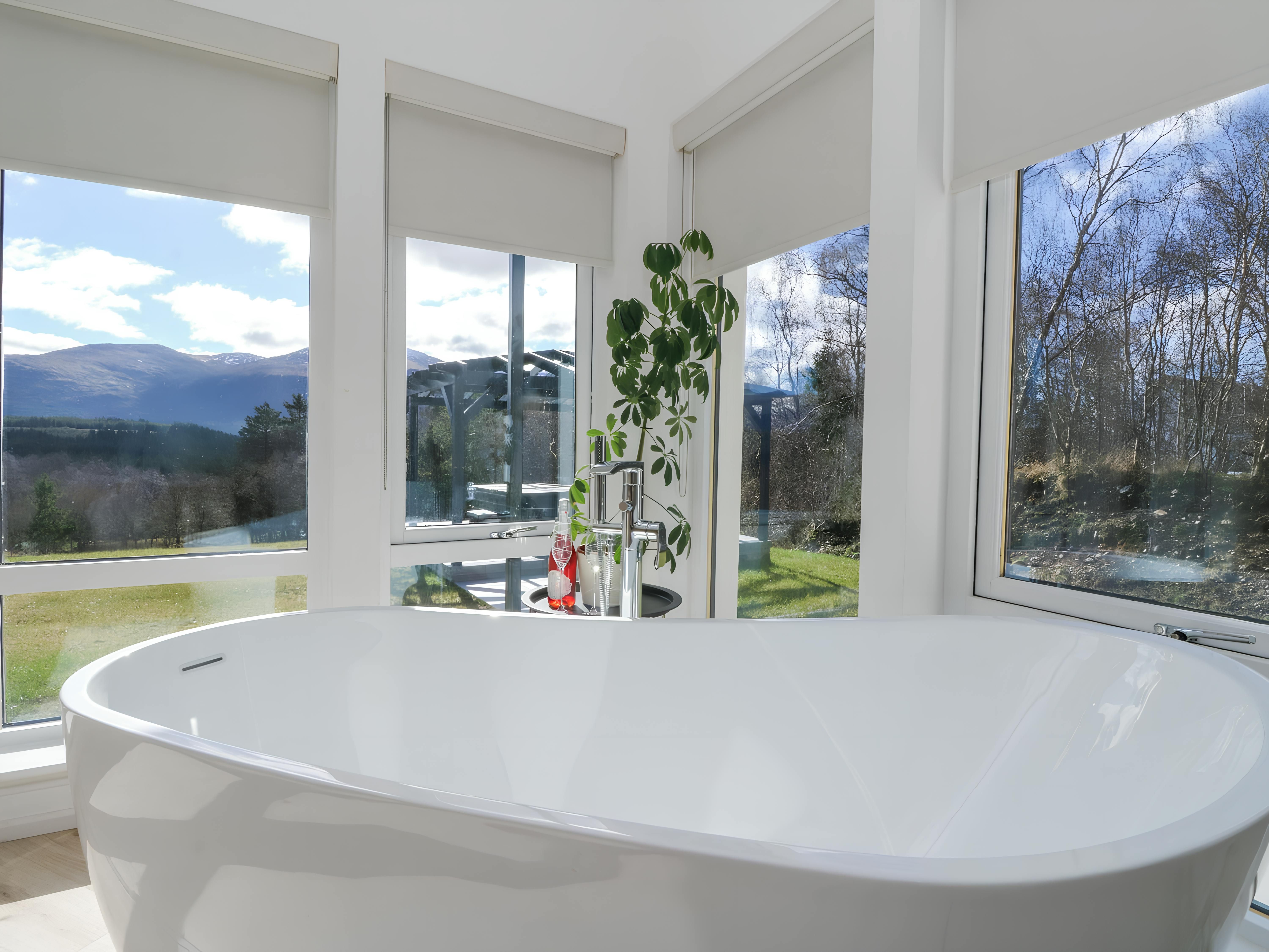 Down the river from Spean Bridge, this expansive ranch offers large groups an excellent base for exploring and admiring the Scottish Highlands. While its modern sensibility may mean some areas feel sparse, there's no shortage of space across the home's reversed levels – the open plan living room, dining area and double-equipped kitchen are found upstairs, with sweeping balcony views. Downstairs you'll find three of five bedrooms (all with en-suite bathrooms, three with super king-size beds, only one with a free standing bath tub) plus access to the rolling rear lawn, which features a large inviting hot tub. If you're planning to scale Ben Nevis, the visitor centre is a fifteen minute drive away, as is the town of Fort William.