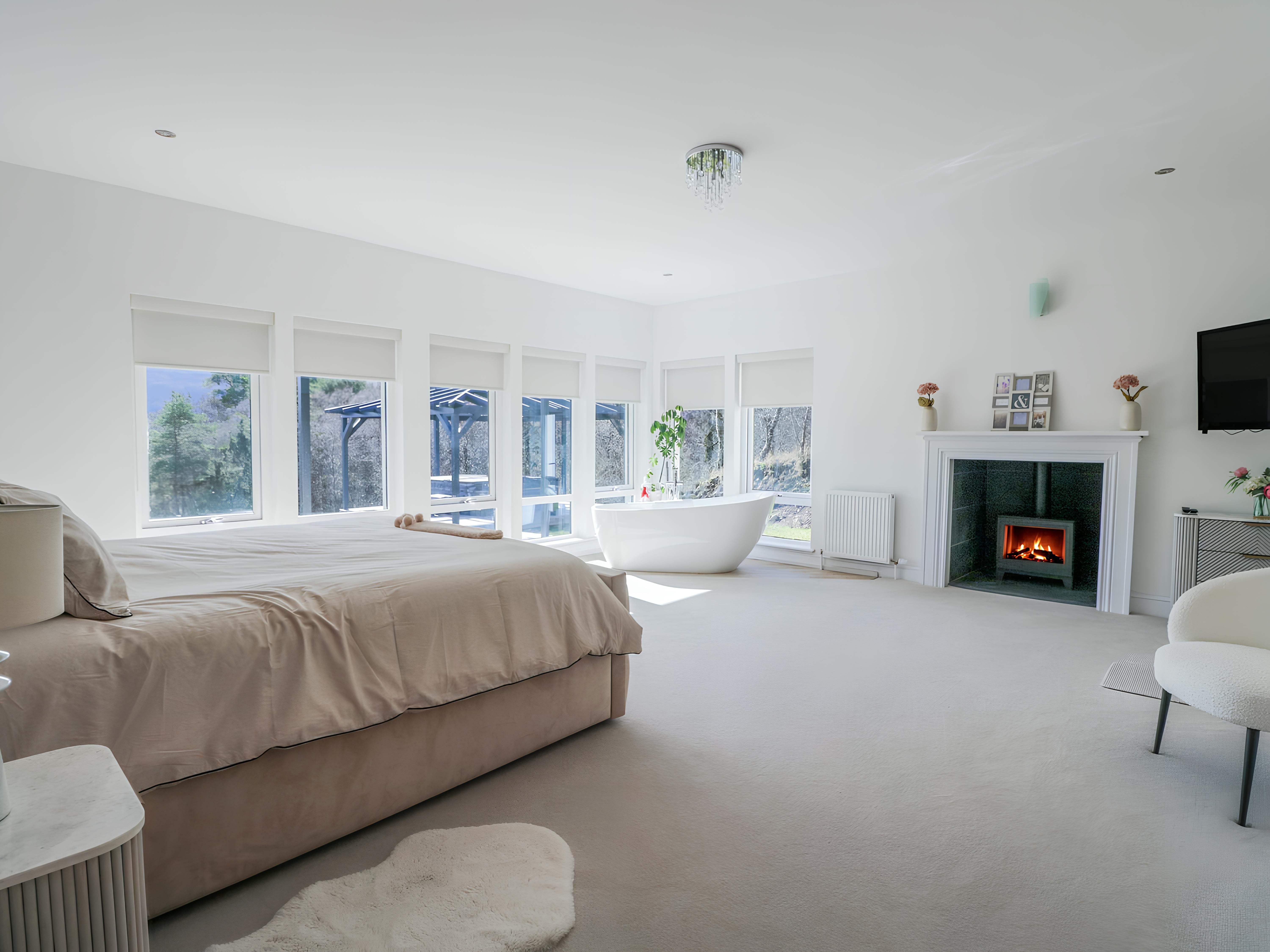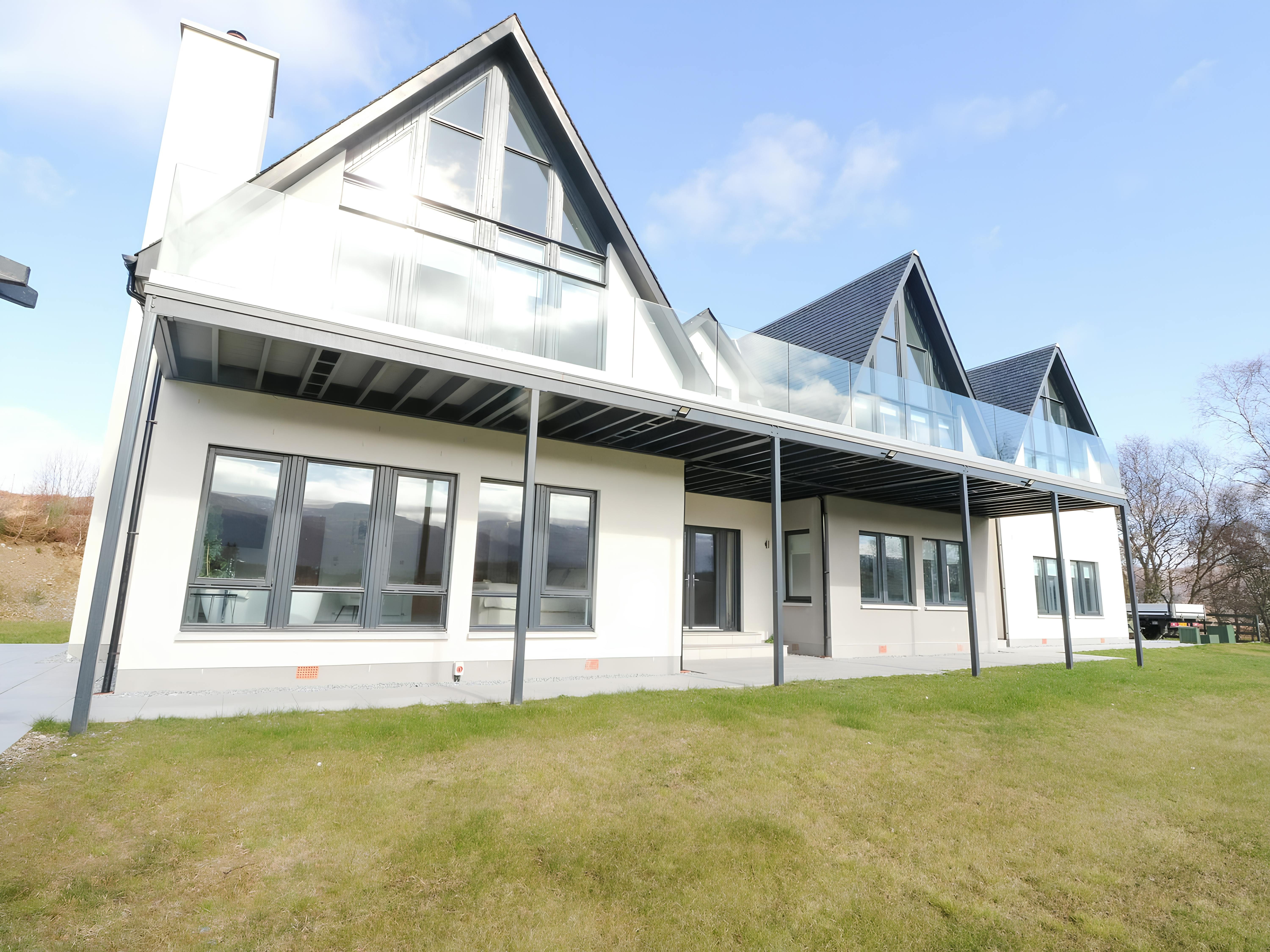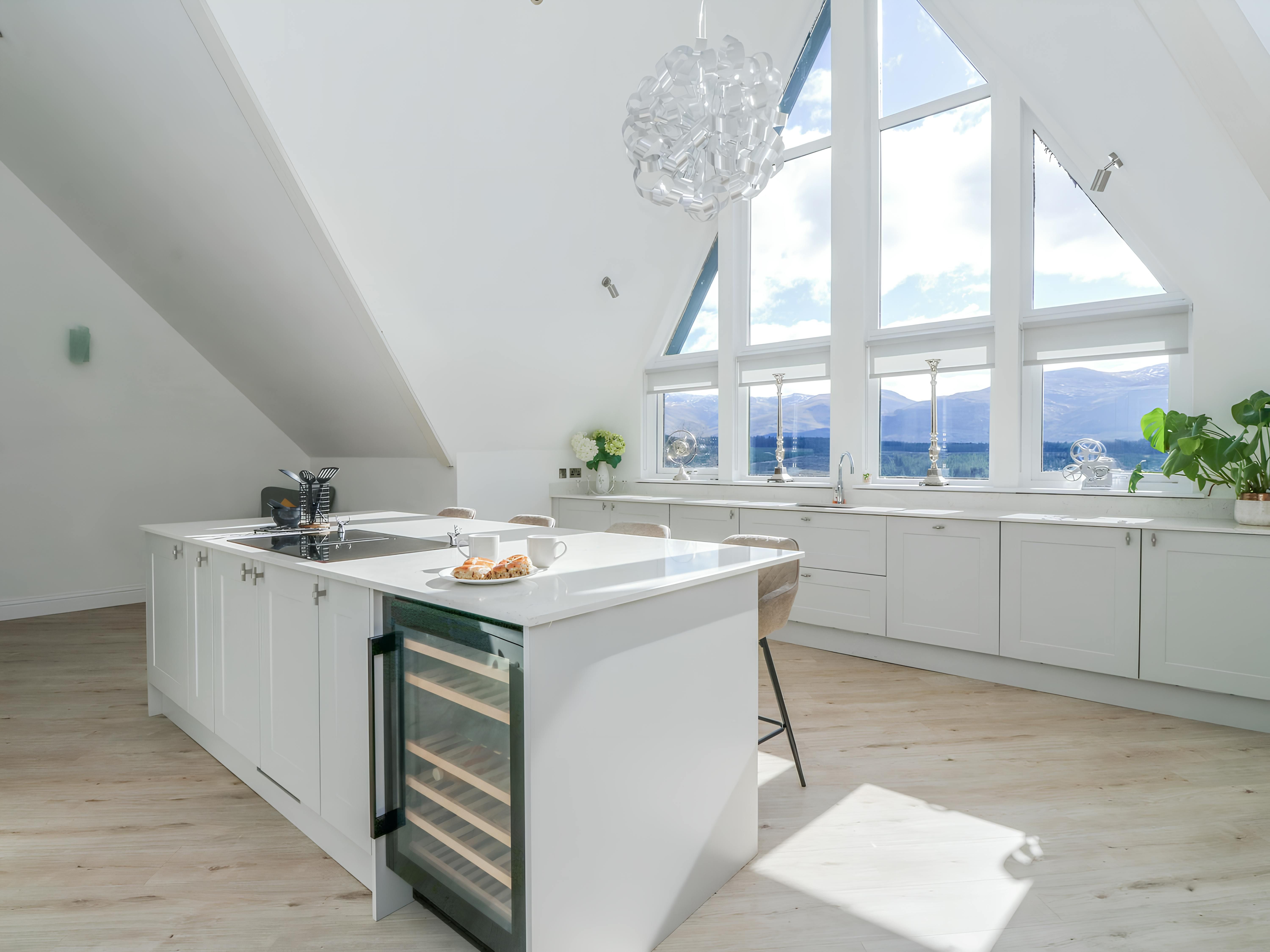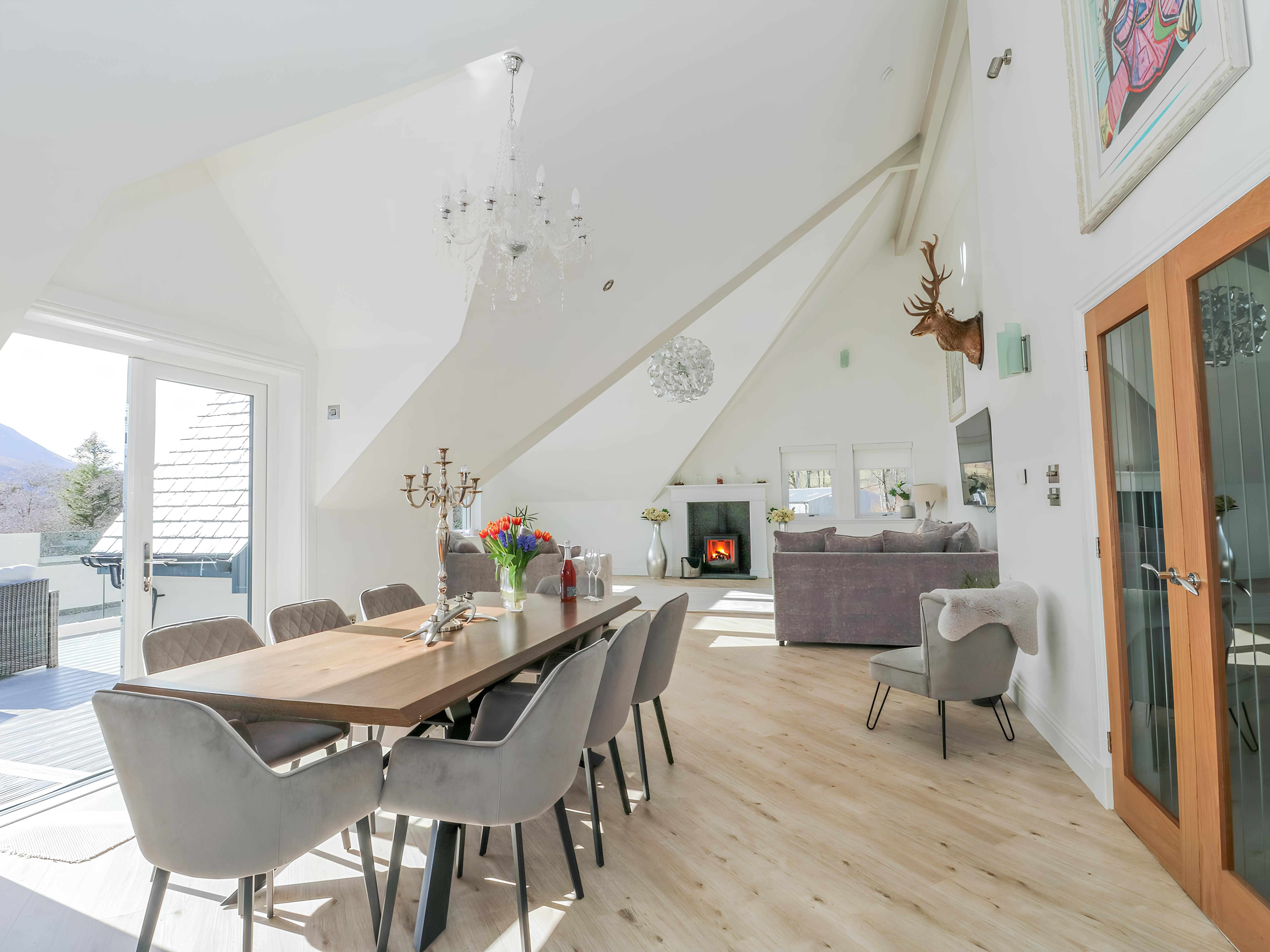 Down the river from Spean Bridge, this expansive ranch offers large groups an excellent base for exploring and admiring the Scottish Highlands. While its modern sensibility may mean some areas feel sparse, there's no shortage of space across the home's reversed levels – the open plan living room, dining area and double-equipped kitchen are found upstairs, with sweeping balcony views. Downstairs you'll find three of five bedrooms (all with en-suite bathrooms, three with super king-size beds, only one with a free standing bath tub) plus access to the rolling rear lawn, which features a large inviting hot tub. If you're planning to scale Ben Nevis, the visitor centre is a fifteen minute drive away, as is the town of Fort William.