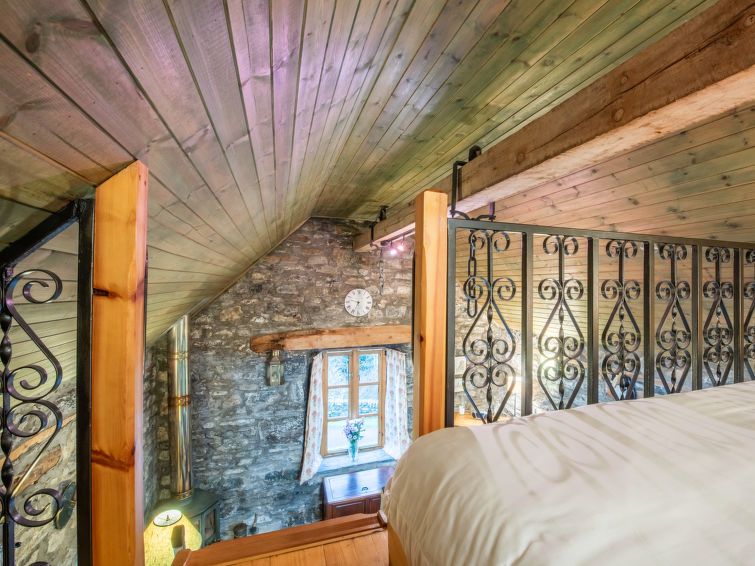 1-room studio on 2 levels. Tasteful and stylish furnishings: living/dining room with dining table, radio and wood-burning stove. Open kitchen (oven, 4 ceramic glass hob hotplates, kettle, microwave, grill). Shower/WC. Upper floor: mezzanine with sloping ceilings with 1 double bed.