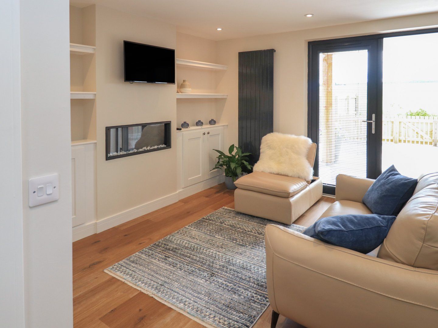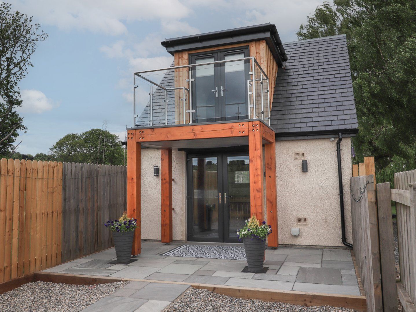 Accomodation Details One double bedroom with balcony and en-suite WC with basin and WC. Ground-floor shower room with walk-in shower, basin, heated towel rail, and WC. Open-plan living space with kitchen, dining area and sitting area with electric fire