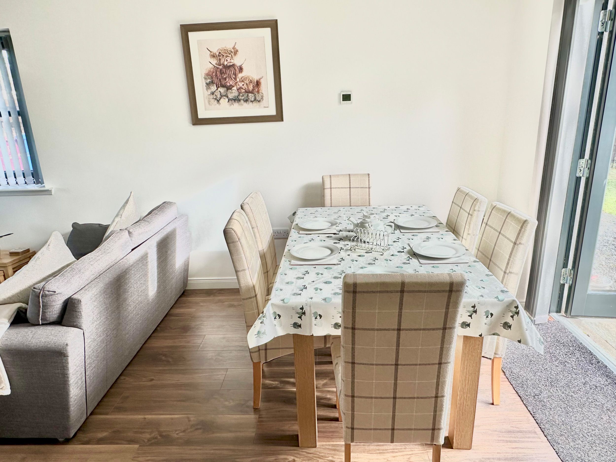 The living areas in this property consist of a kitchen with electric oven and hob, microwave, fridge/freezer, washing machine, and dishwasher, and a living/dining room with Smart TV. The bedrooms consist of a king-size, a twin, and a single, along with a bathroom and a ground-floor shower room. Outside there is a front patio with furniture, a rear garden with lawn, patio, furniture, and a shed, and off-road parking for two cars. You'll find a shop and pub in 0.1 miles, and River Afon in 2 miles. Pets and smoking are not permitted at this property. A travel cot, highchair and stairgate can be requested upon booking. WiFi, fuel, power, bed linen and towels are all included in the price. 5 Birnies Lane is a family-friendly dwelling, set in the countryside of Moray. Note: The garden is not enclosed. Note: If travelling in winter, please plan ahead, as snow is expected in the rural area.