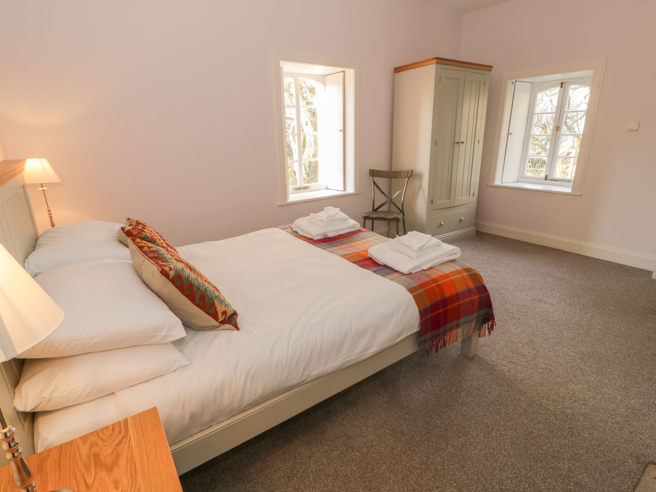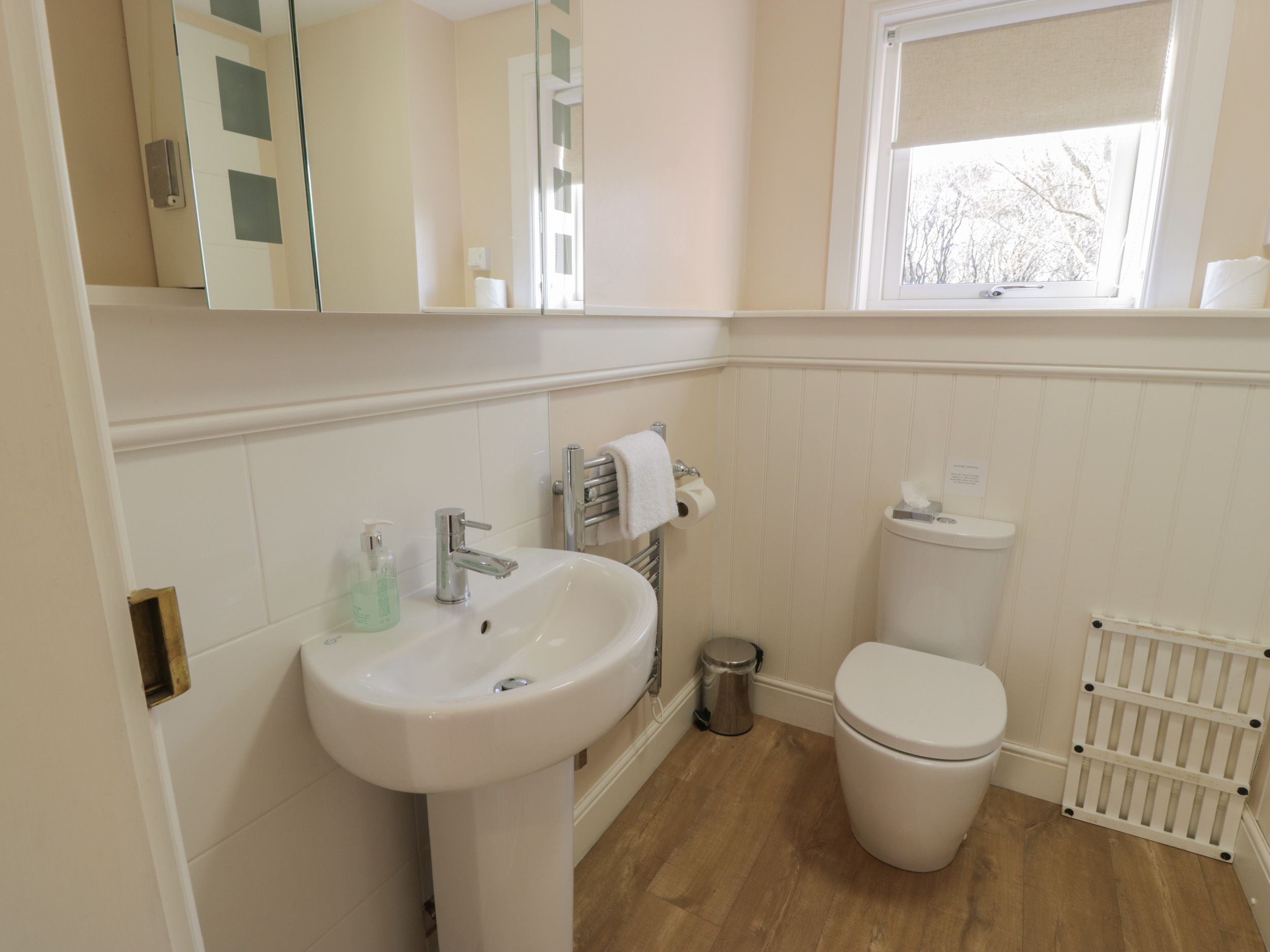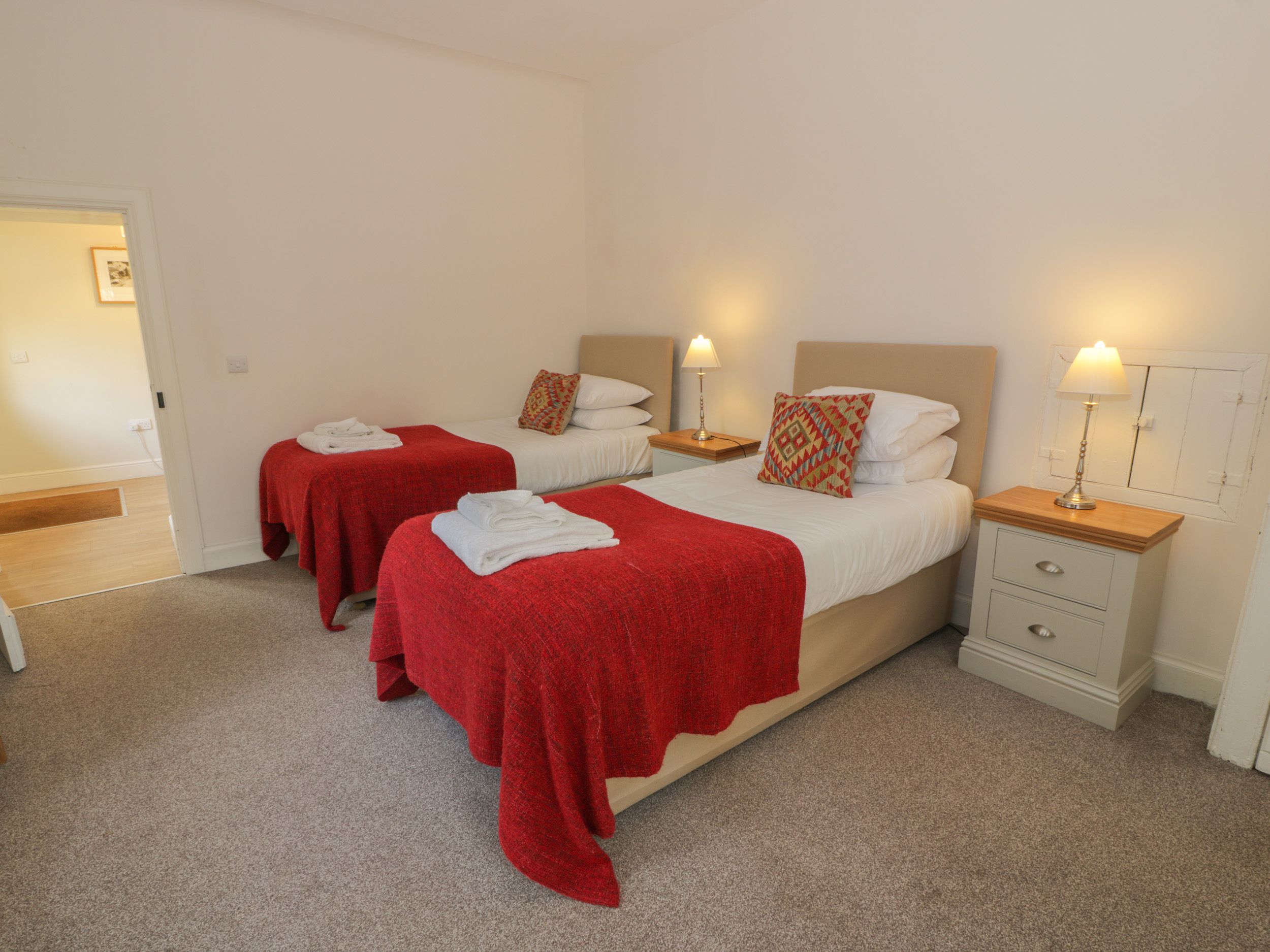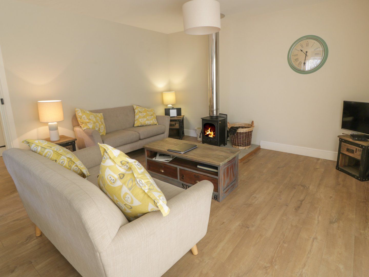 All ground floor. Two bedrooms: 1 x double, 1 x twin (zip/link, can be double on request). Bathroom with bath, shower over, basin, heated towel rail and WC. Open plan living space with kitchen, dining area and sitting area with woodburning stove