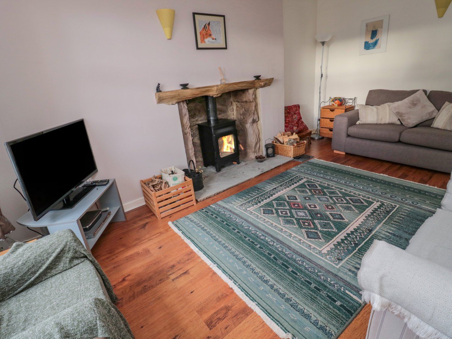 Amenities Electric central heating. Electric oven, induction hob, microwave, fridge/freezer, washing machine, dishwasher. TV, set top box with catch-up TV, Super-Fast Wi-Fi. Fuel, power and starter pack for woodburning stove inc. in rent. Bed linen and towels inc. in rent. Off-road parking in front of the property for 2 cars. Enclosed garden to front and back with lawn, patio and furniture. Sorry, no pets and no smoking. Shop 4.5 miles, pub 1.8 miles. Note: Check-in from 4pm, check-out by 10am. Note: Fairly Steep Stairwell with handrail and small landing - not suitable for children under the age of 5 or those with limited mobility.