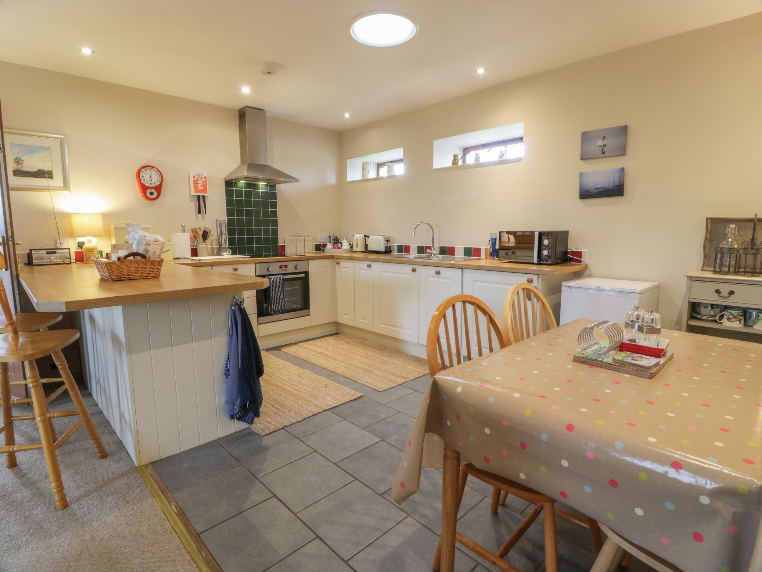 This was one of the best equipped cottages I have been to.. Super hamper left for us and a warm welcome from the owner. Great garden for the dogs and a cosy homely place for us to chill out in. November cold to explore but we did do a bit of exploration and the country side is just amazing, the colours in autumn are spectacular. It was a winner for us.