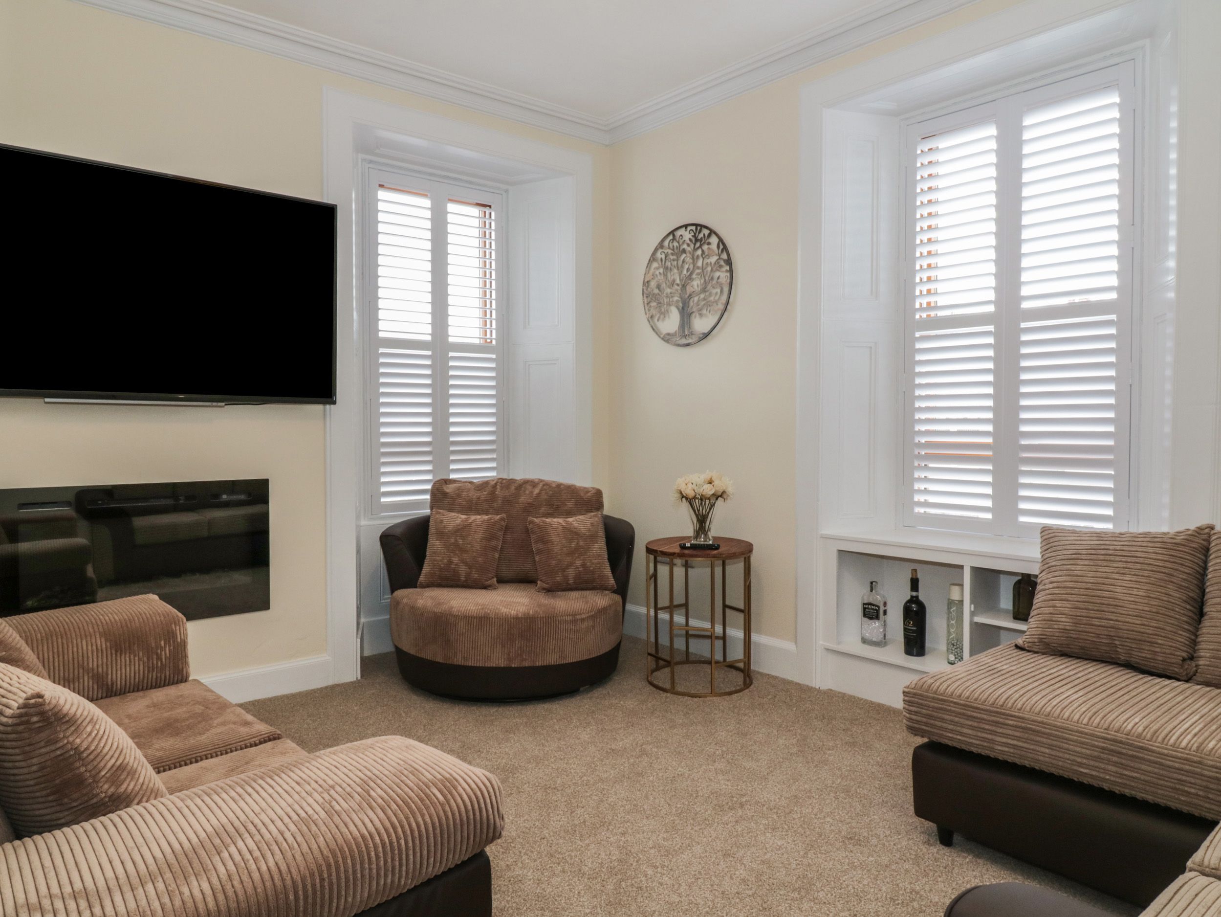 Accomodation Details A stunning duplex apartment in the heart of Jedburgh over second and third floor. Three bedrooms: 1 x third-floor super king-size (zip/link, can be twin on request) with TV, 1 x second-floor king-size with en-suite bath, shower over, basin, heated towel rail, WC, and TV, 1 x second-floor king-size. Second-floor shower room with walk-in shower, basin, and WC. Second-floor kitchen/diner. Second-floor external utility room with washing machine and freezer. Second-floor sitting room with 65" TV and electric fire. Second-floor snug room. Enclosed rear garden with gravel