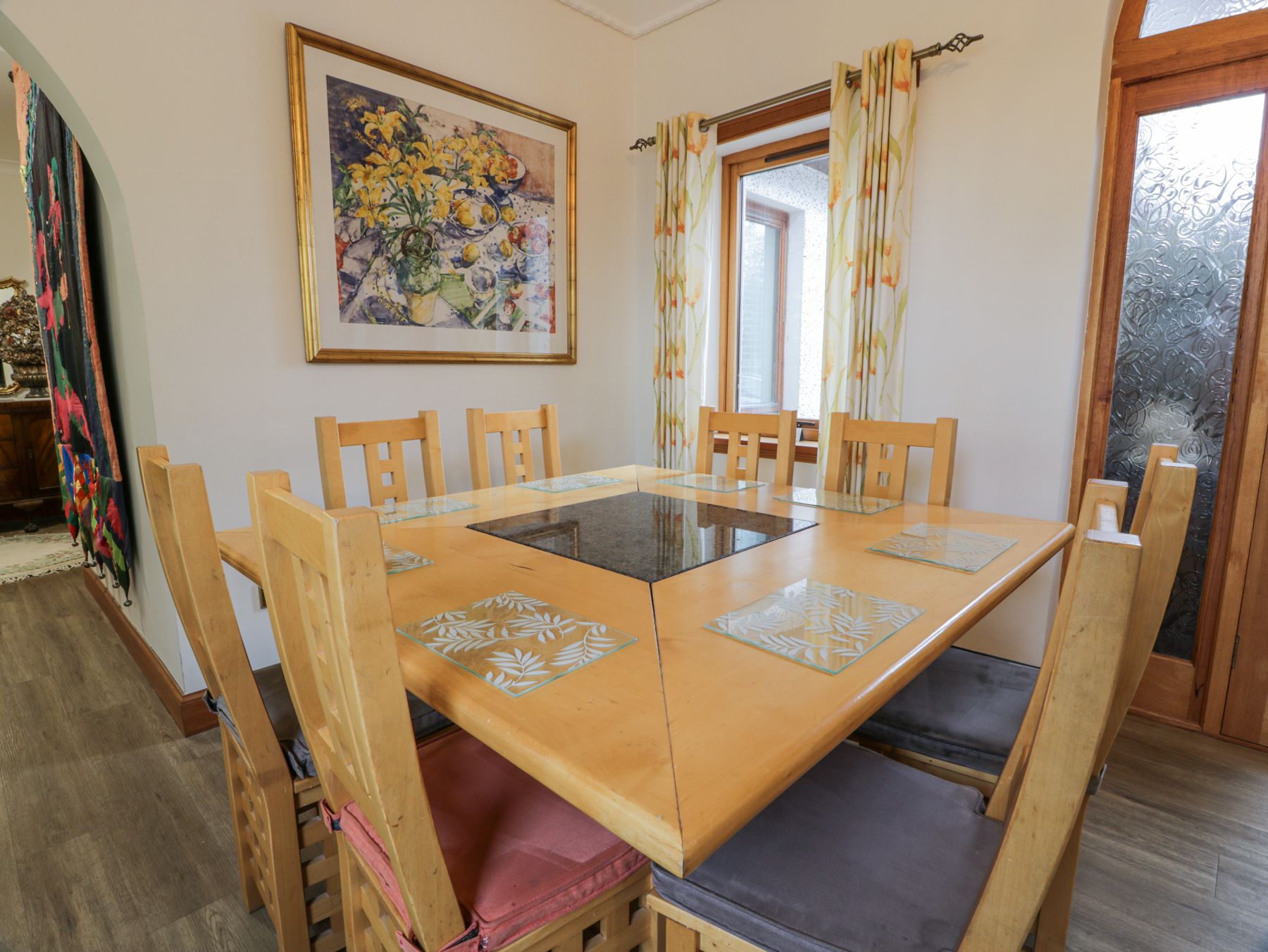Accomodation Details All ground-floor. Six bedrooms: 1 x king-size with TV and en-suite bath, shower over, basin and WC, 1 x king-size with TV, 2 x king-size with TV and en-suite shower, basin and WC, 1 x twin with TV and en-suite shower, basin, heated towel rail and WC, 1 x twin with TV. Bathroom with bath, shower over, basin, heated rail and WC. Shower room with walk-in shower, basin and WC. Open plan Kitchen/Dining room. Spacious Sitting room with open fire and TV