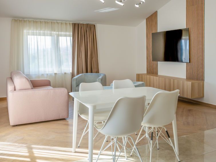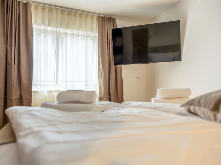 2-room apartment 80 m2 on 3rd floor. Comfortable furnishings: living/dining room with 1 double sofabed (160 cm, length 190 cm), satellite TV (flat screen), air conditioning. 1 room with 1 double bed (2 x 90 cm, length 200 cm), satellite TV (flat screen), air conditioning. Open kitchen (4 ceramic glass hob hotplates, electric coffee machine).