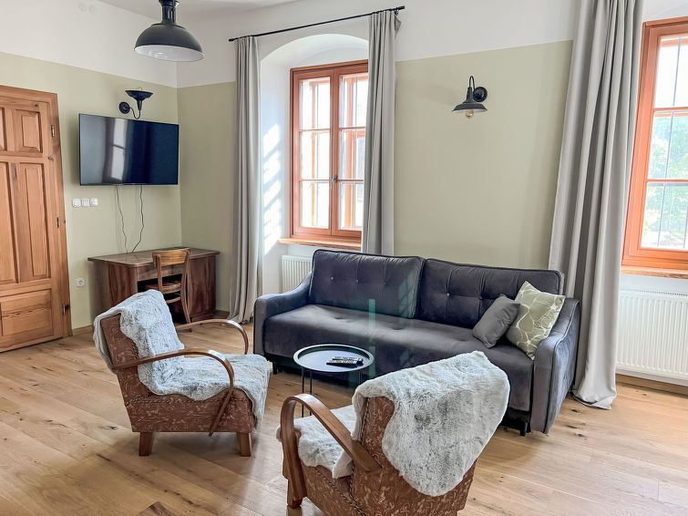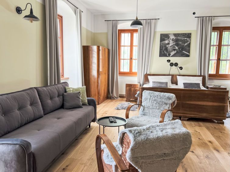 "Standard", 1-room apartment 47 m2. Practical and comfortable furnishings: 1 room with 1 sofabed (140 cm, length 200 cm), 1 double bed (180 cm, length 200 cm), kitchen corner and cable TV. Kitchenette (1 induction hot plates, 2 gas rings) with dining table. Shower/WC. Heating, electric heating, gas heating.