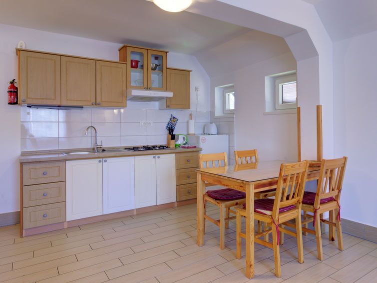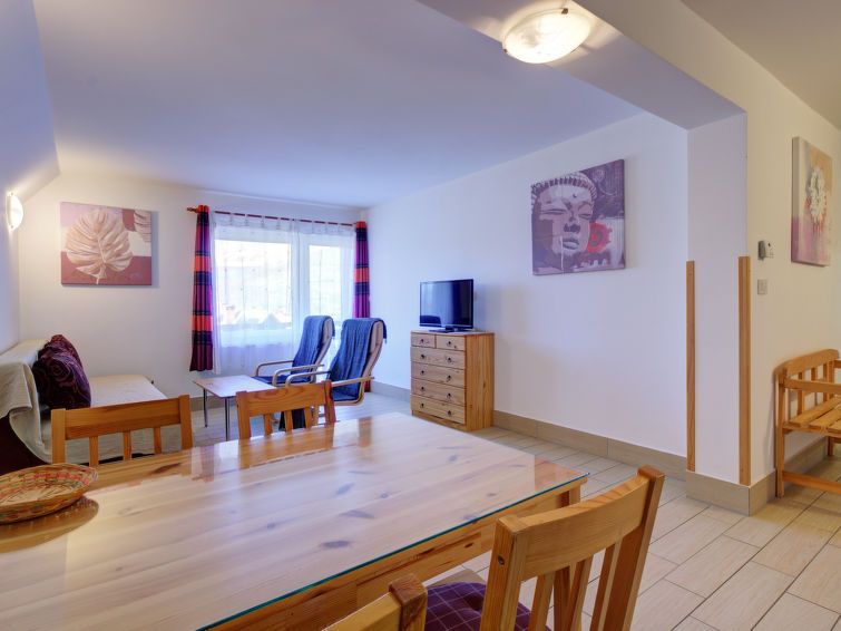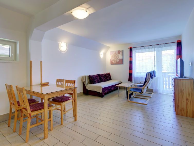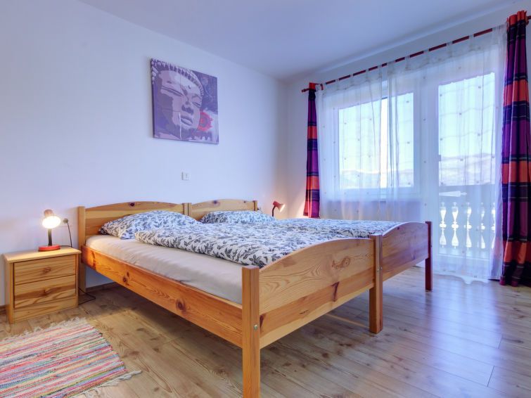 "Bogatin", 3-room apartment 51 m2 on 1st floor. Simple furnishings: living/dining room with satellite TV (flat screen). Exit to the balcony. 1 room with 1 double bed. 1 room with 1 double bed. Kitchen-/living room (4 hot plates) with dining table. Shower/WC. Electric heating, oil heating.