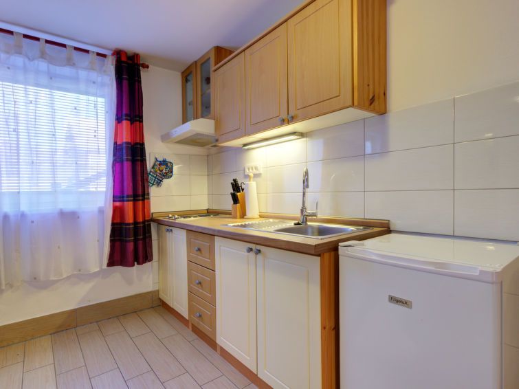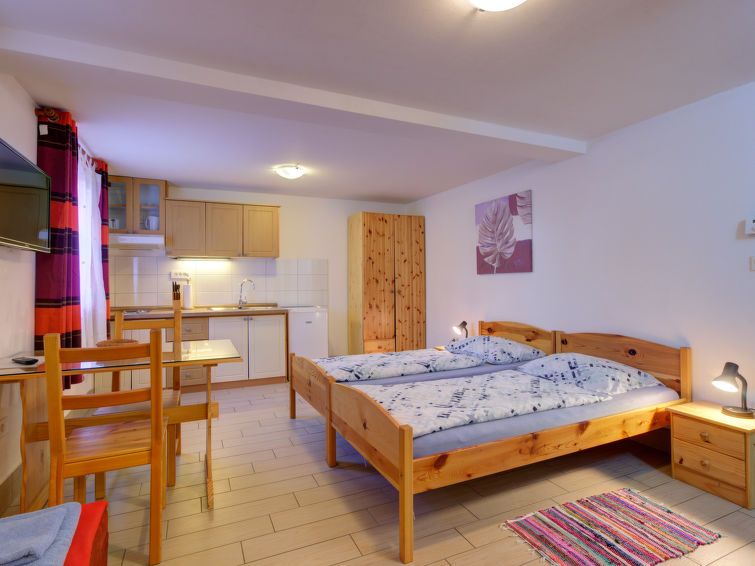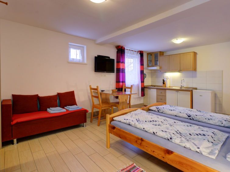 "Apartment Rodica", 1-room apartment 24 m2, on the ground floor. Simple furnishings: living/sleeping room with 1 double bed and satellite TV (flat screen). Kitchen-/living room (2 hot plates) with dining table. Shower/WC. Electric heating, oil heating. View of the mountains and the countryside.