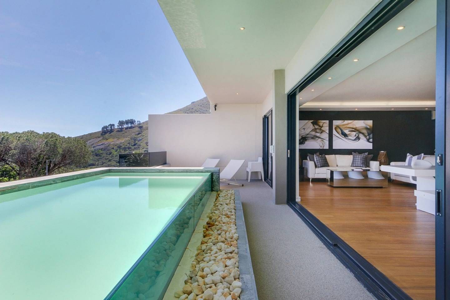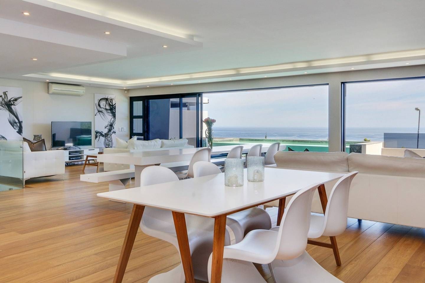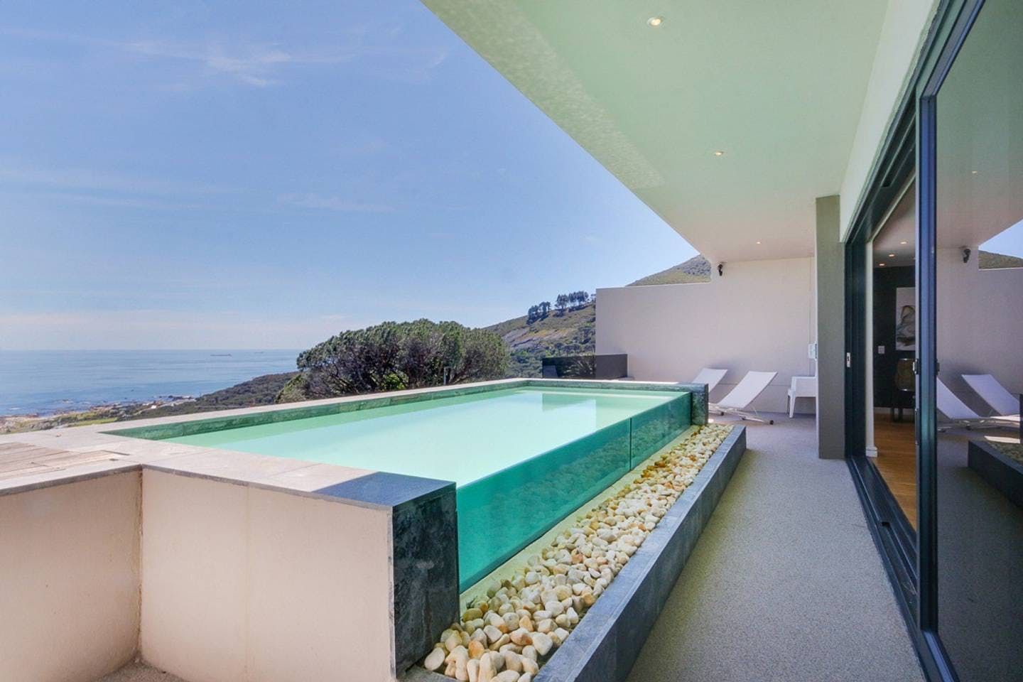 Step inside this exquisite villa in Camps Bay. Its contemporary design and excellent natural lighting combine to highlight both the stunning interior and the amazing vistas that surround the home. In the morning, make an iced coffee and go through the sliding doors, absorbing the ocean views, before plunging into the cooling pool. We adore the open plan living area that gives an airy space for everyone to relax and entertain, or head downstairs to the cinema room, remembering to bring along the popcorn.