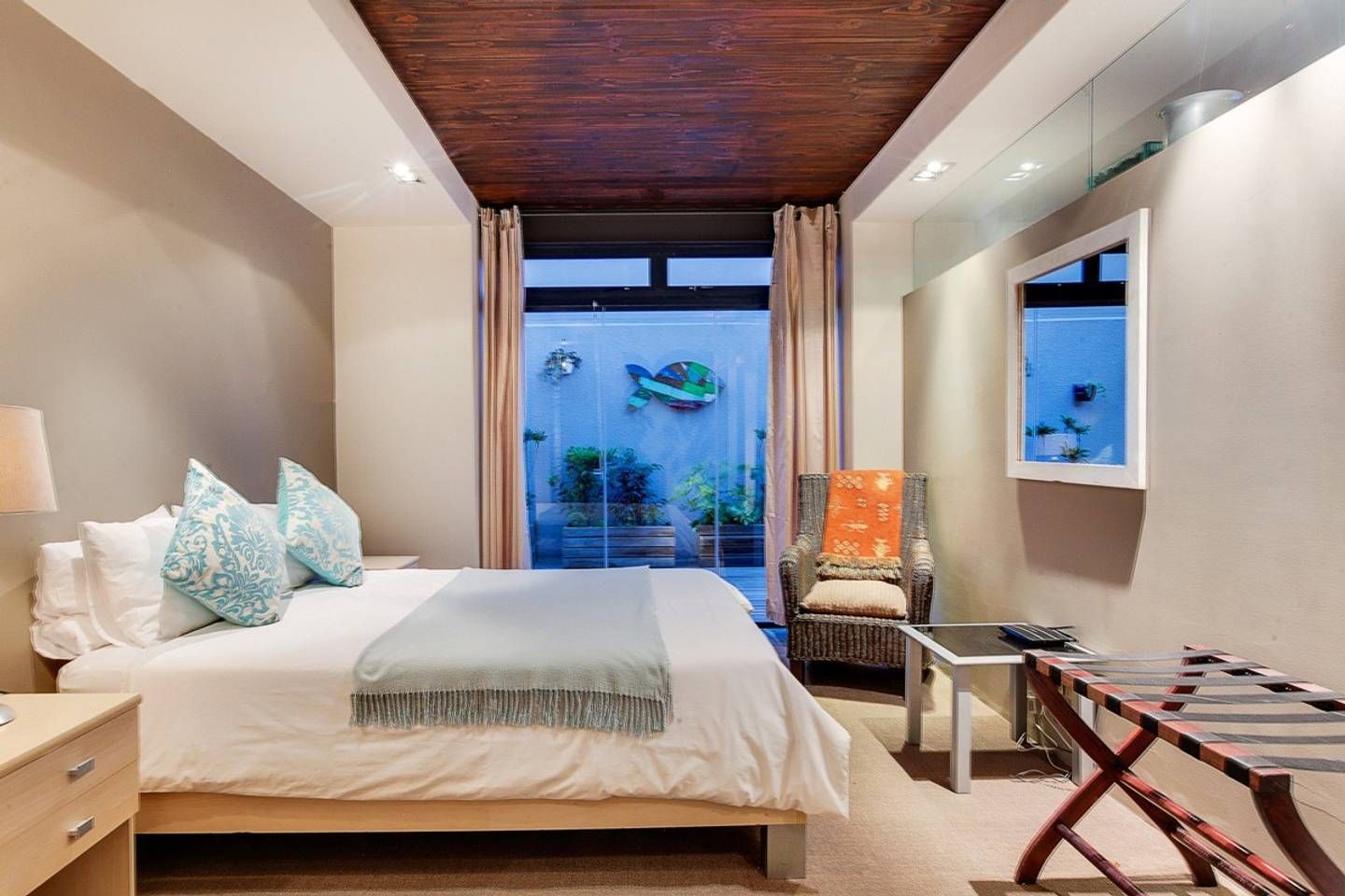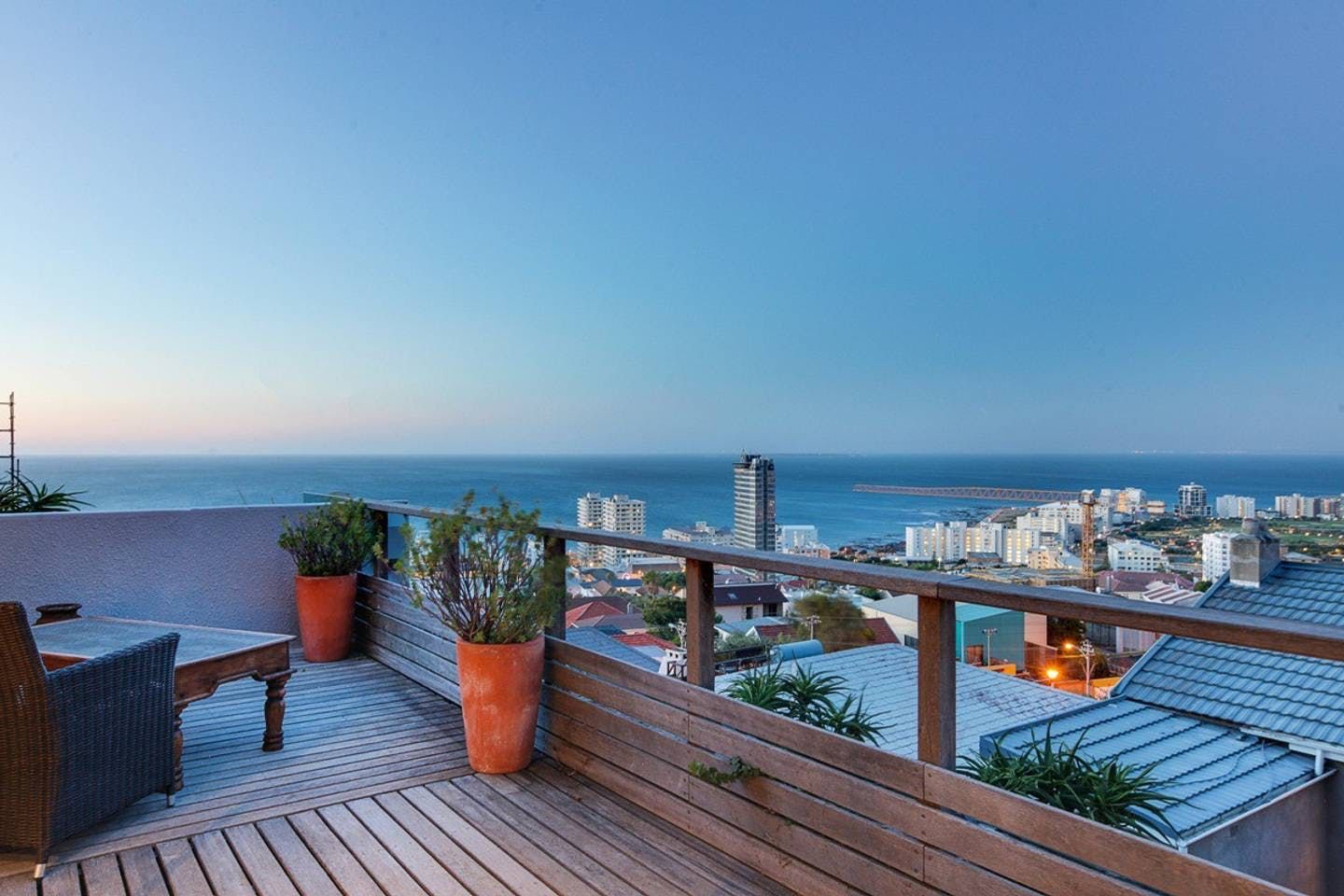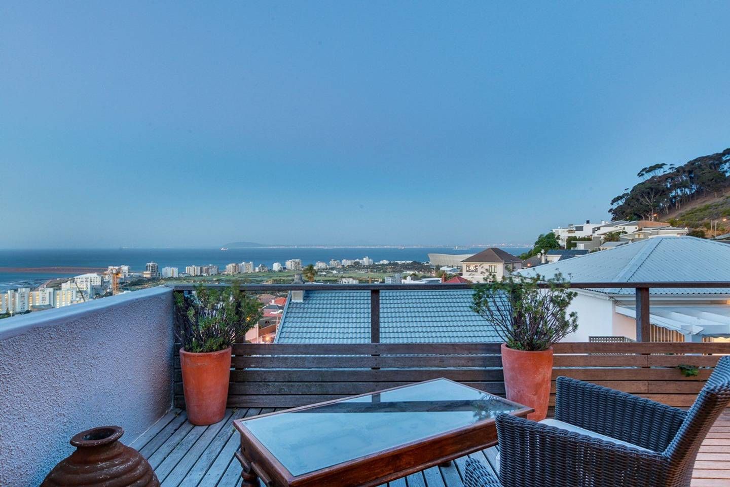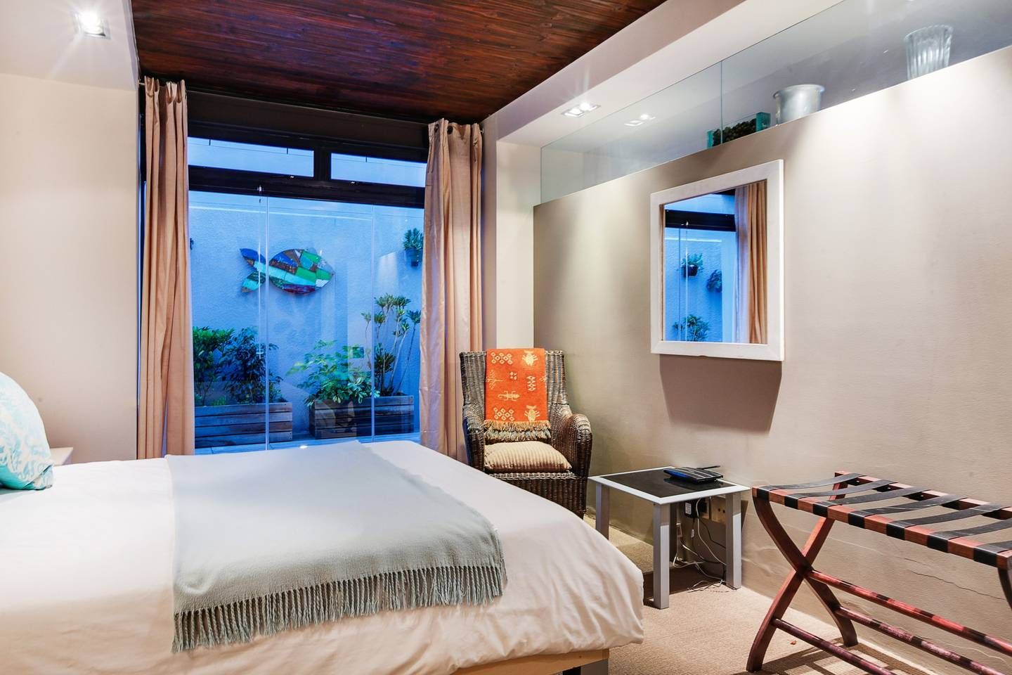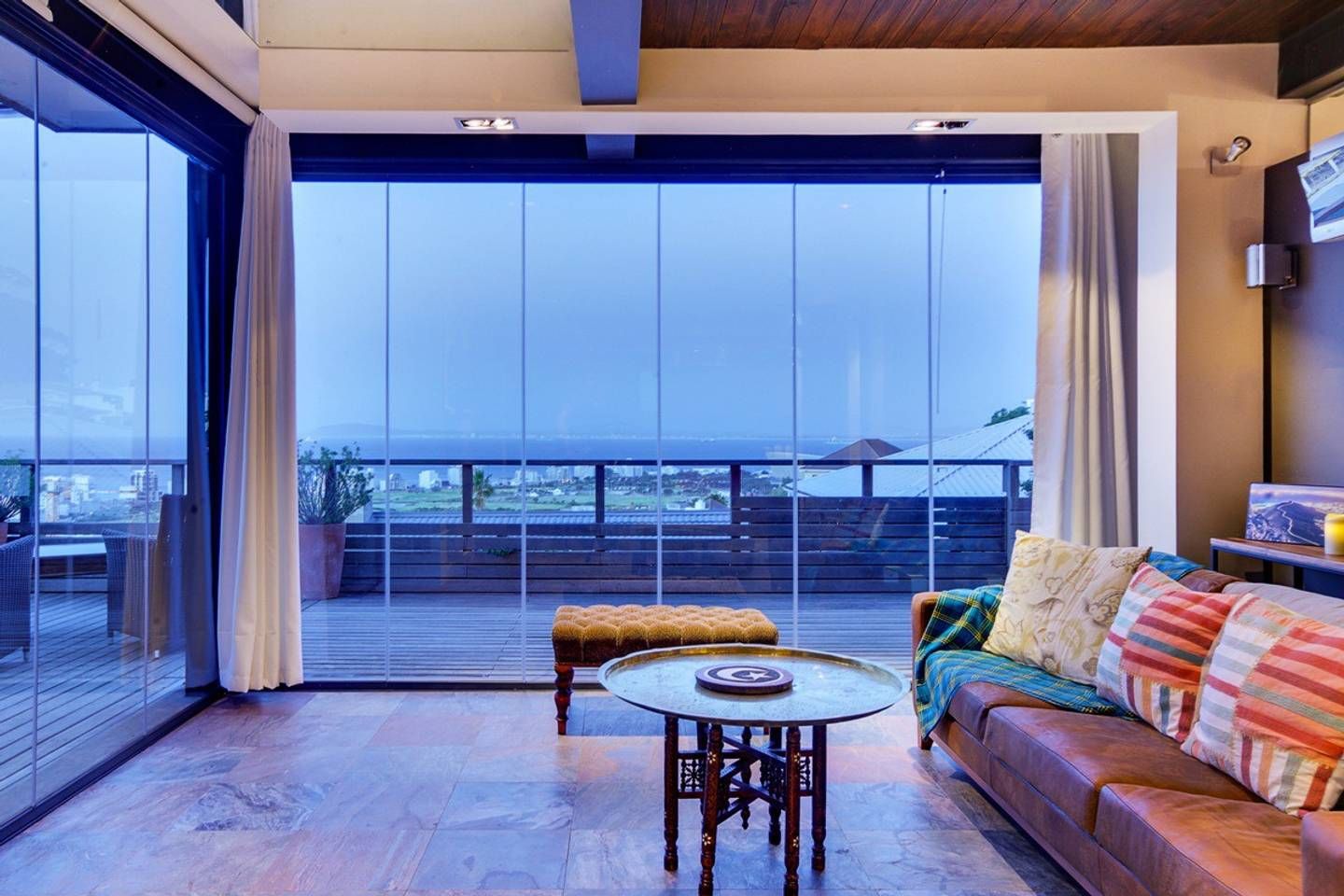 This stunning, contemporary apartment, nestled against the base of Signal Hill, enjoys panoramic city and ocean views – open up the foldaway glass doors onto the balcony and watch the waves move along the ocean, as well as the endless sights to see with your morning coffee. Back inside, we love how the floor-to-ceiling doors let in light while you use the kitchen to prepare lunch to enjoy outside on the dining table shadowed by ancient artwork. What's more, both bedrooms have direct access to either a courtyard or a balcony, making the rooms feel larger.