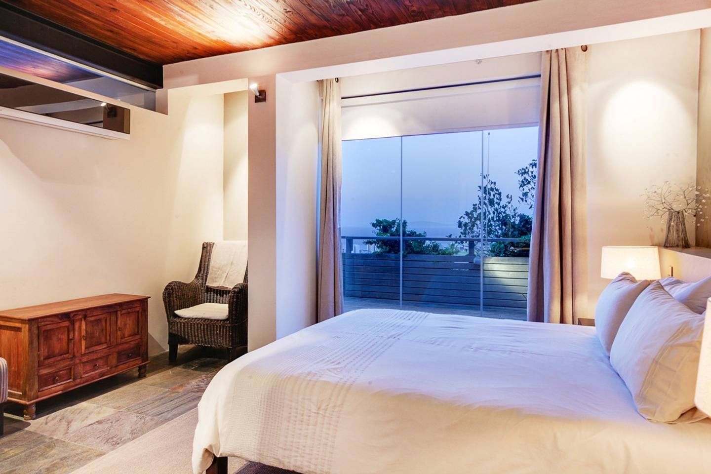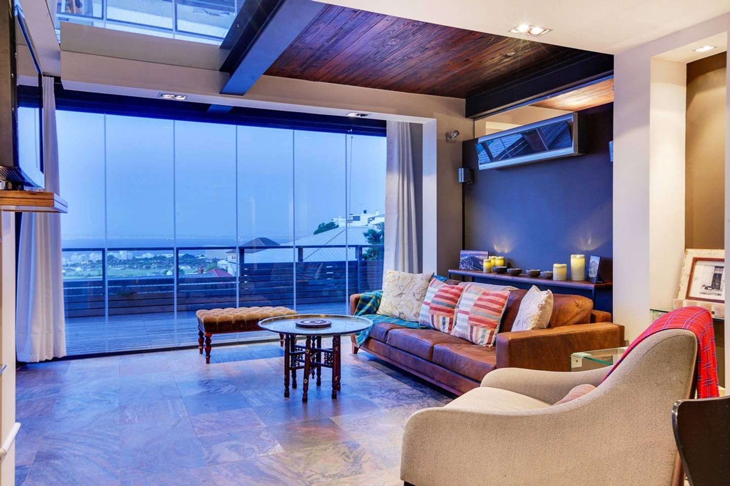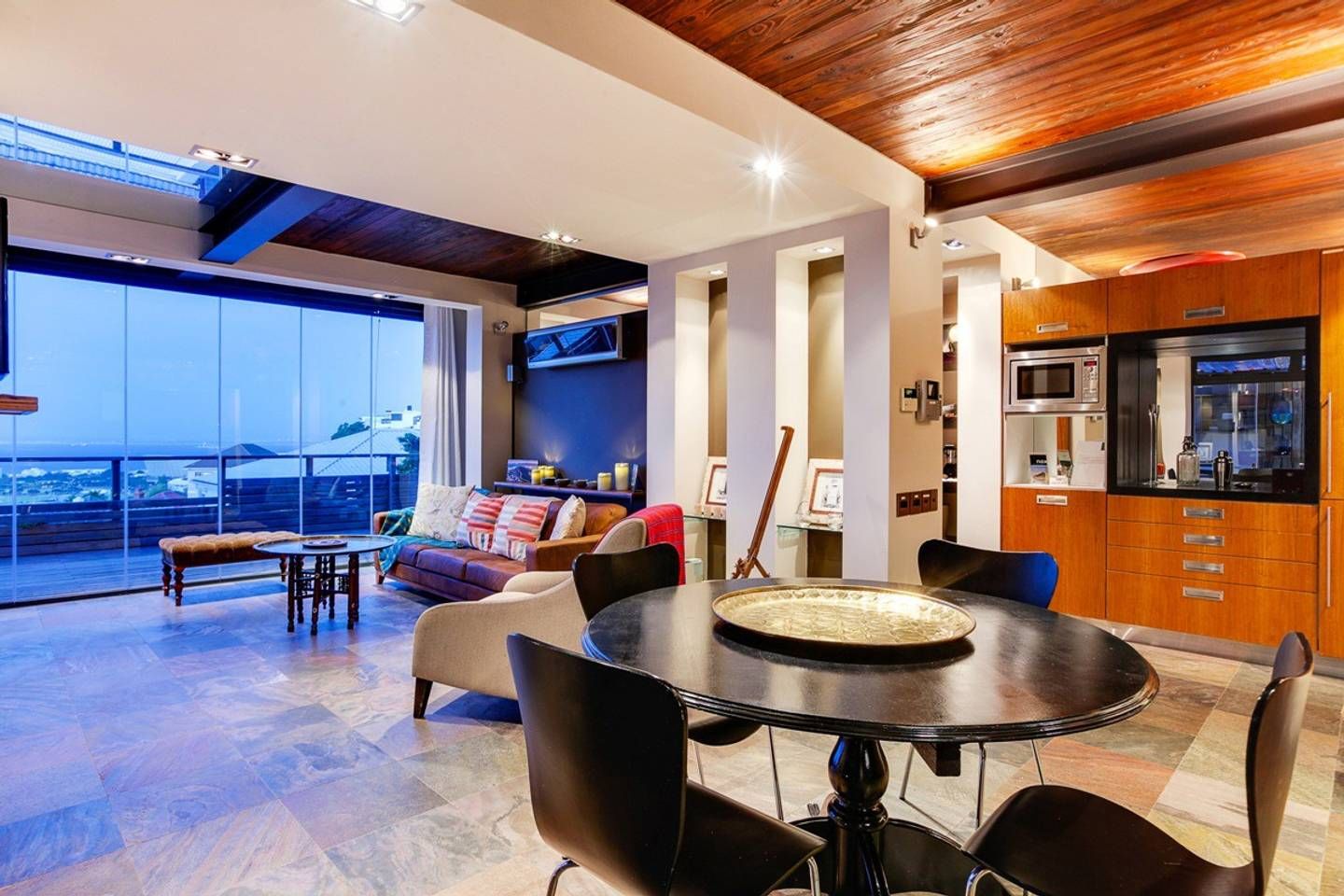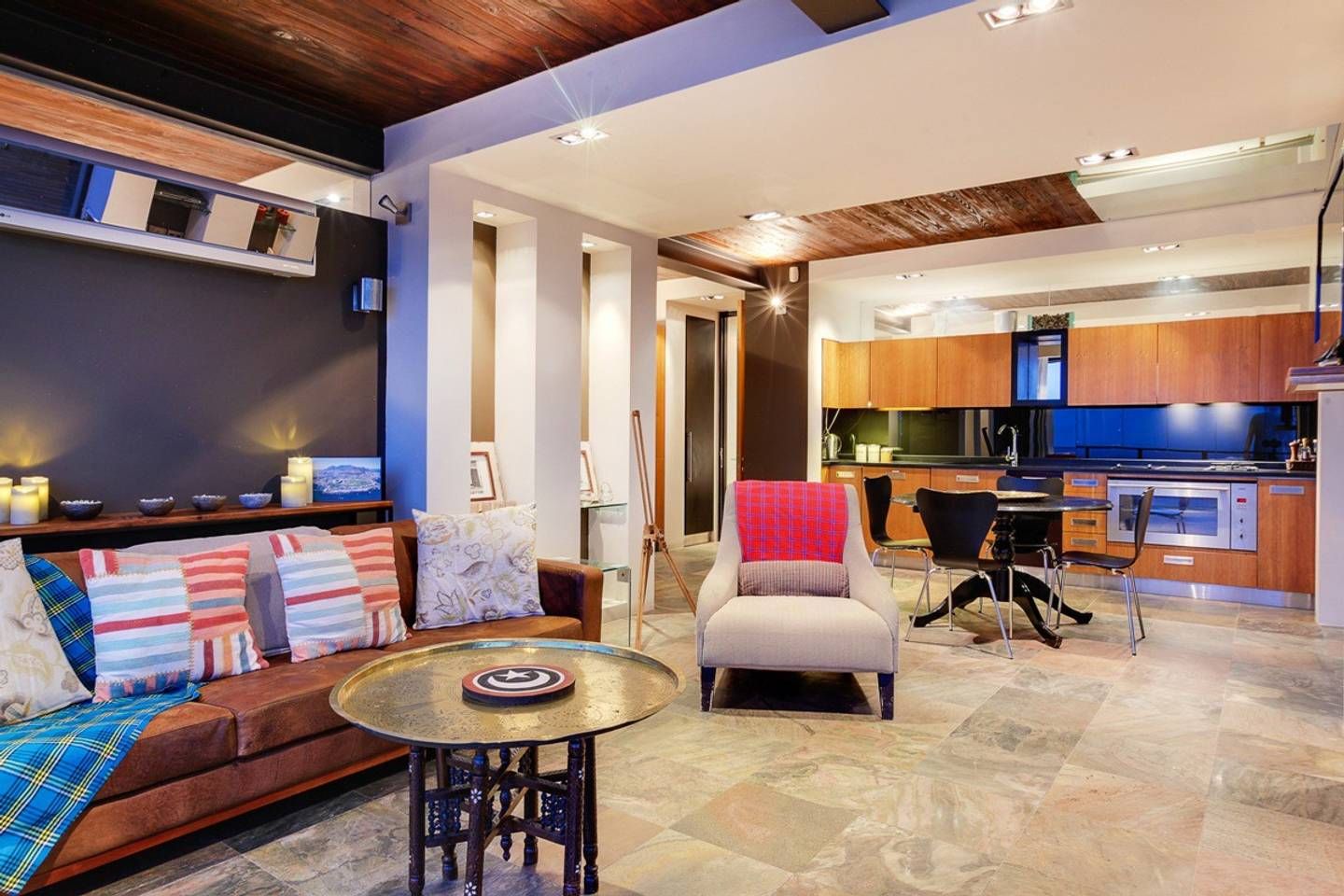 This stunning, contemporary apartment, nestled against the base of Signal Hill, enjoys panoramic city and ocean views – open up the foldaway glass doors onto the balcony and watch the waves move along the ocean, as well as the endless sights to see with your morning coffee. Back inside, we love how the floor-to-ceiling doors let in light while you use the kitchen to prepare lunch to enjoy outside on the dining table shadowed by ancient artwork. What's more, both bedrooms have direct access to either a courtyard or a balcony, making the rooms feel larger.